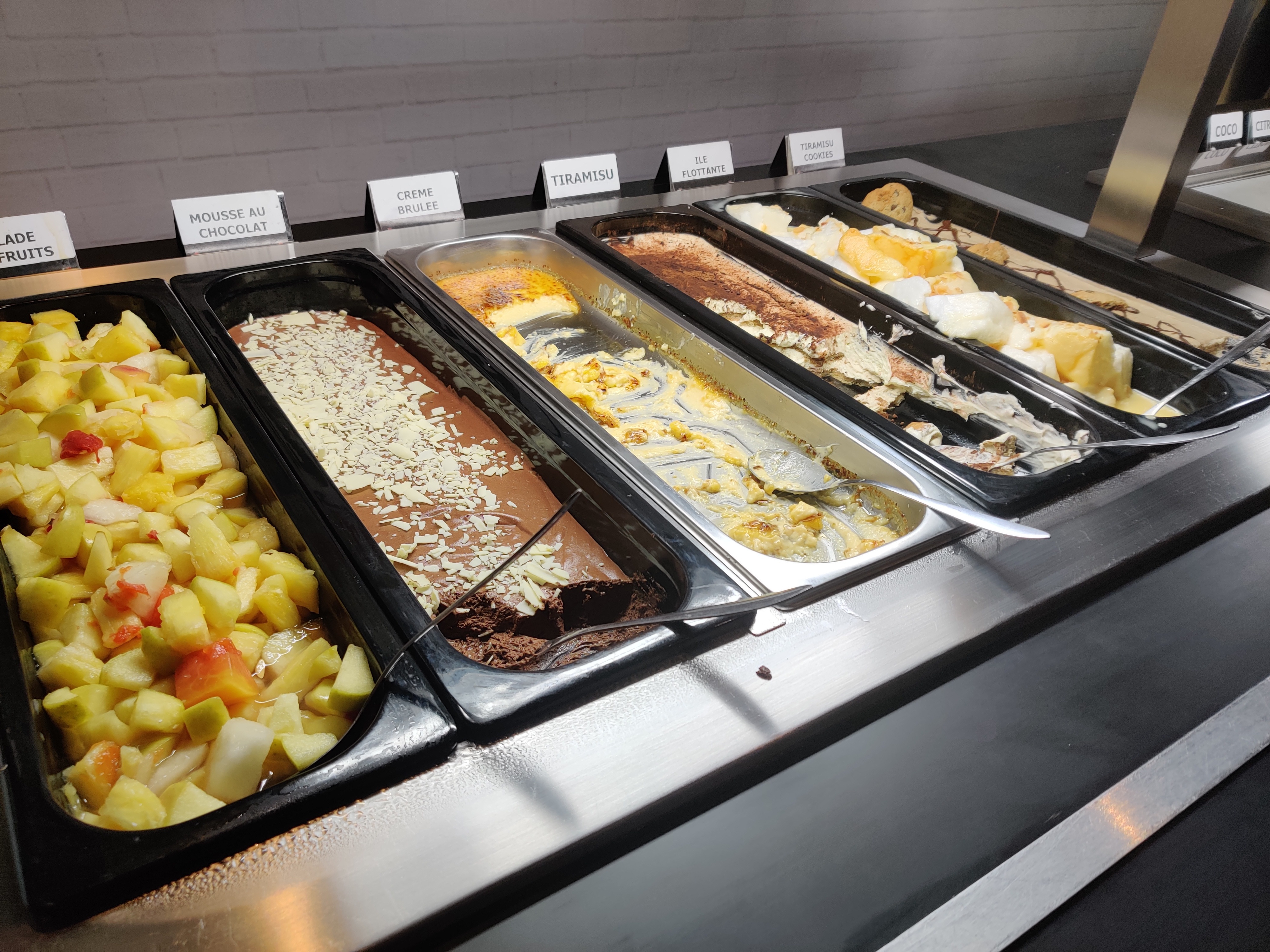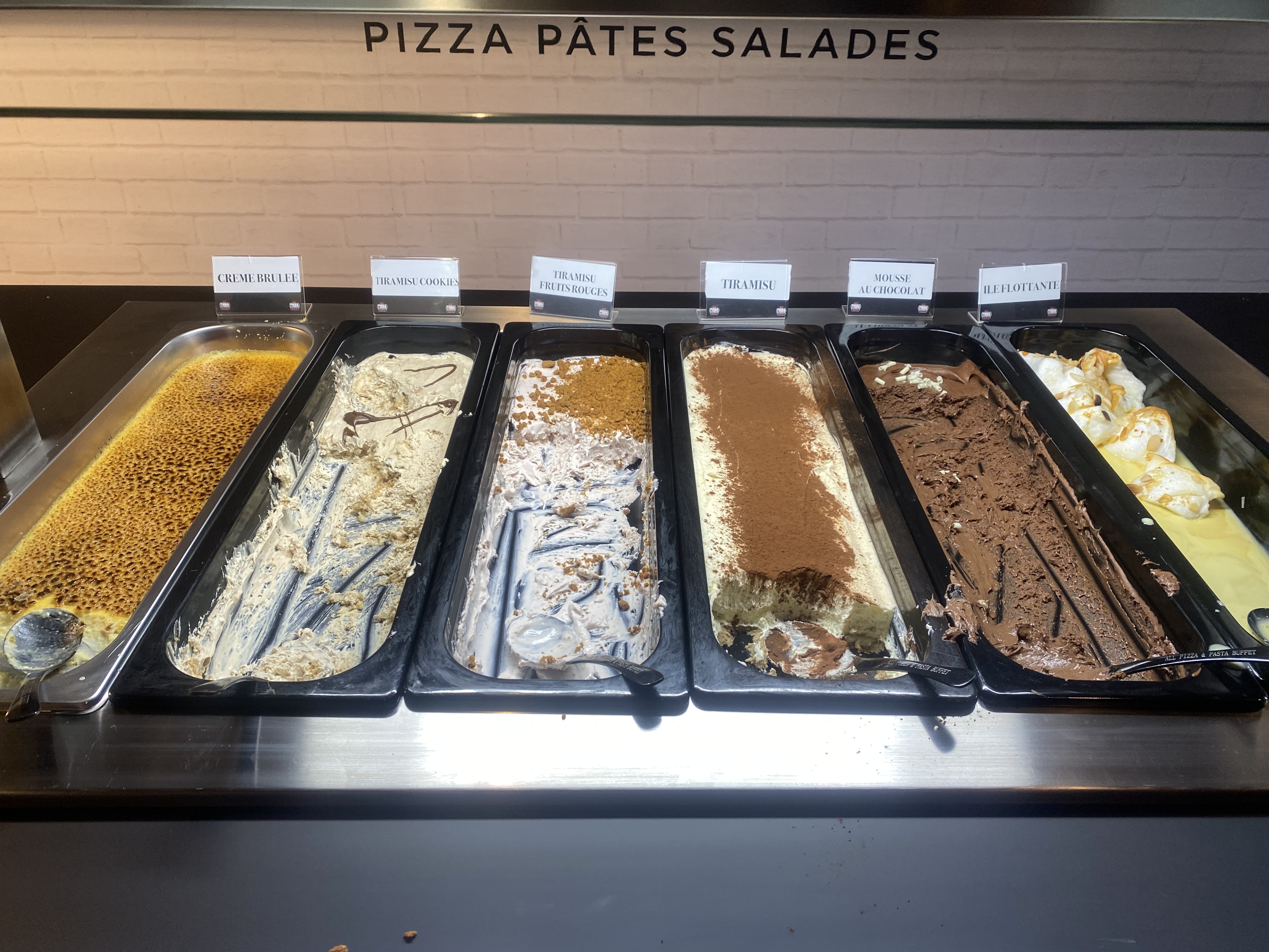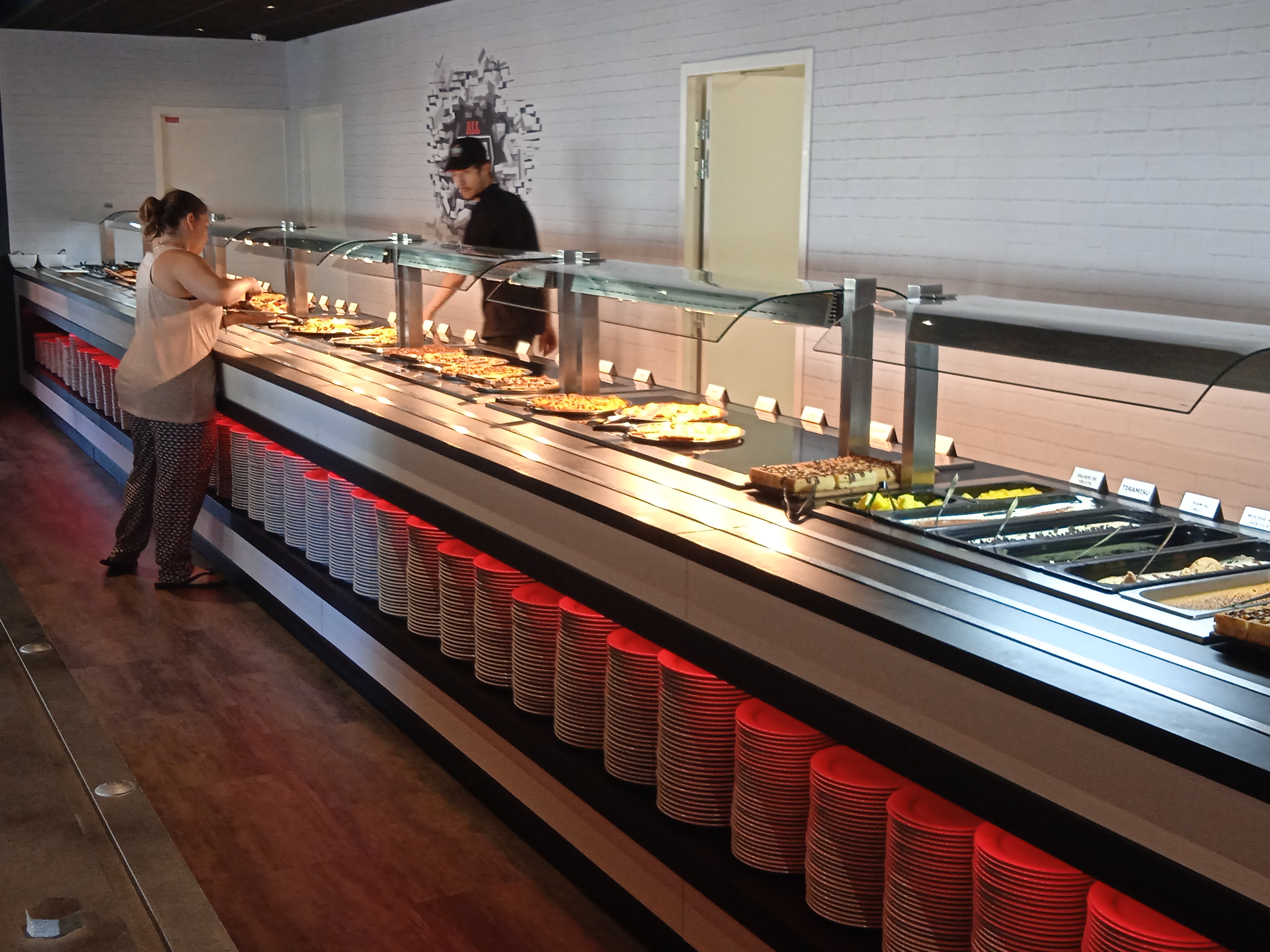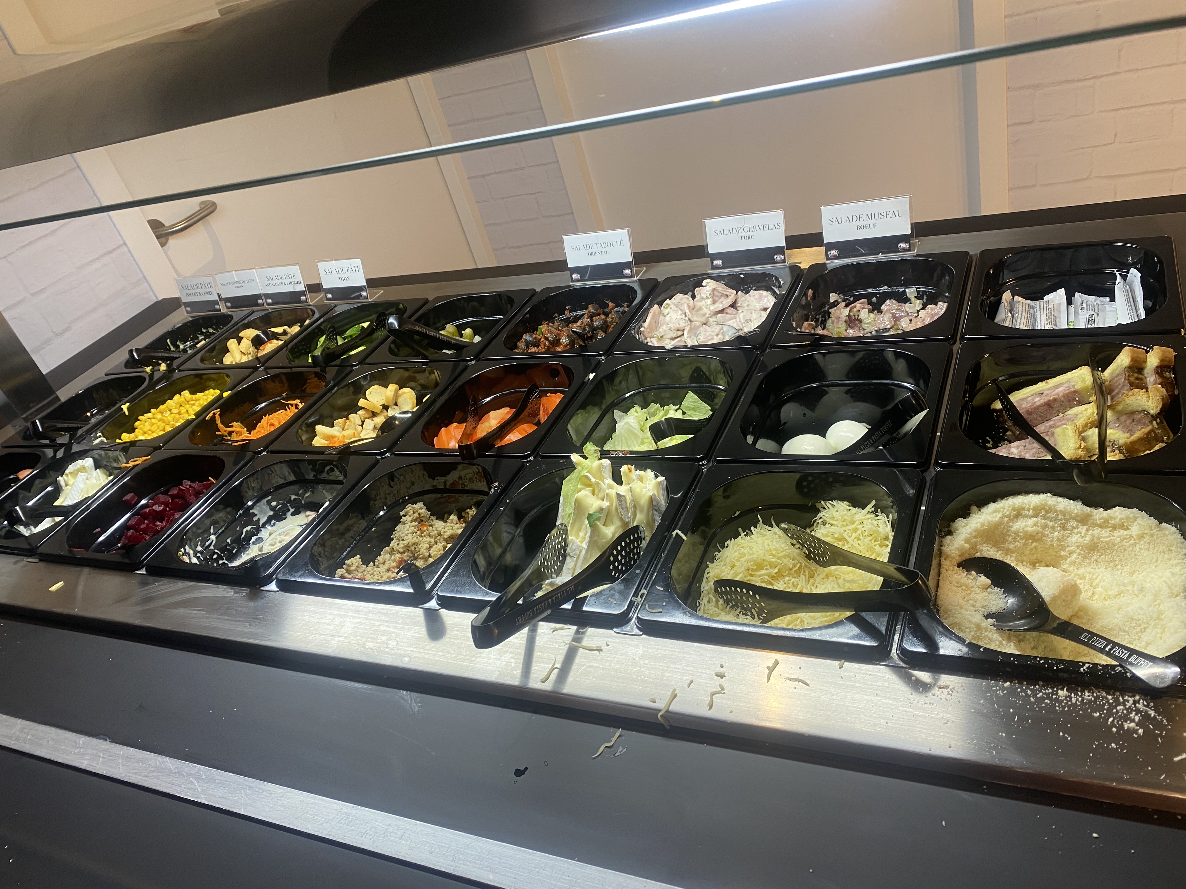 Une étoile pour les employés qui font de leur mieux. Pour le reste nous avons été très déçus, le concept était intéressant mais la qualité n’était pas là : une impression d’être retournés à la cantine scolaire pour les salades, les pâtes et les pizzas étaient très grasses et du coup écœurantes, et les desserts n’ont malheureusement pas été à notre gout non plus. Certes moins cher que les autres buffets, mais au final moins bon rapport qualité/prix.