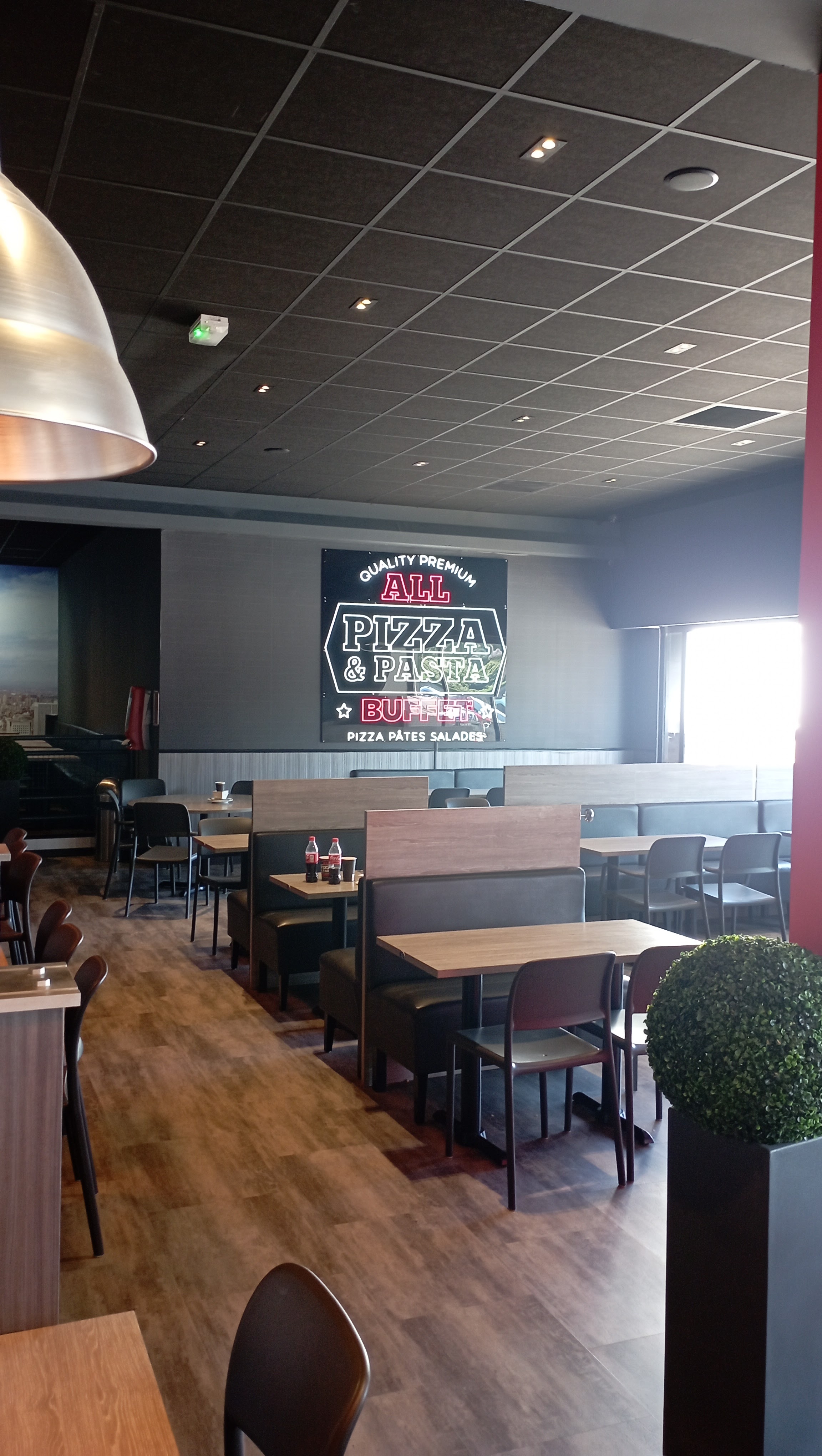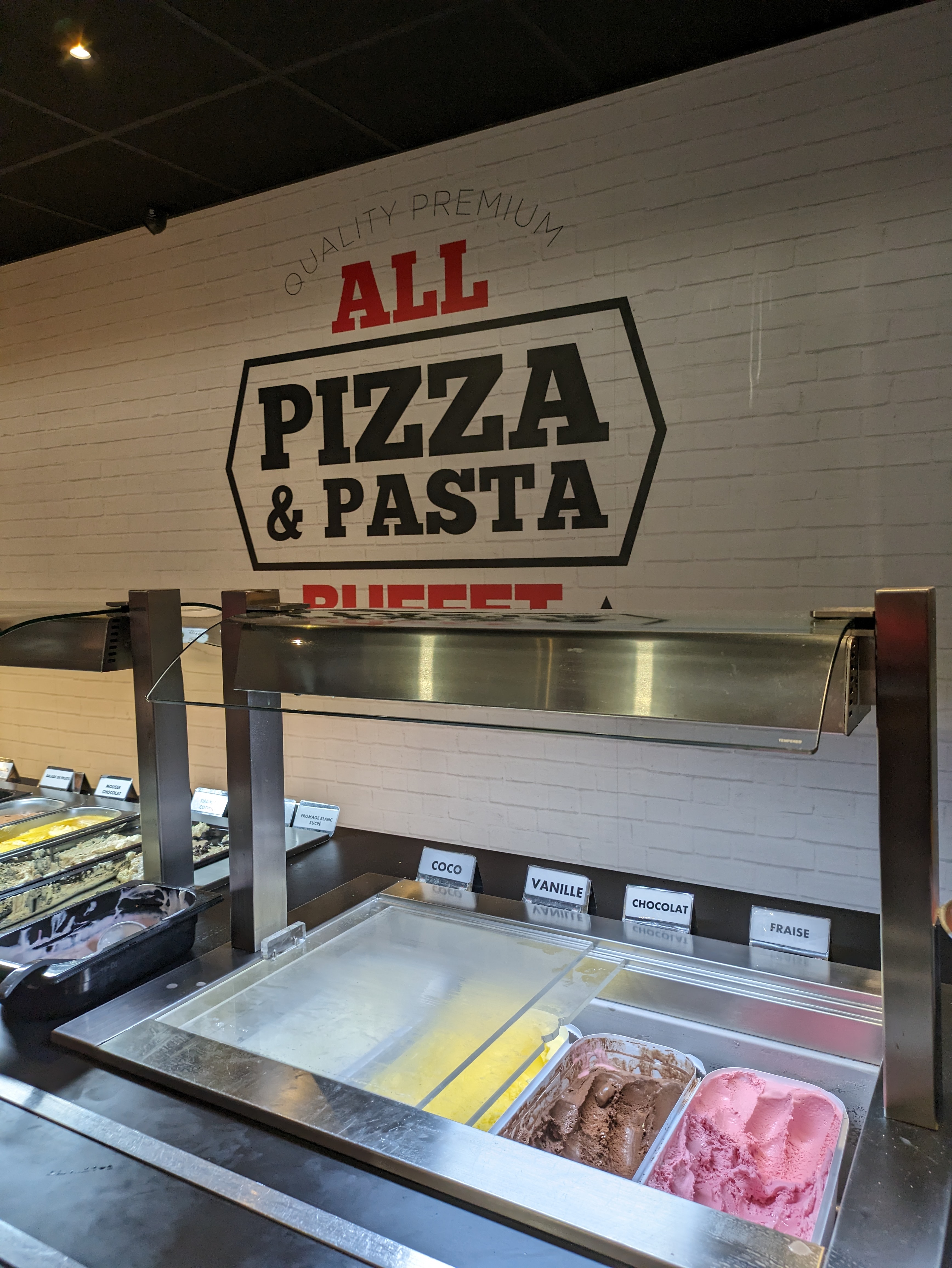 J'aime bien ce concept de restauration rapide à volonté, une fois tout payé en amont en caisse. Le personnel est accueillant, présent mais aussi discret. Énorme choix de pizzas avec une pâte légère & assortiments de pastas pour tous les goûts. Bâtiment climatisé, spacieux & bien ambiancé. Néanmoins le prix du menu à volonté reste cher pour les petits appétits comme celui des enfants qui est finalement au même prix que celui des adultes & on ne s'y retrouve pas forcément au niveau du paiement...
