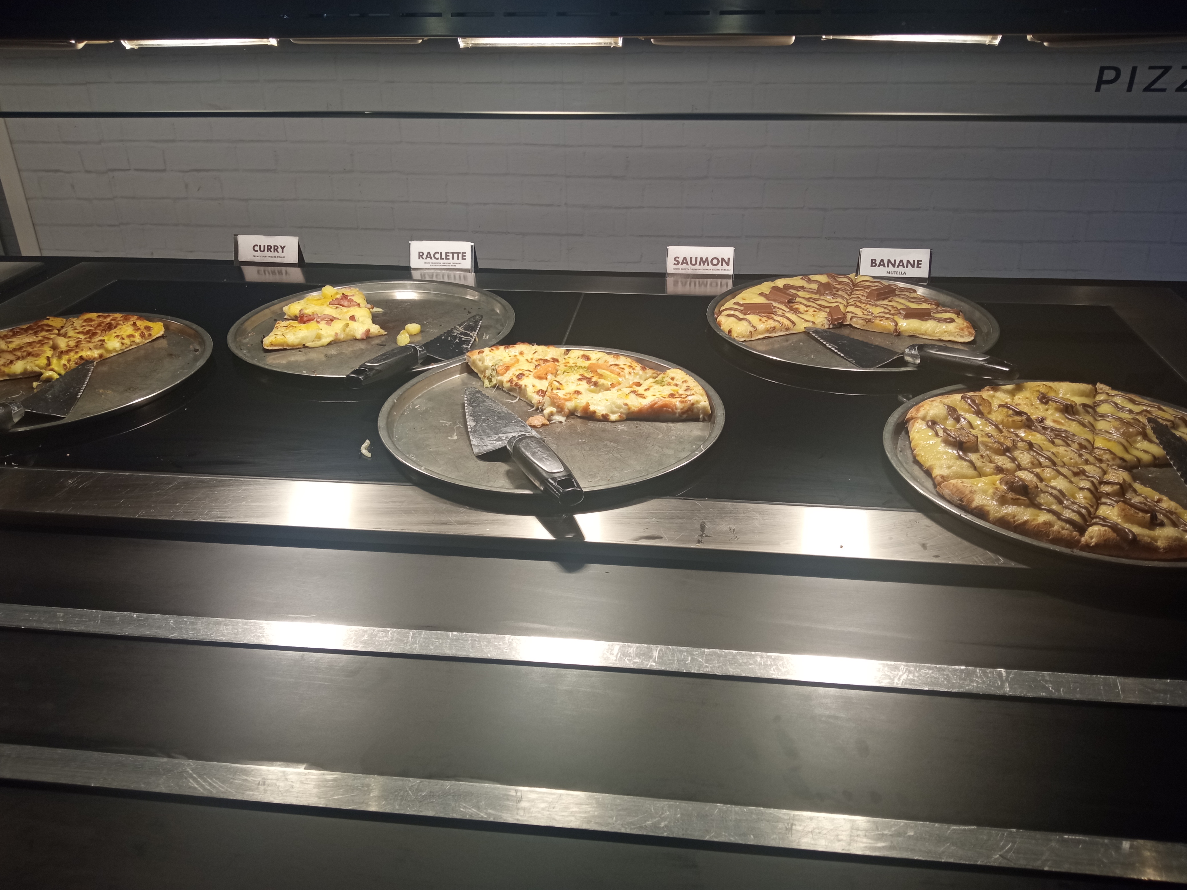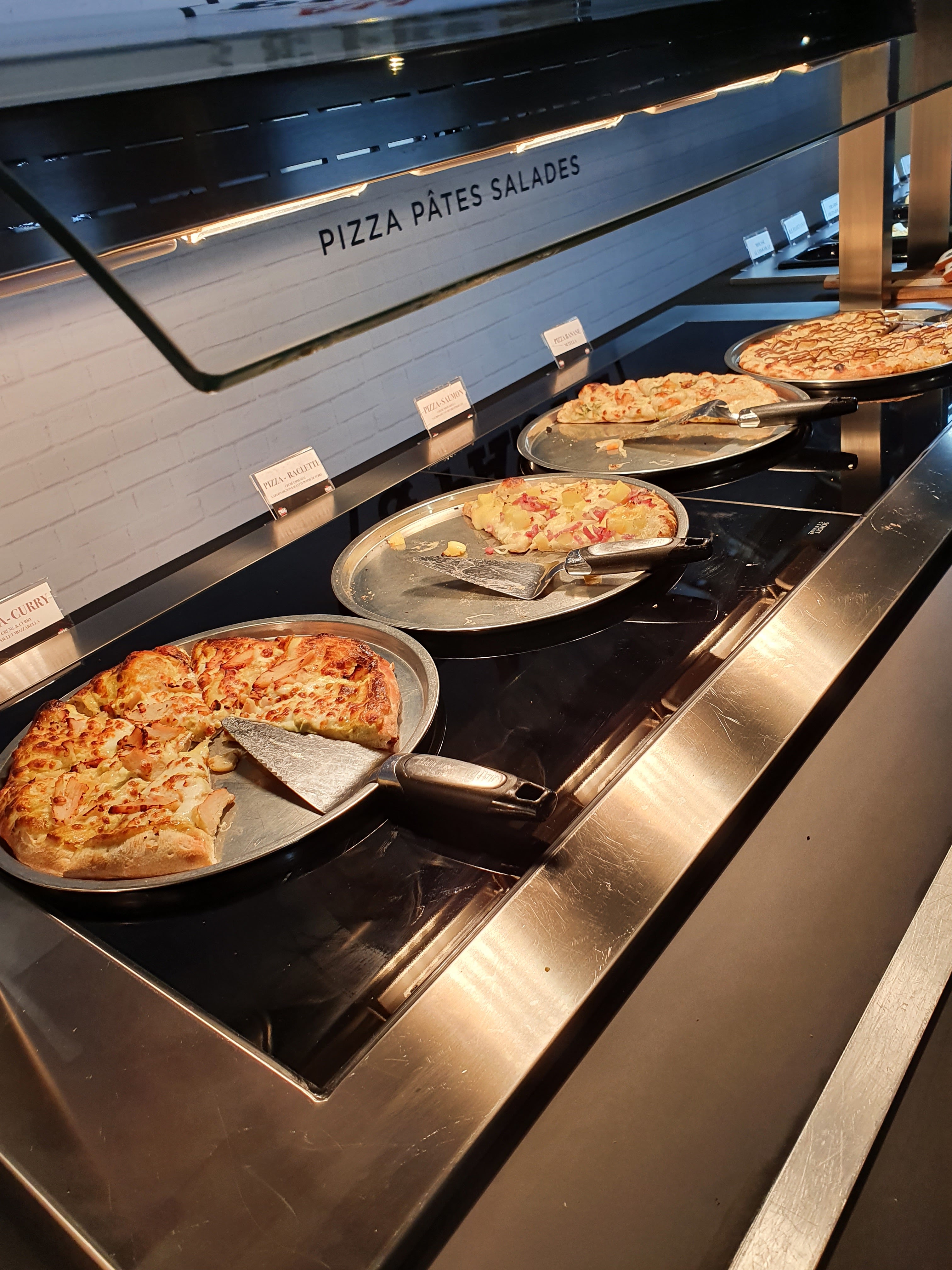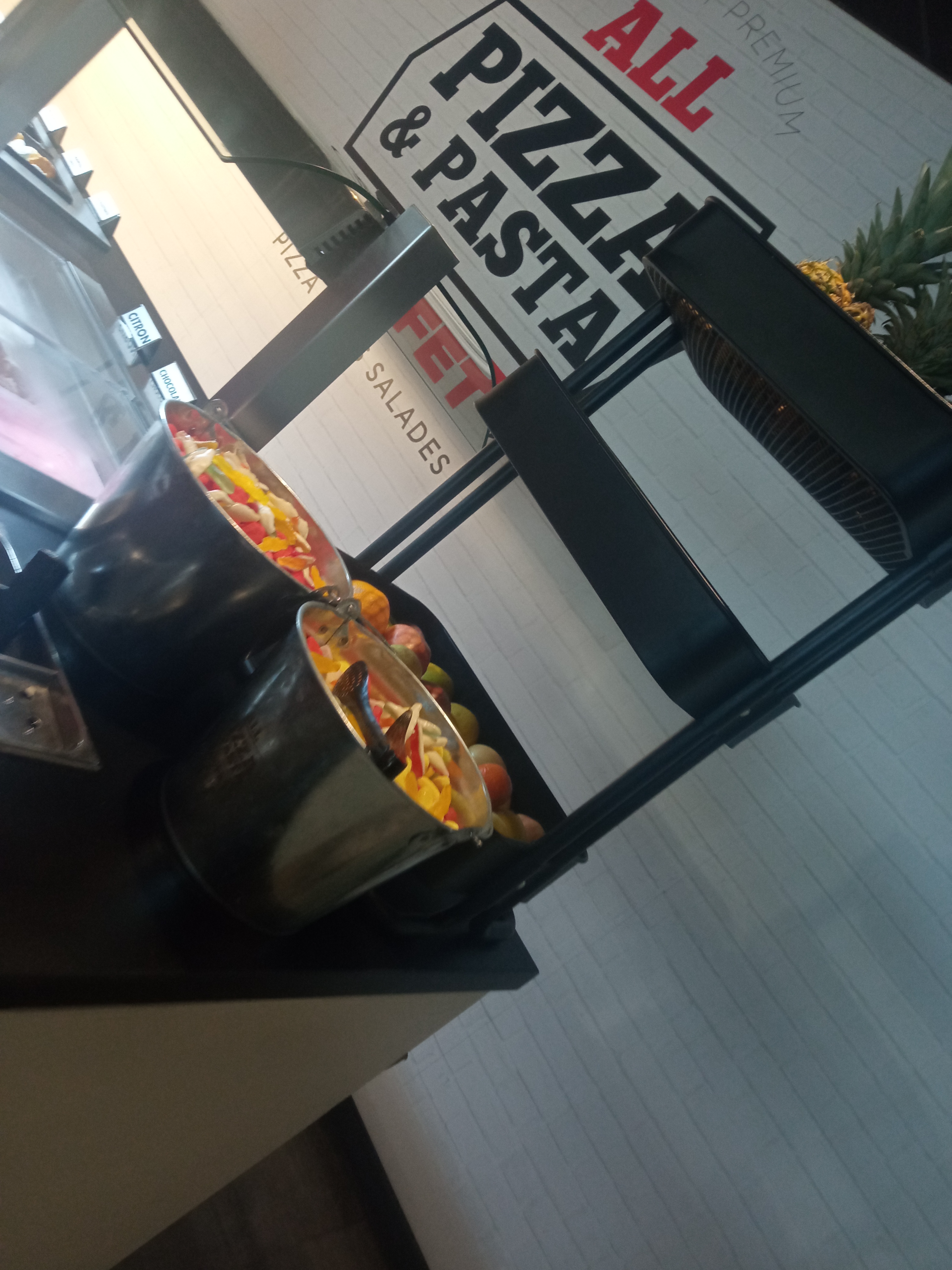 Le concept est intéressant, top même quand on y pense! mais j’ai été déçue sur plusieurs points (cela reste mon avis 😉): - j’aurais préféré des verres pour les boissons plutôt que les gobelets en carton, et une carafe d’eau au lieu de traverser le restaurant avec mon gobelet pour me rendre à la fontaine - les garnitures des pizzas sont originales, la pâte est délicieuse, beaucoup de choix (un réel bon point) mais je suis tombée sur quelques part dont la cuisson de la pâte manquait un peu - au niveau des desserts, il n’y a pas forcément besoin de plus de choix (surtout après des pâtes et de la pizza 😊), c’était très bon, mais la salade de fruits est peut être à revoir car elle manquait de saveur. Sinon l’ambiance du resto est sympa, les serveuses sont agréables, il y a de l’espace pour venir en famille 👍