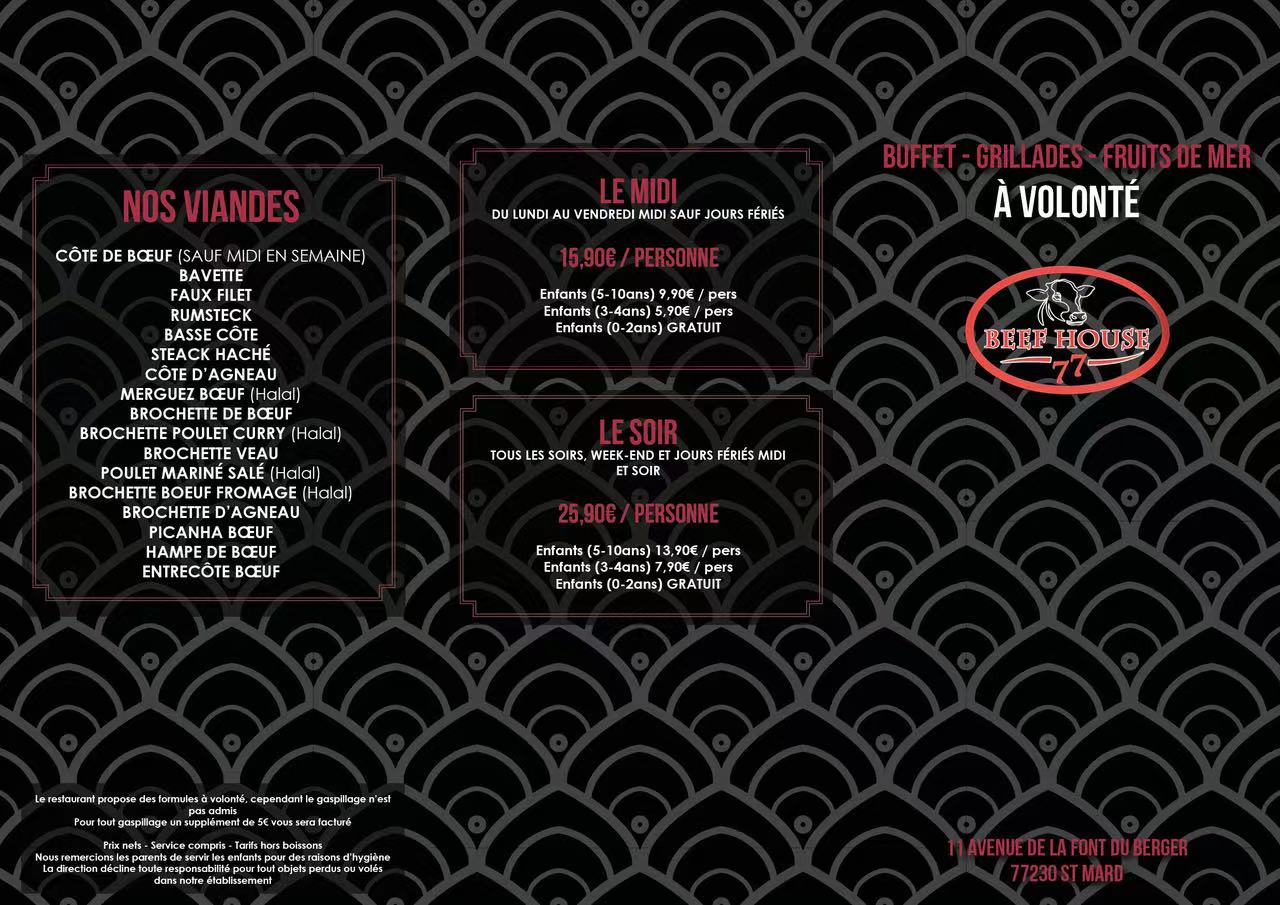 Le nom du restaurant m a induit en erreur, je pensais aller dans un restaurant spécialisé dans la viande mais a ma grande surprise il s agit d un restaurant buffet a volonté. L établissement est très propre, très belle décoration. Le personnel est réactif, accueillant et professionnel. Niveau cuisine : très bien, produits de très bonne qualité, bien cuisinés. Vous avez un grand choix de variétés que ce soit en entrées, plats, fromages (rare dans les buffets à volonté) ou desserts. Le repas le midi 15.90 € et les boissons sont de prix très raisonnables. Je recommande ce restaurant.