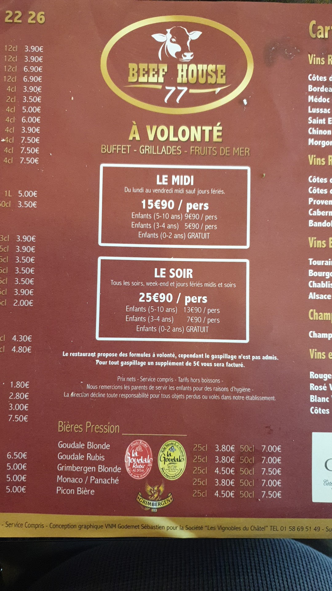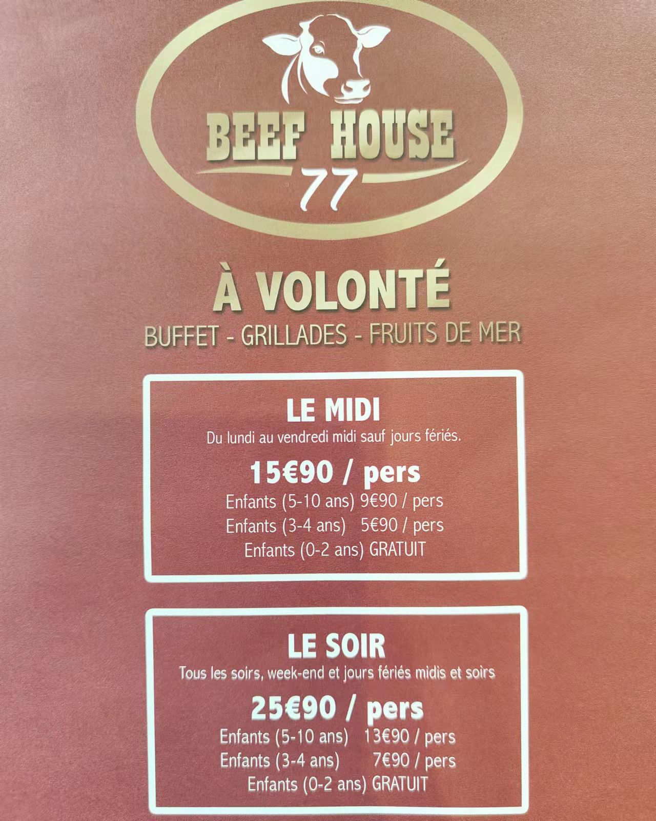 Beef house on s'attend à manger de la viande (4 malheureux steak au comptoir grillades c'est la seule viande de bœuf que vous aurez) c'est plus un resto style chinois à volonté. Principalement des plats congelés qui n'ont pas forcément le goût attendu. Hors de prix pour la qualité des produits même chez soit on peut faire mieux. 25balles par être malade les 2 prochain jours.