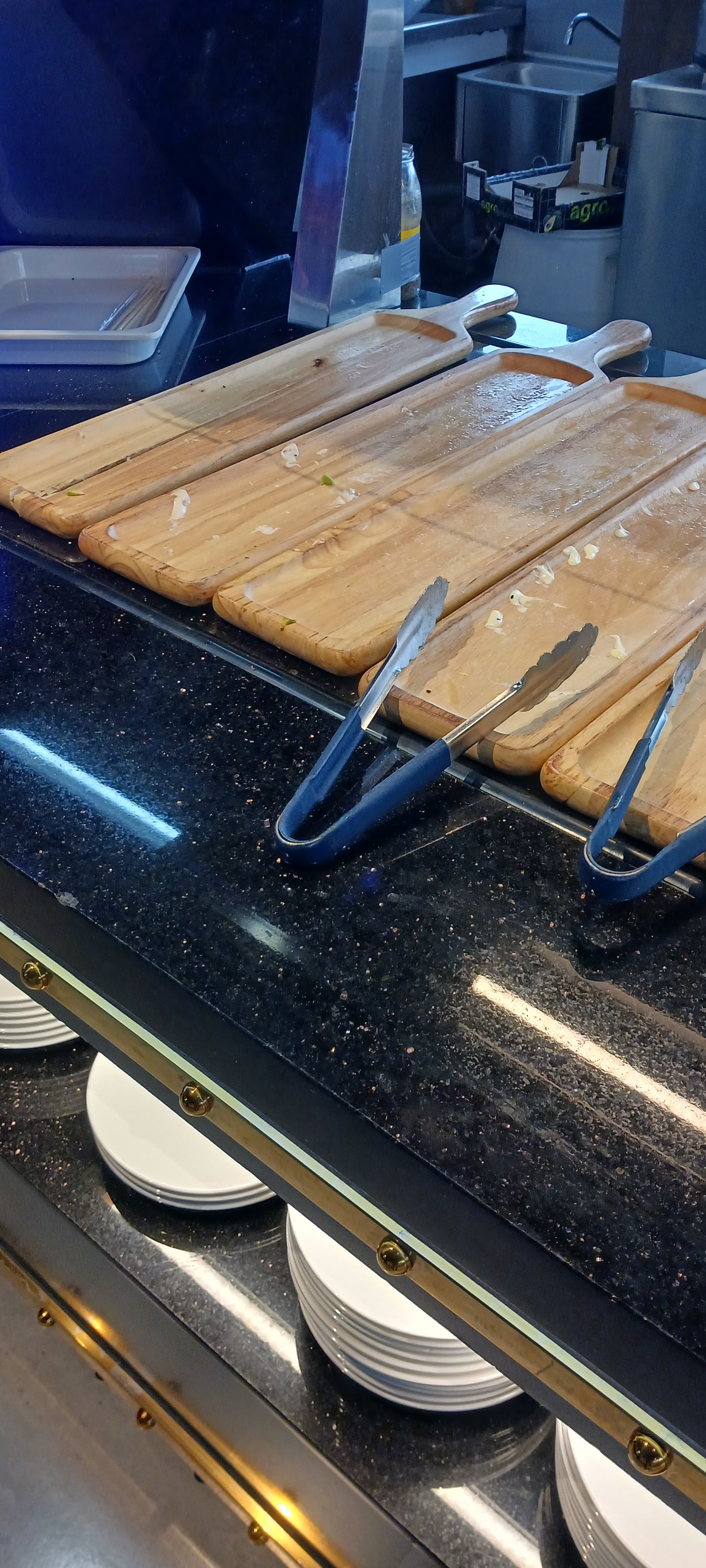 Cadre beau mais le présentoir des plats d entrée et plats chaud pas assez grand selon moi et en cas d affluence trop de monde devant les plateaux.la nourriture est bonne et fraîche les desserts pas assez .
