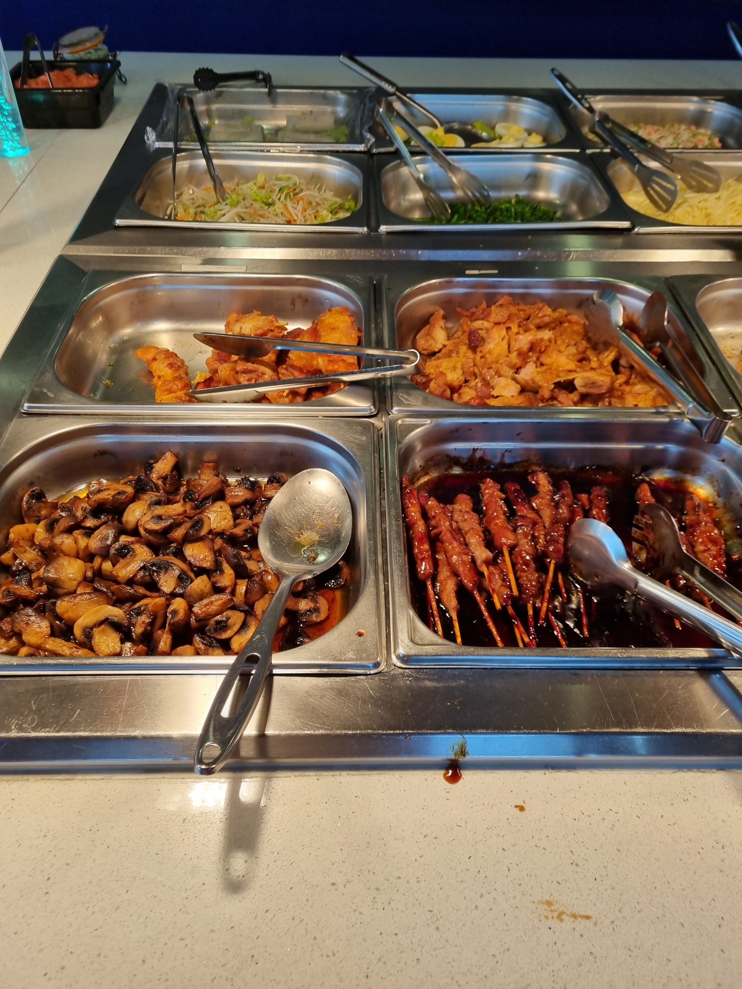 J'ai tourné tourné autour des deux buffets et je n'ai rien trouvé. Makis au riz sec, viande incertaine, j'ai dû me rabattre sur les poulets style KFC.(je vous recommande les pilons de poulet,ils sont passables). À éviter.