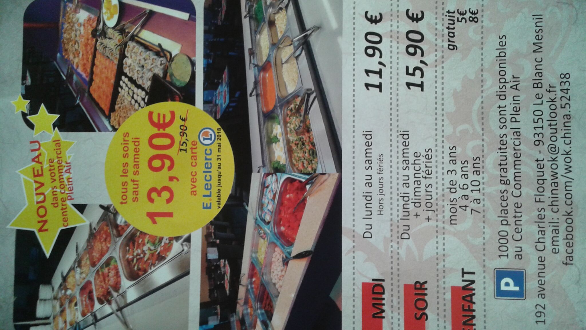 Restaurant rapport qualité prix correcte buffet propose de nombreux plats avec en plus un wok je recommande 👍