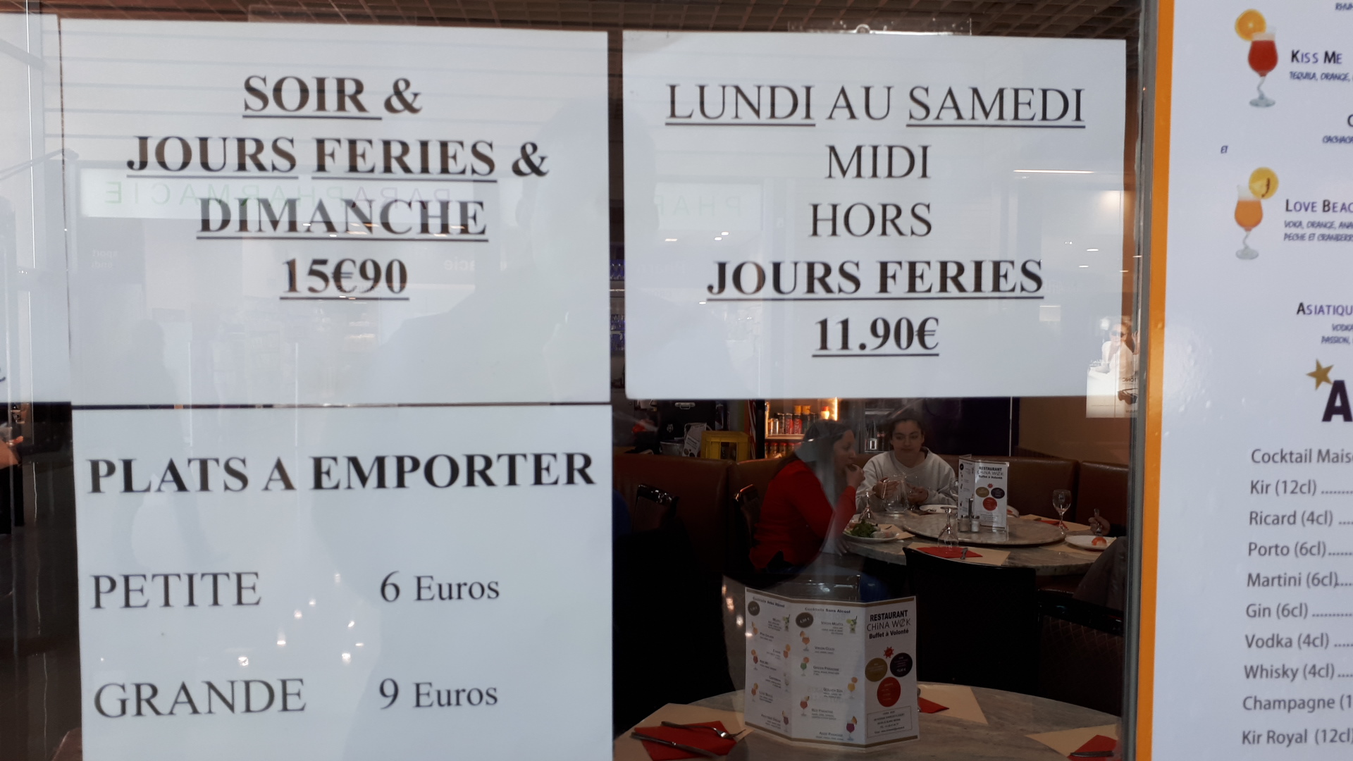 Plat à emporter 9 € la grande barquette et 6 € la petite. Obligé de demander d'avoir des crevettes sautées Sel poivre car il n'y en avait plus. Je retrouve le classique des buffets à volonté. C'est bof, mais les employés sont à la demande.