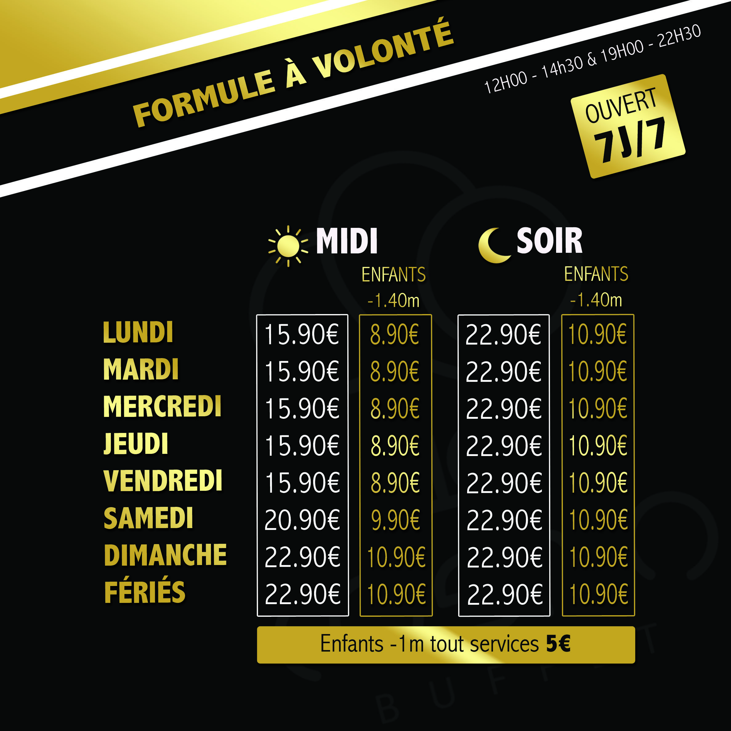 Bjr a tous..Avec ce restaurant nous sommes gâtés..la mode étant au buffet à volonté.... contrairement à ce qui ce pratique sur la ville pas de plats asiatiques...cuisine style Française...l'offre répond à la demande de chacun en therme de diversité....peut être le seul bémol le linéaire frites oignons frits nuggets etc pas assez chaud limite en température ce qui obligé à utiliser le micro onde. Pour les plats chauds linéaire viandes et légumes parfait température très bonne ...on notera glaces a la pression et Farandole de desserts et fruits...les entrées charcuteries et traiteur.. Pour le prix par personne le midi celui d'un routier ... correct. J'attends d'y aller le soir et voir l'offre pour le prix demandé environ 6euro de plus...