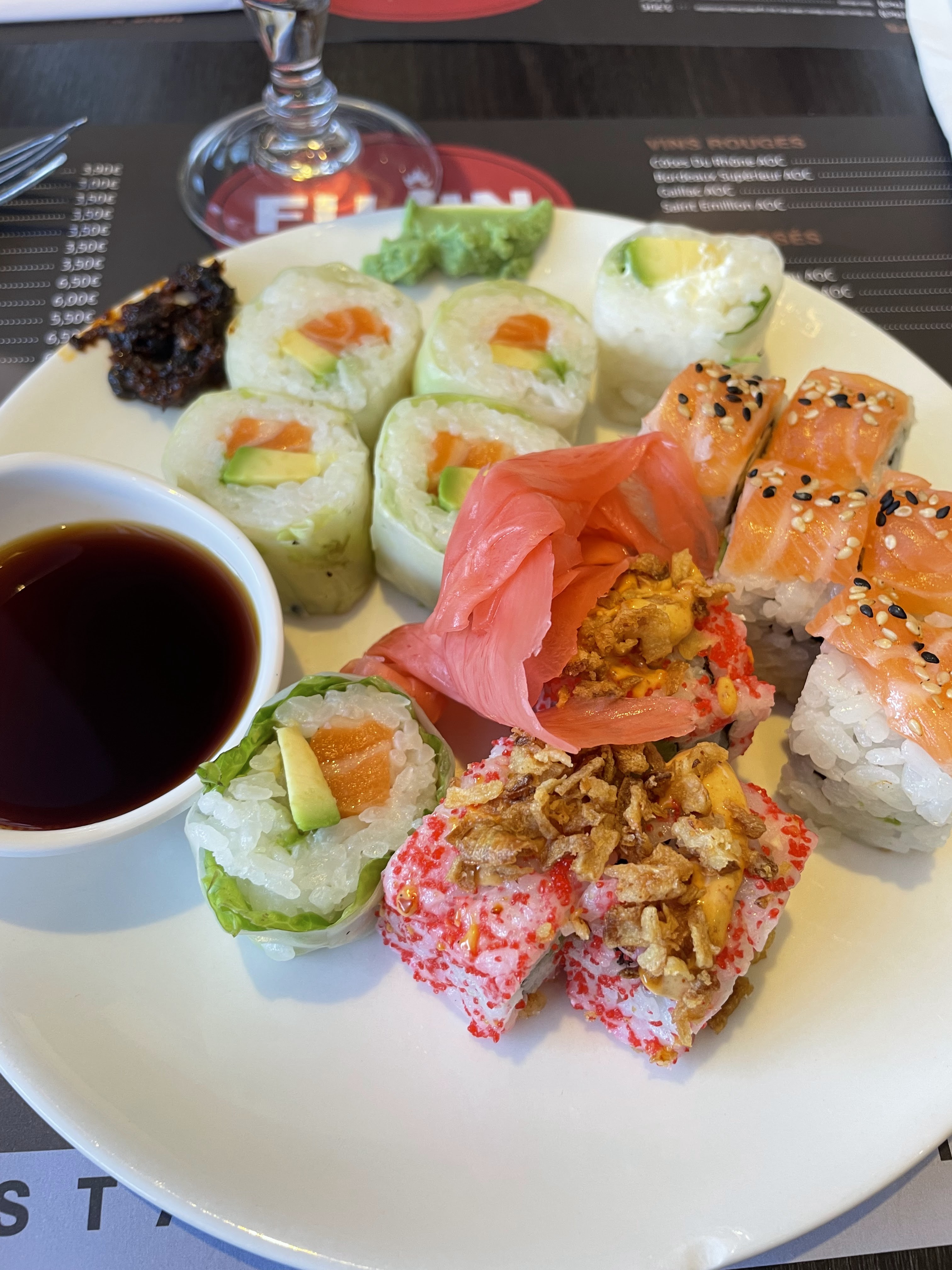 Très bon sushi avec un maître sushi; boeuf, cannard, crevette au top. Juste les nouilles sautées avait le goût de cramé et les brioches au porc était dur sinon très large choix et parti wok très appréciable également. Prix raisonnable, environ 25€ par personne avec un apéritif.
