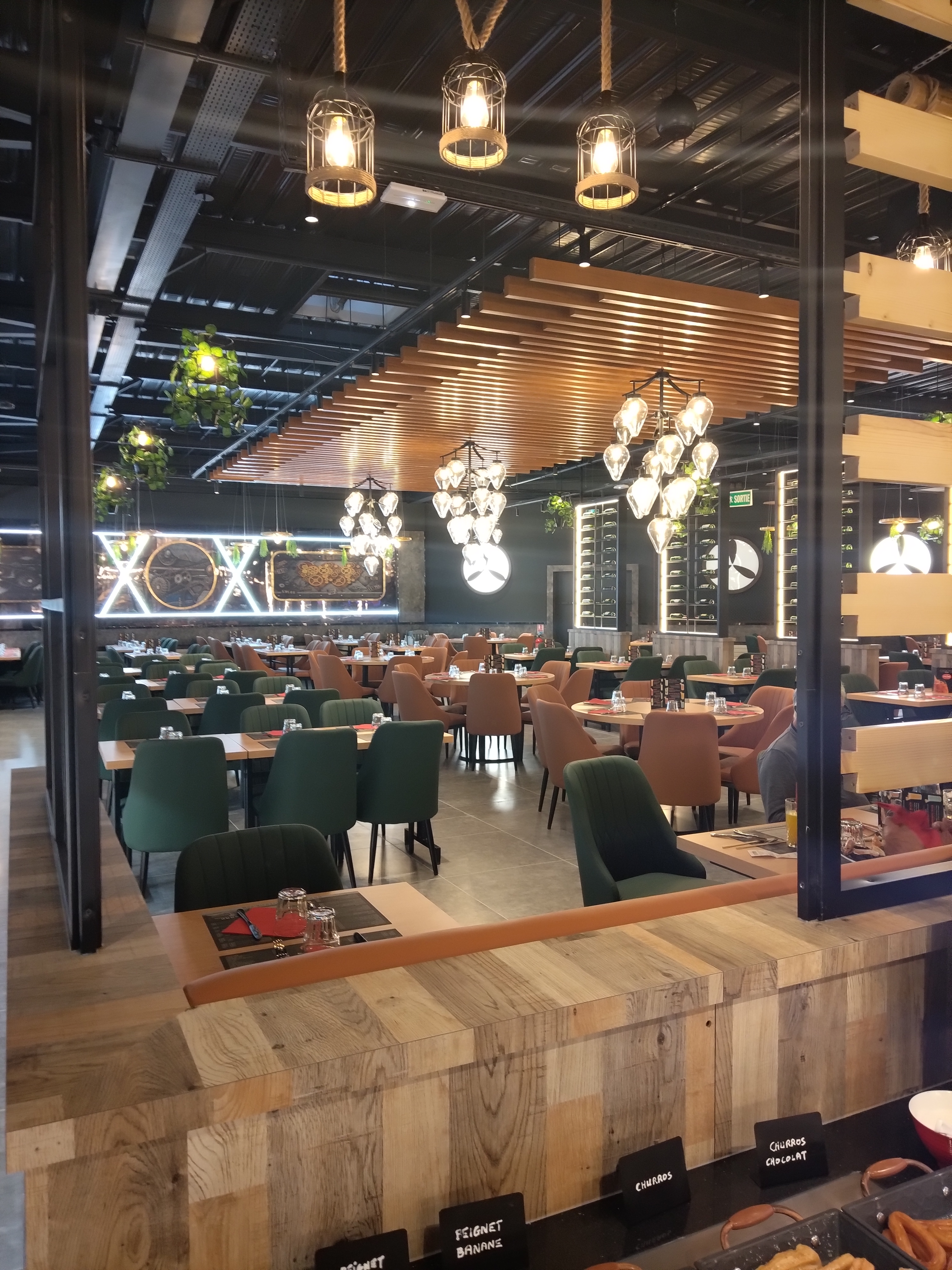 Le restaurant est très agréable, grand spacieux ,la décoration est très jolie. Par contre le service pas top obliger d'allait chercher les serveurs pour avoir à boire. La cuisine très moyenne beaucoup de choix mais pas de goût,la.cuisson au grill été crus et la viande et poissont sont mélangés...les desserts il y a beaucoup de choix mais sa reste industriel donc goût très moyen. Le petit plus salle de jeux pour enfants.