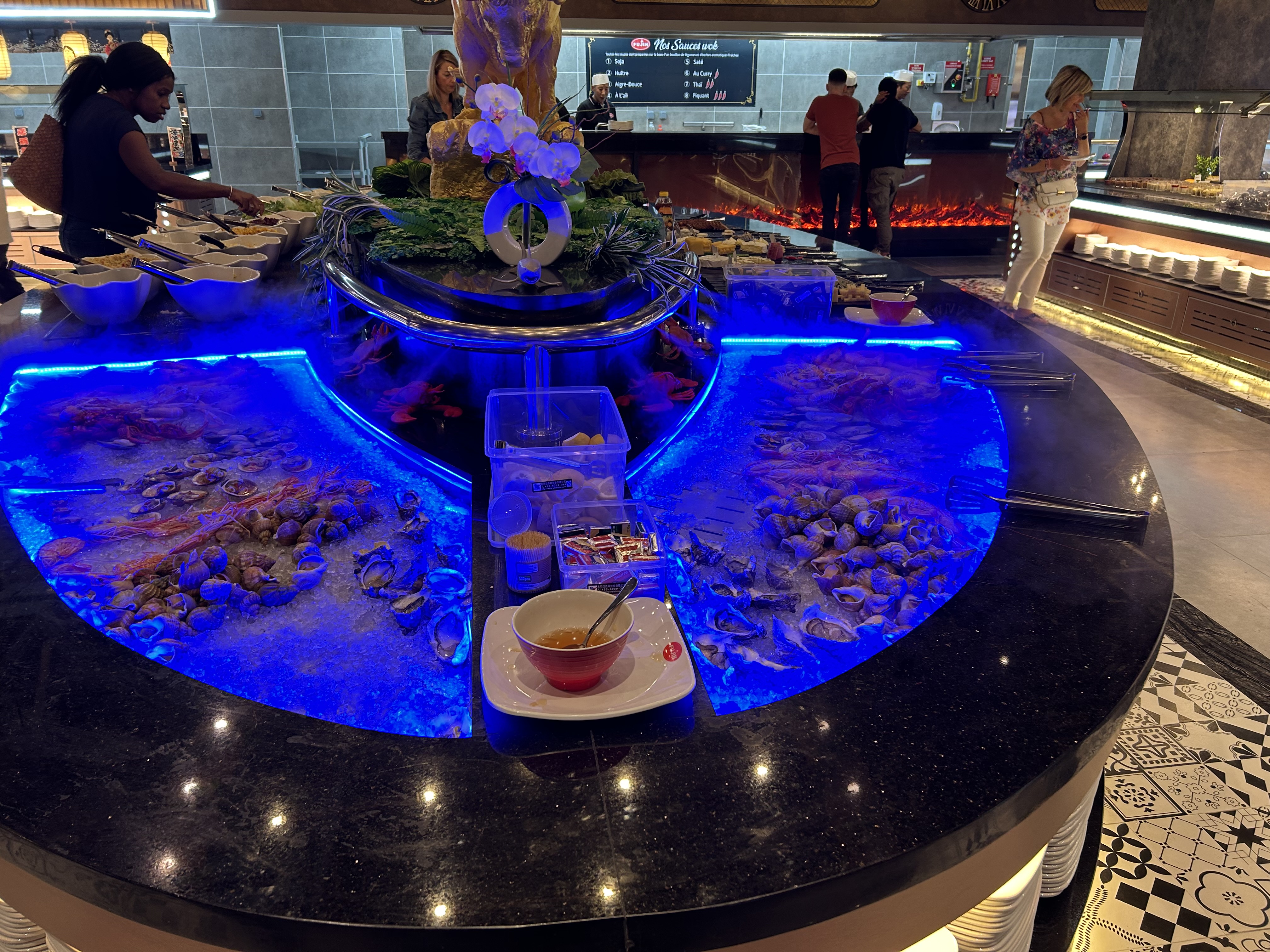 Il y a énormément de choix, des produit de qualité et bien frais. Les cocktails sont très bons.Les robots qui apporte les boisson sont drôle sa rajoute un peut d’ambiance. Le restaurant et bien décoré c’est très jolie. Certes le prix et élever mais j’estime que ça vaut sont prix je recommande fortement