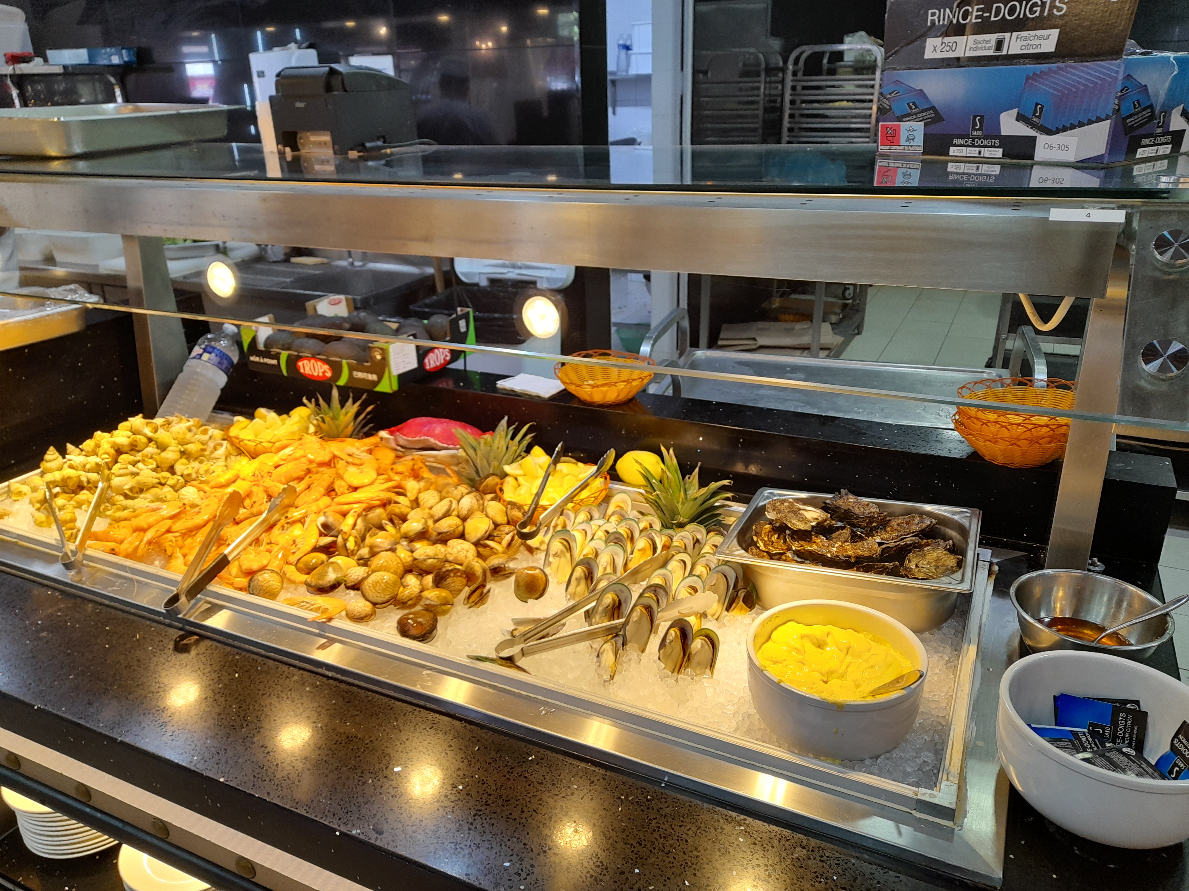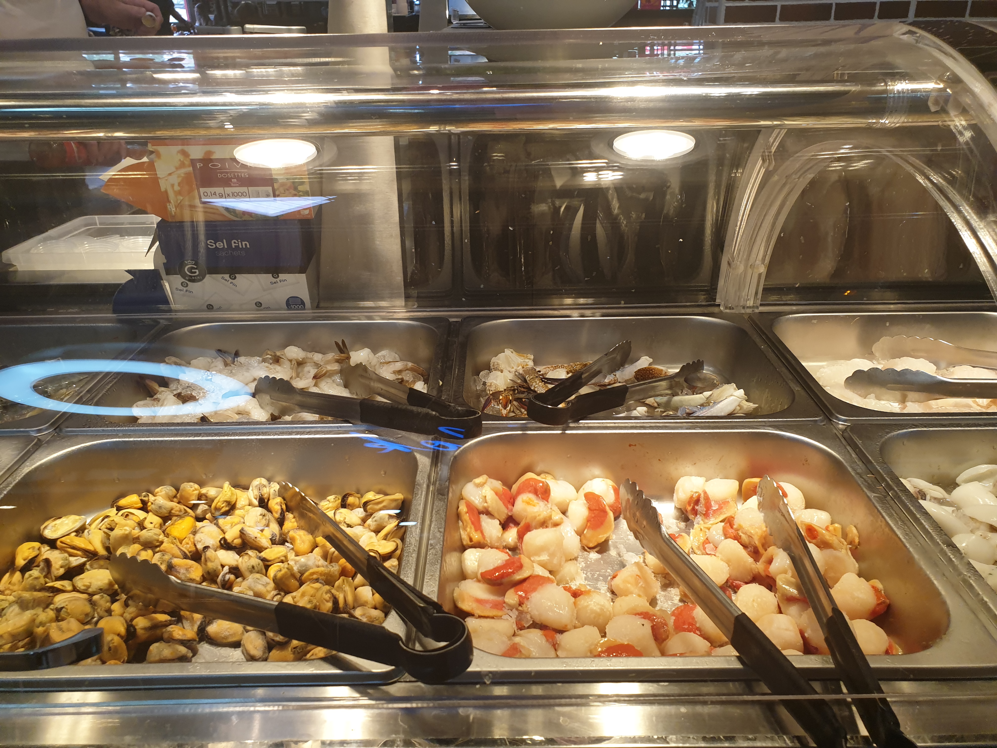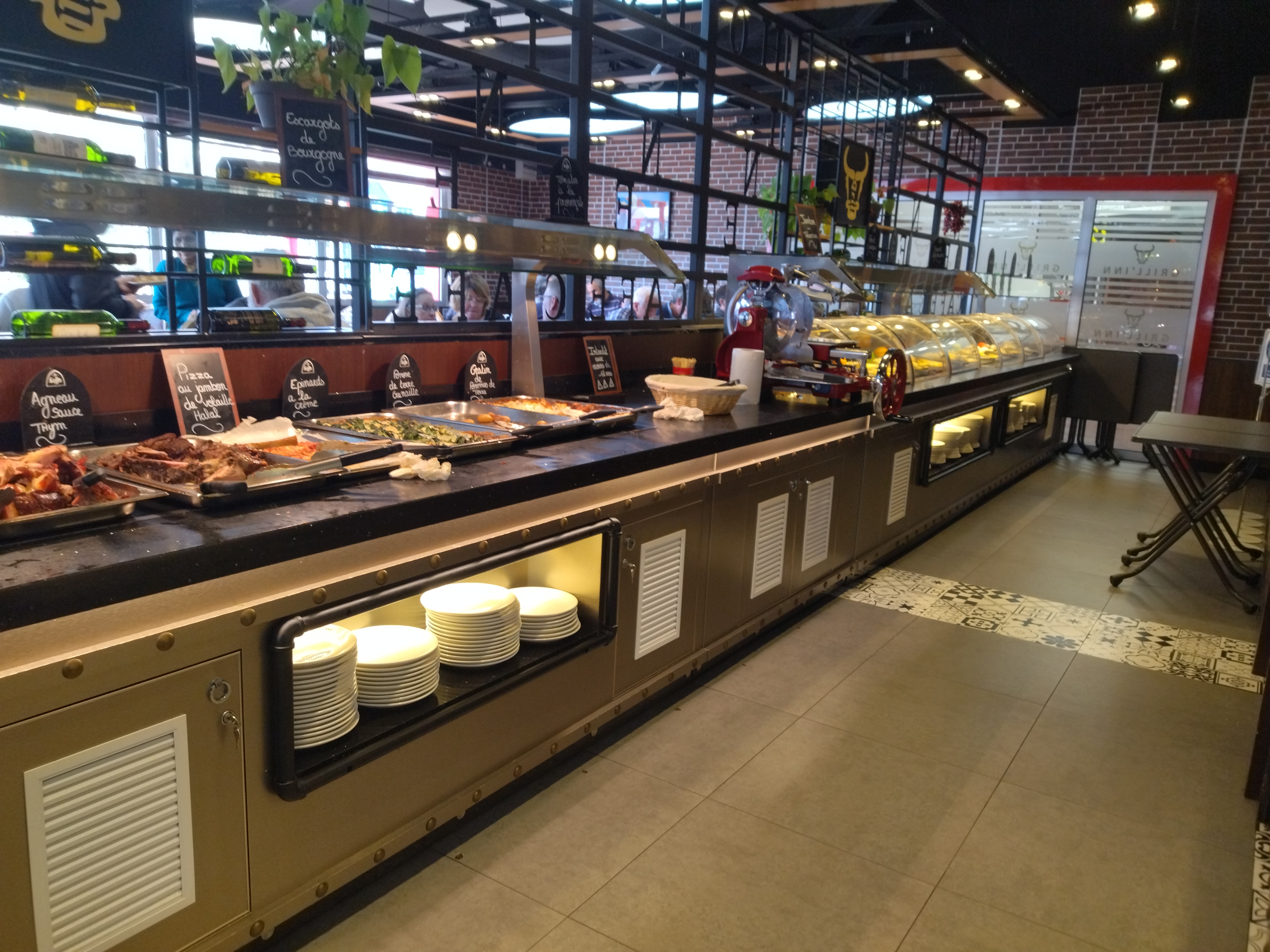 Un buffet a volonté gigantesque où chacun trouvera son bonheur. Mon mari s est régalé avec les rognons sauce madère et moi avec les fruits de mer et me poisson. Mention spéciale au petit robot qui ois amène vos boissons à votre table. Le prix du buffet le midi en semaine est plus que correct 17,50 euros.