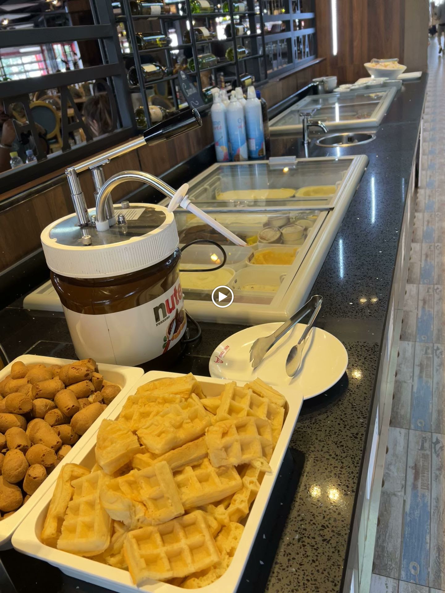 Lieu très grand j'adore leur déco. Nous y sommes allés un peu tard et pour tous vous dire il était 10h20 et j'ai eu peur que le serveur ne nous accepte pas car sur le site il et écrit qu'il prenne jusqu'a 23h . Bref je reviendrai plus tôt la prochaine fois mais nous avons apprécié le concept. En plus il y a une fontaine de chocolat 🍫 j'adore. Les gestes barrières sont respecté lz personnel porte des masques il y a une entrée et une sortie pour ne pas ce croiser et il y a des gants à chaque buffet.