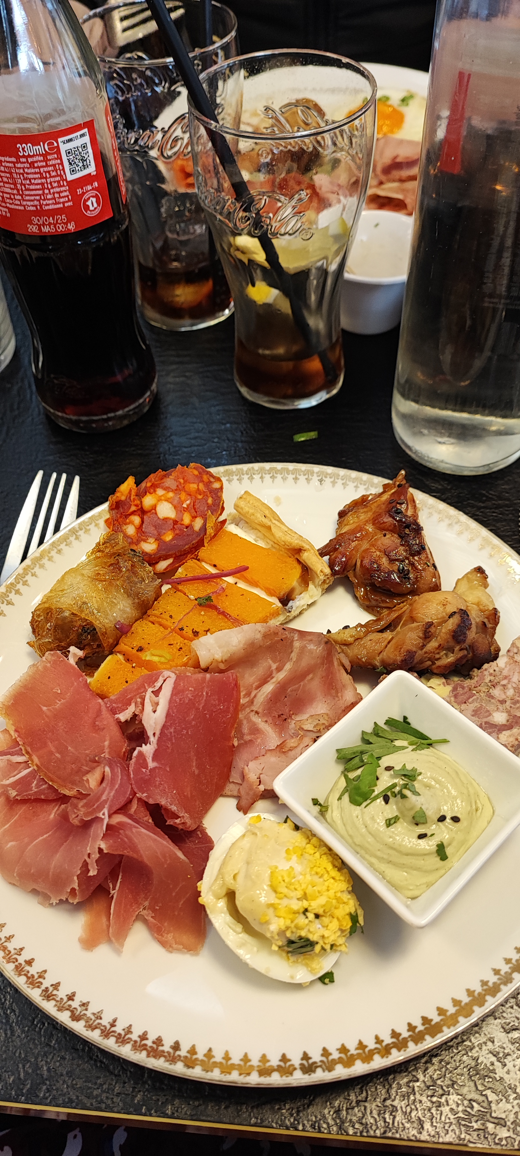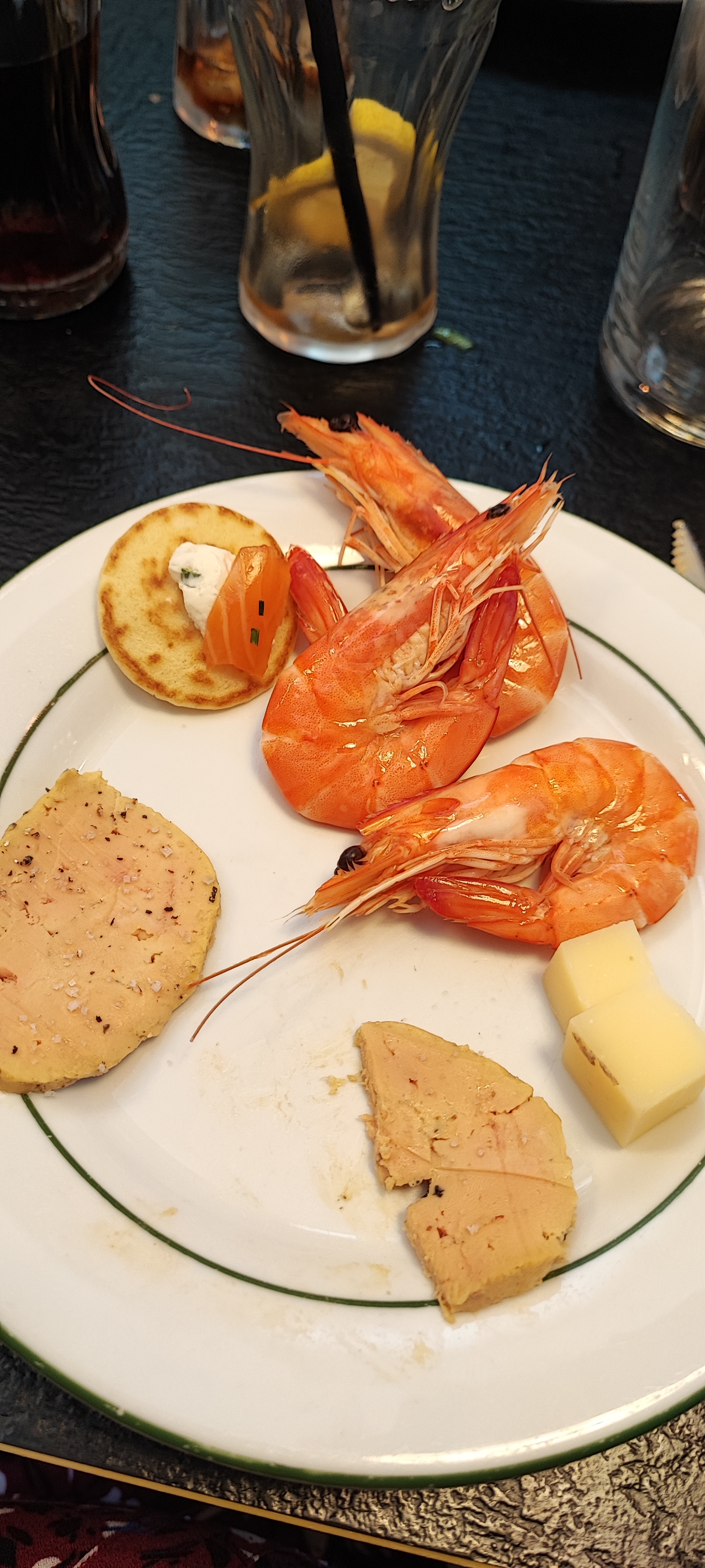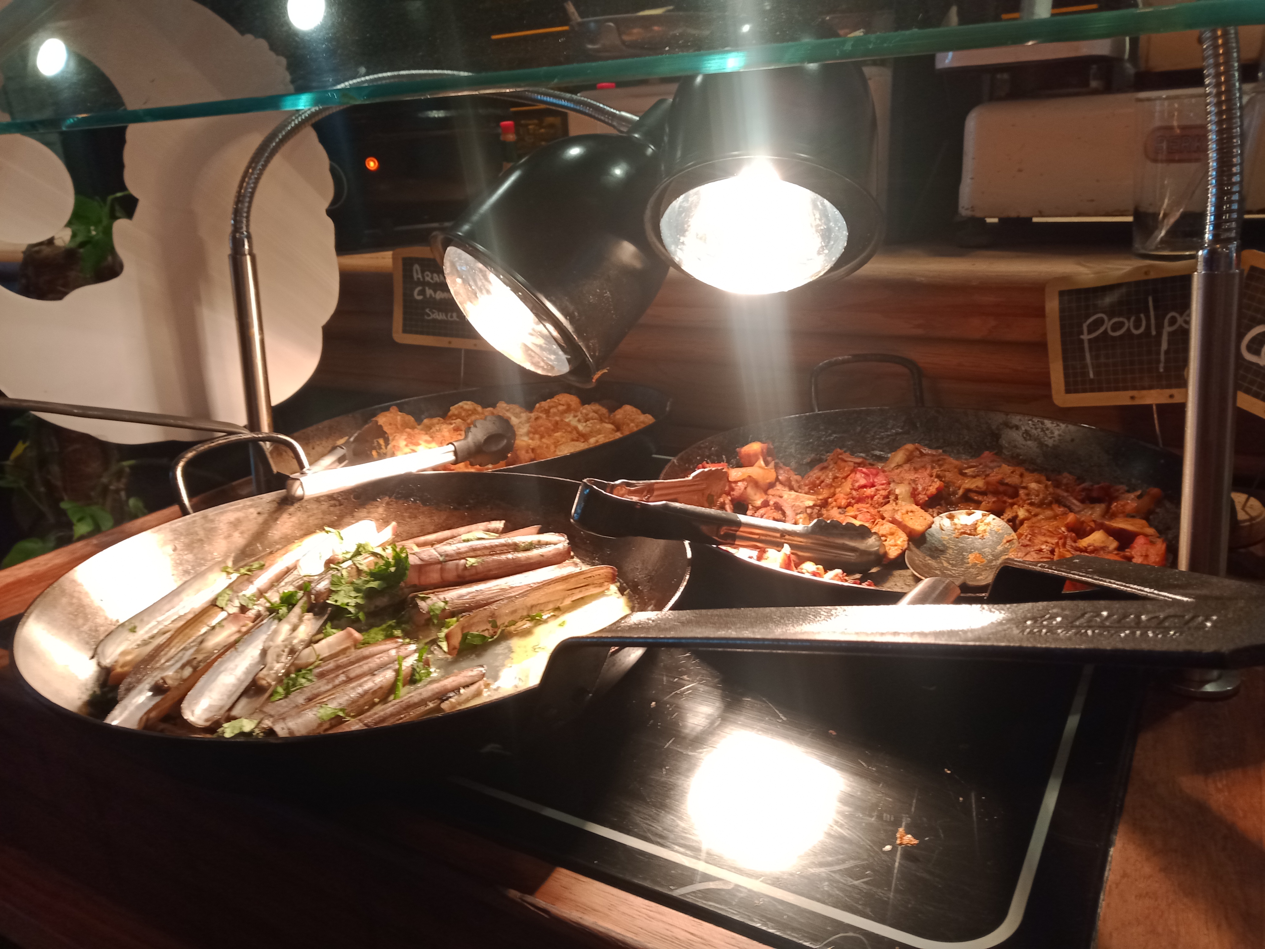 Beaucoup de choix, fruits de mer,charcuteries, foie gras,pinxos,nems, salade variées,cochon de lait, aligot,etc Vous en avez pour tous les Goûts. Vu l emplacement du restaurant,il n'a pas de problème pour se fournir en produits frais Les serveurs sont sympas et efficaces Nous connaissions, pour le déjeuner,test réussi pour un repas en soirée A refaire