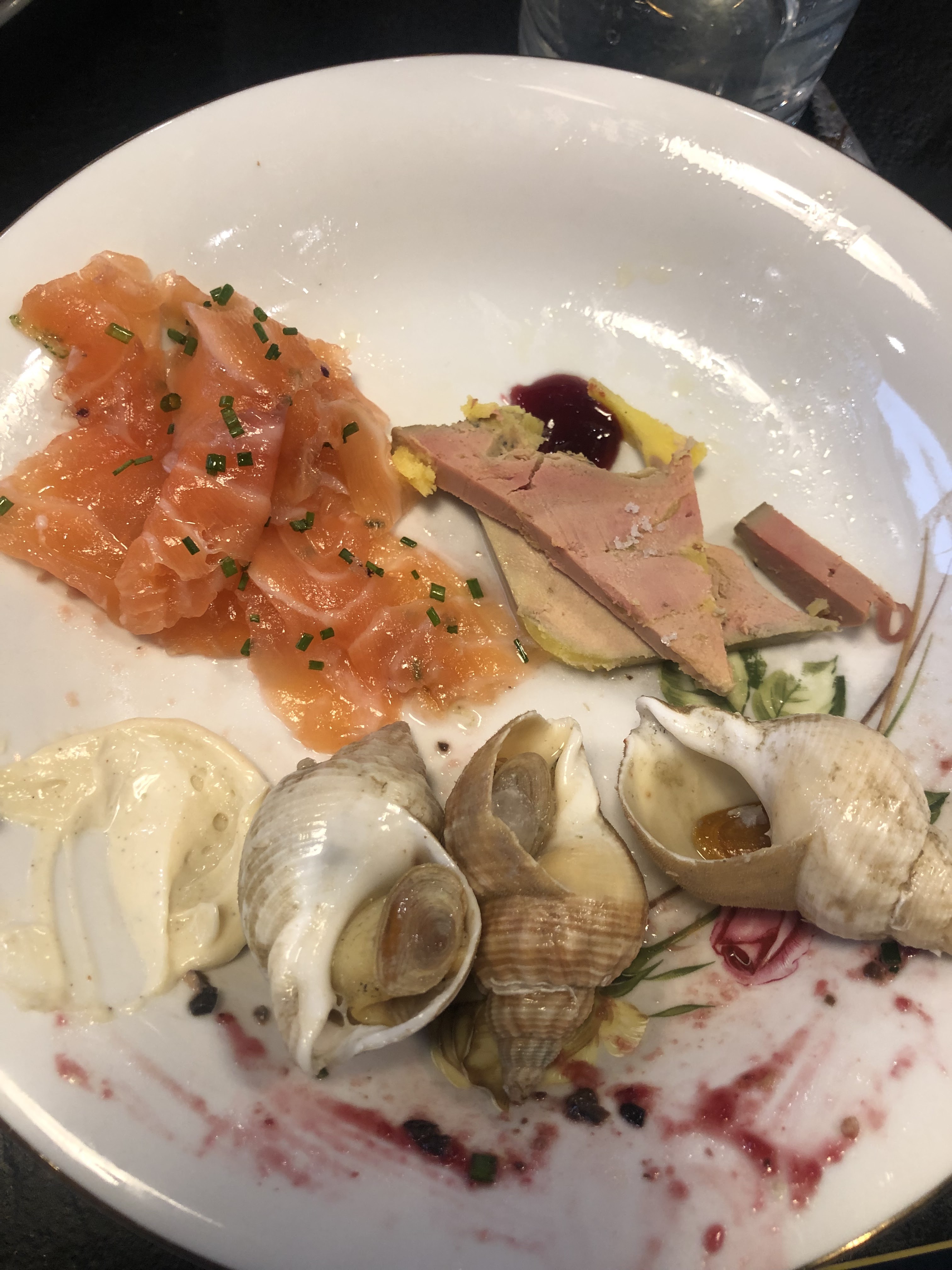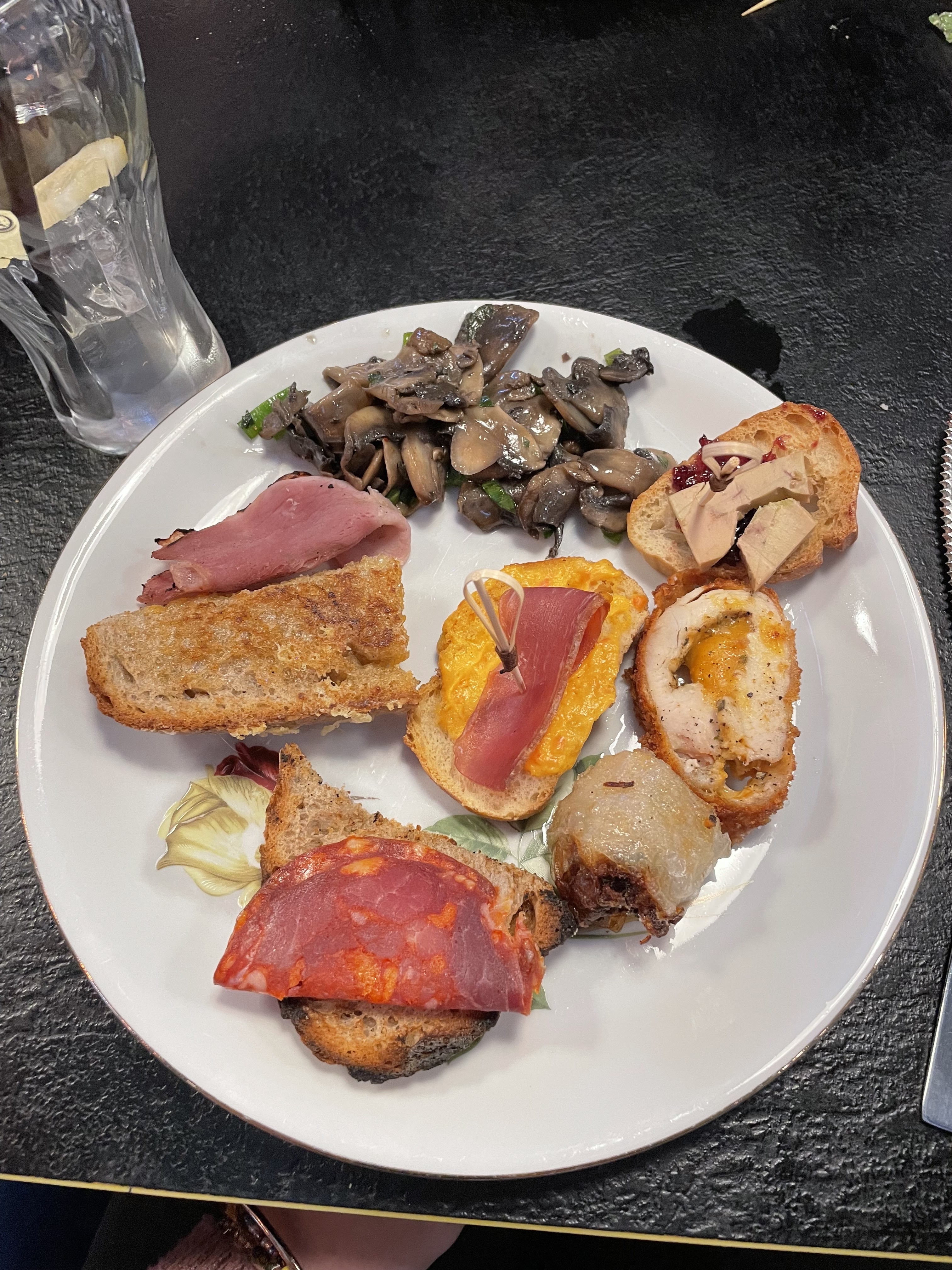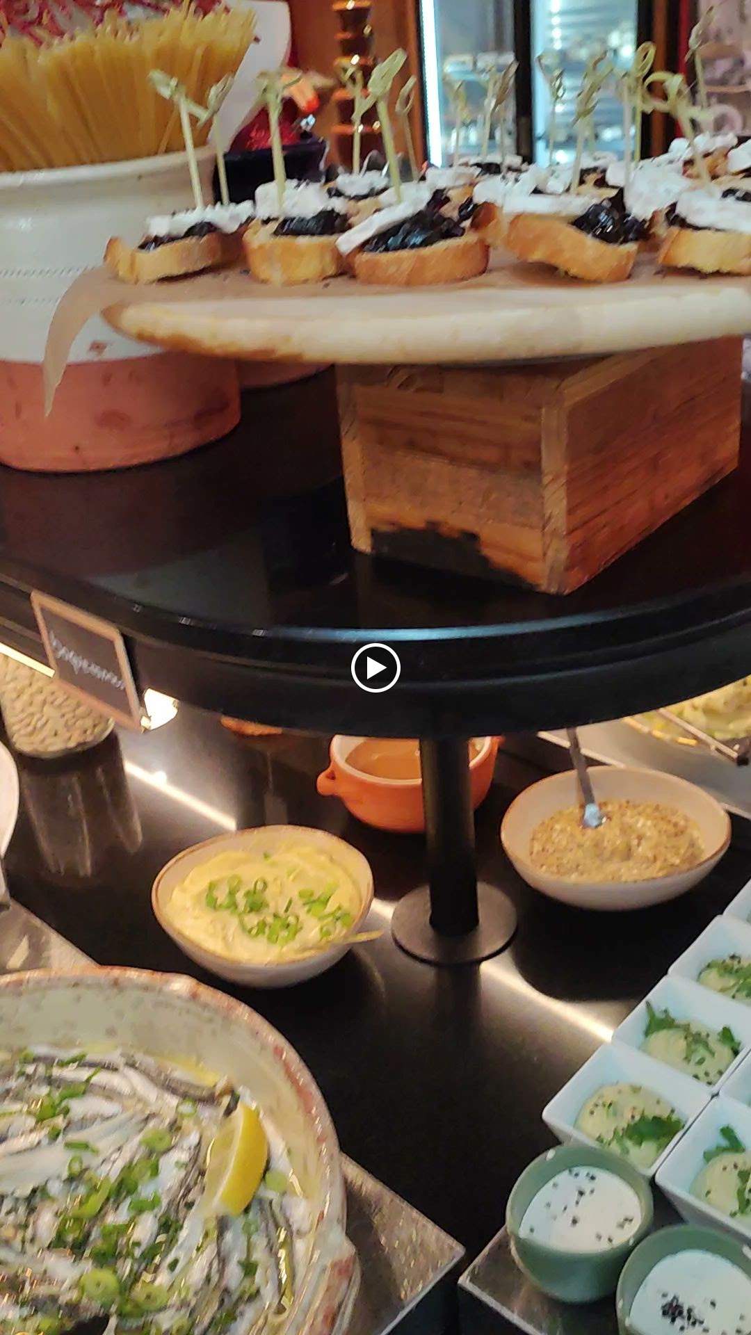 Beaucoup de choix, fruits de mer,charcuteries, foie gras,pinxos,nems, salade variées,cochon de lait, aligot,etc Vous en avez pour tous les Goûts. Vu l emplacement du restaurant,il n'a pas de problème pour se fournir en produits frais Les serveurs sont sympas et efficaces Nous connaissions, pour le déjeuner,test réussi pour un repas en soirée A refaire