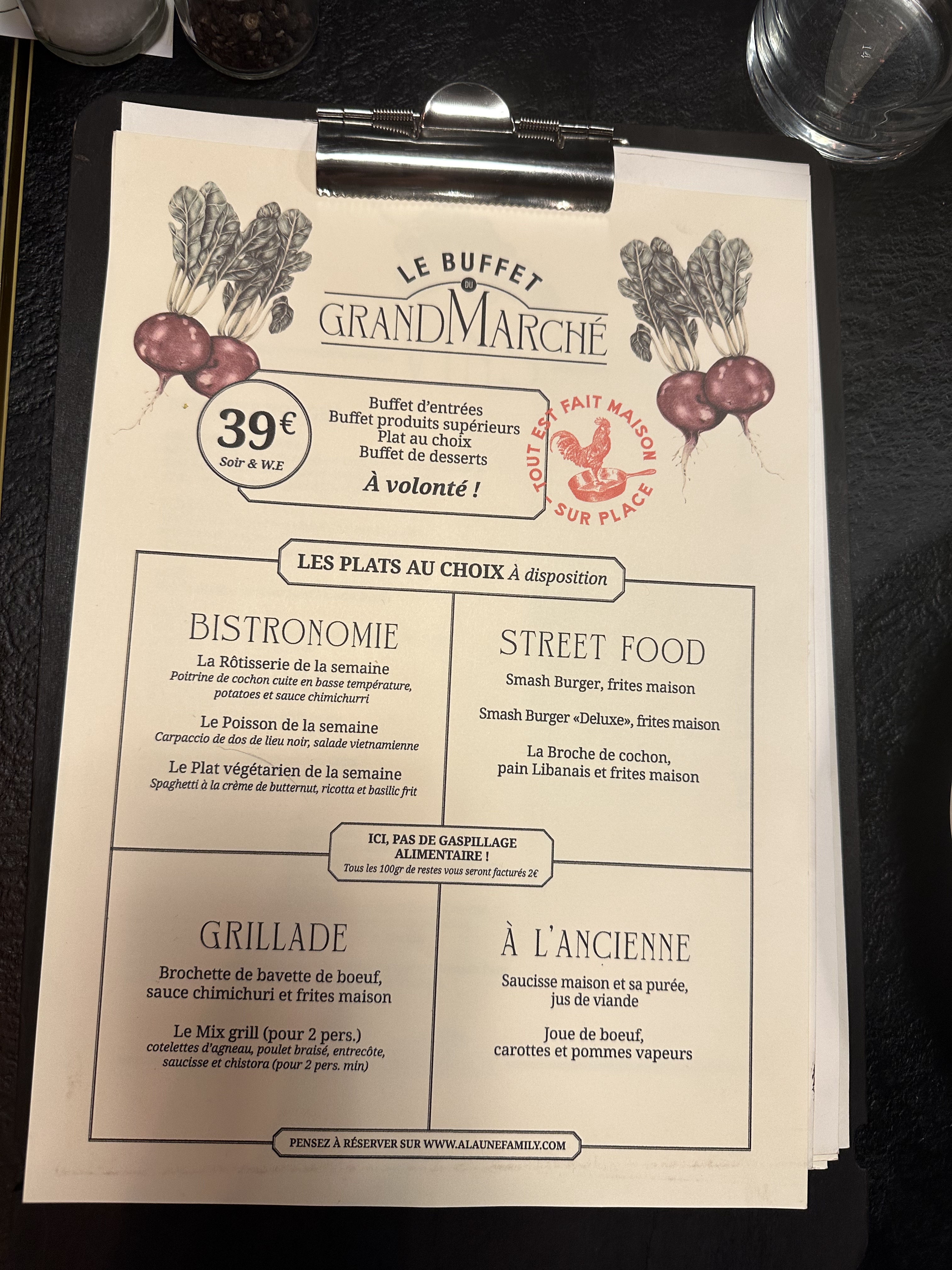 Une expérience unique, un buffet à volonté avec une telle qualité que le prix est tout à fait justifié Buffet d'entrées froides, chaudes, plat à volonté, buffet de fromages, buffet raclette, buffet de poissons, crustacés et buffet de dessert, tout est succulent, le tout avec des produits achetés sur le marché gare directement et frais. Nous reviendrons très vite pour goûter ce que nous n'avons pas pu manger.