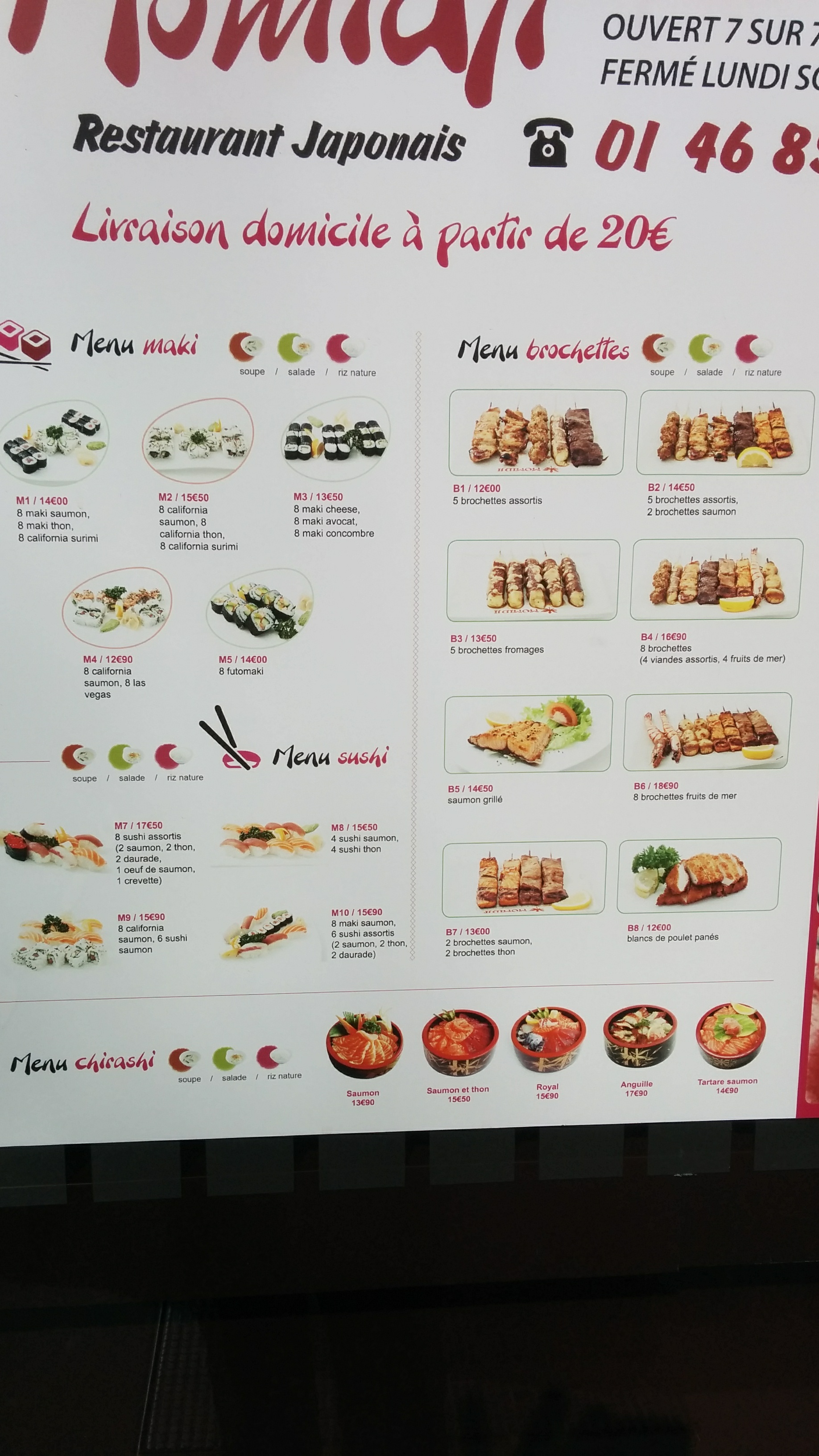 Les brochettes pas assez cuite pas de sashimi le reste convenable pour le prix par contre si vous prenez une bière pas de carafe d'eau dommage
