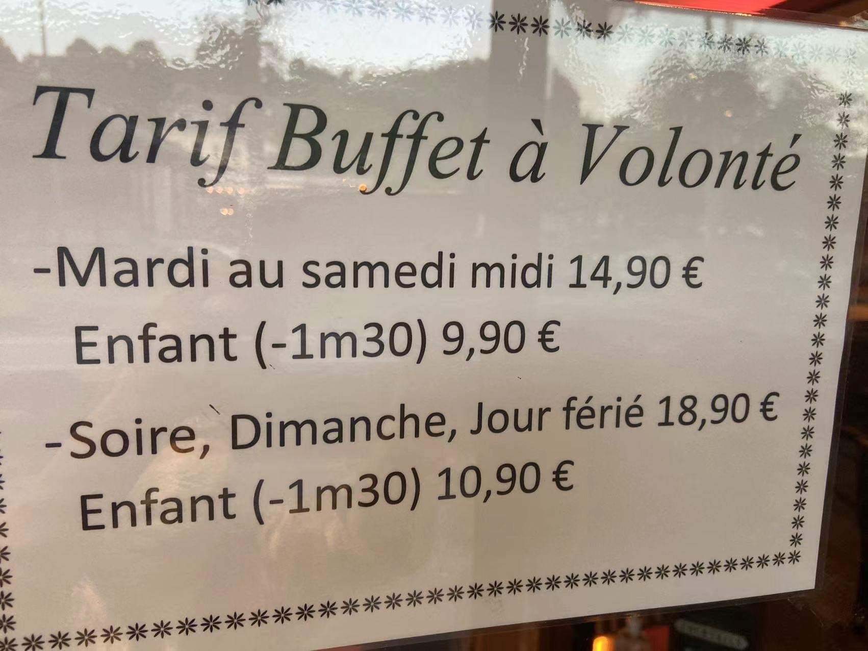 Je viens dans ce buffet depuis de nombreuses années avec ma famille, le rapport qualité prix est correct, il n’y a rien d’exceptionnel dans la nourriture mais l’endroit est bien entretenu et le personnel accueillant.