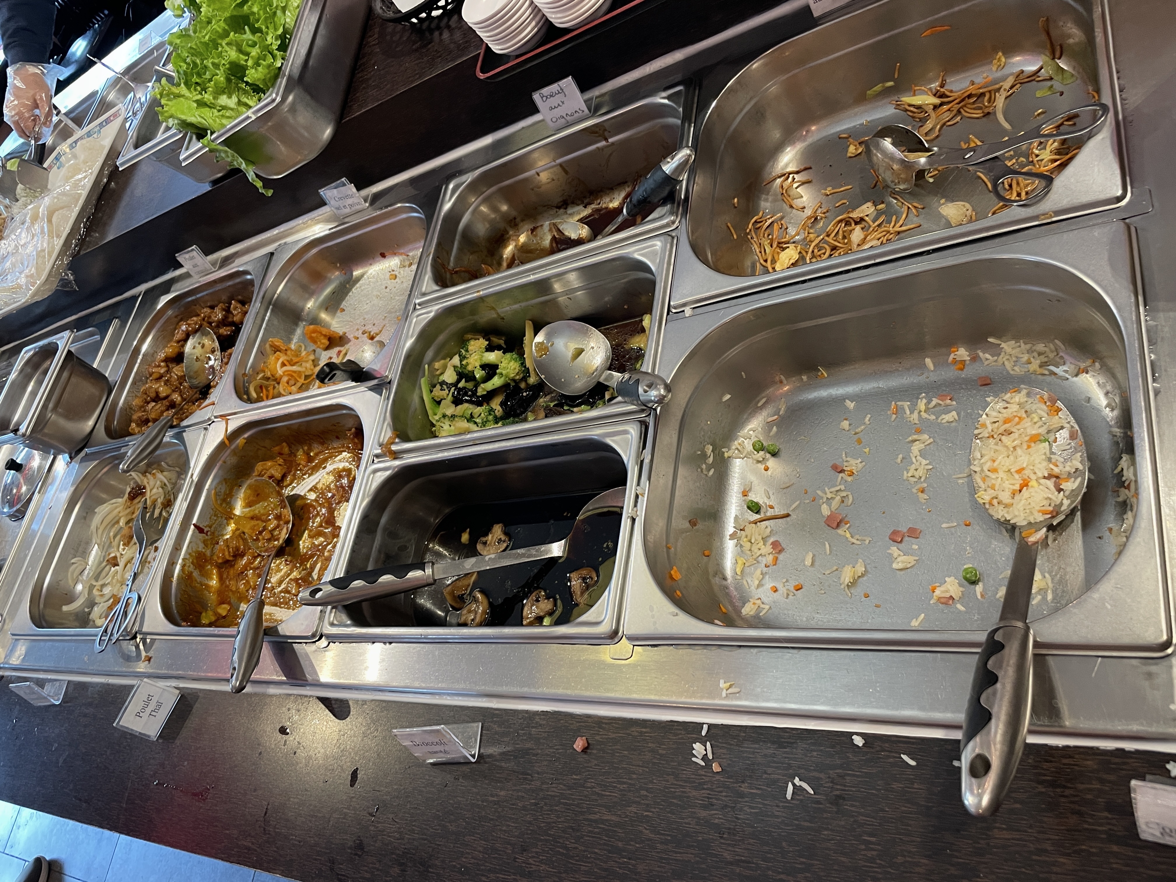 Bonjour, le midi nous avons quand même le coin japonais avec une variété de choix, et le coin chinois possède 9 plats. À côté vous avez les entrées et les brochettes. Nous faisons de notre mieux pour vous offrir des plants qualitatifs !