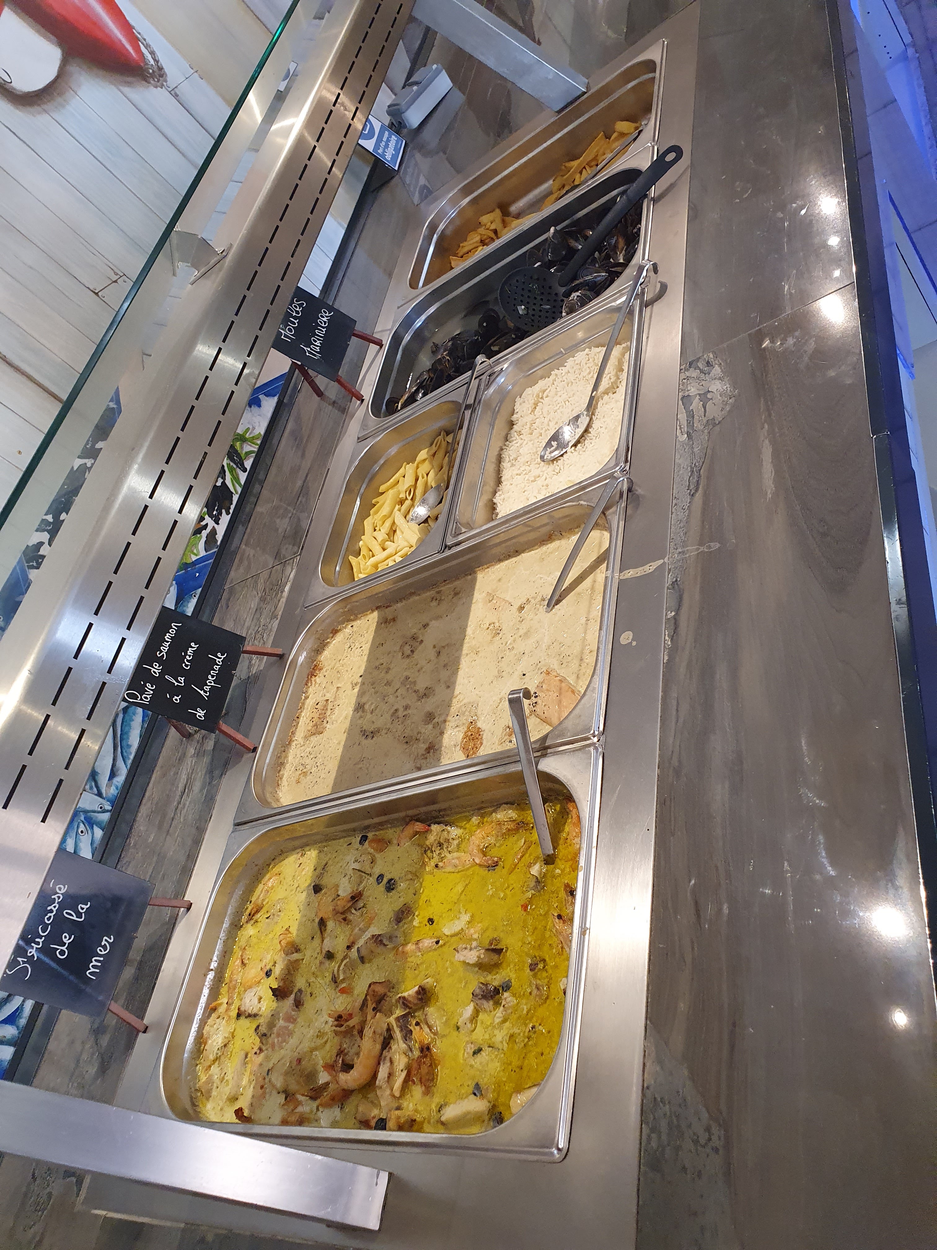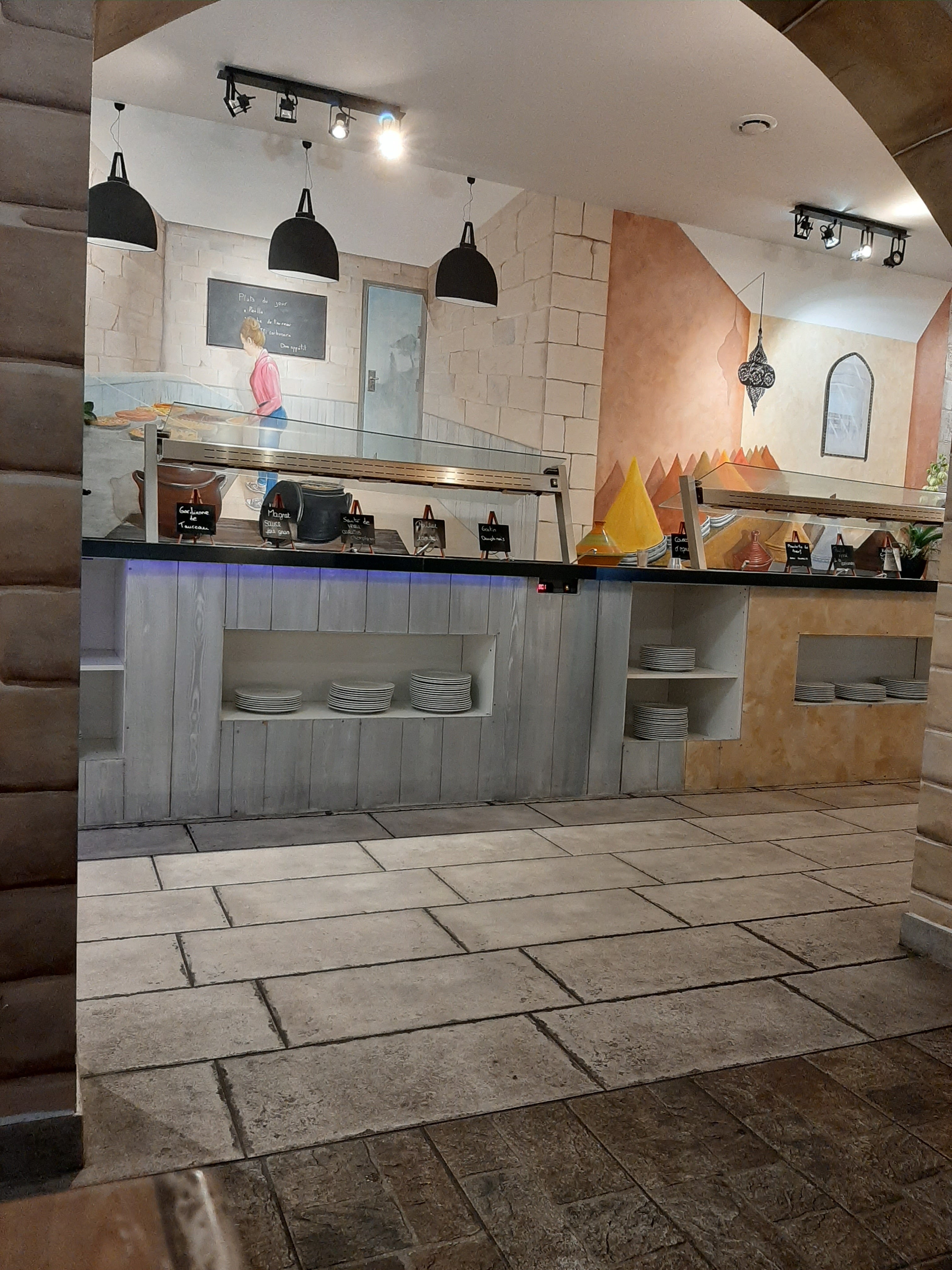 Pour une première fois, je suis agréablement surprise des différents mets que ce restaurant propose. Il était 13h05, moins de monde d'où c'est agréable de flâner autour des buffets Buffet froid, aux diverses salades, de la charcuterie Buffet chaud couscous agneau, merguez Buffet chaud daube de taureau Je recommande