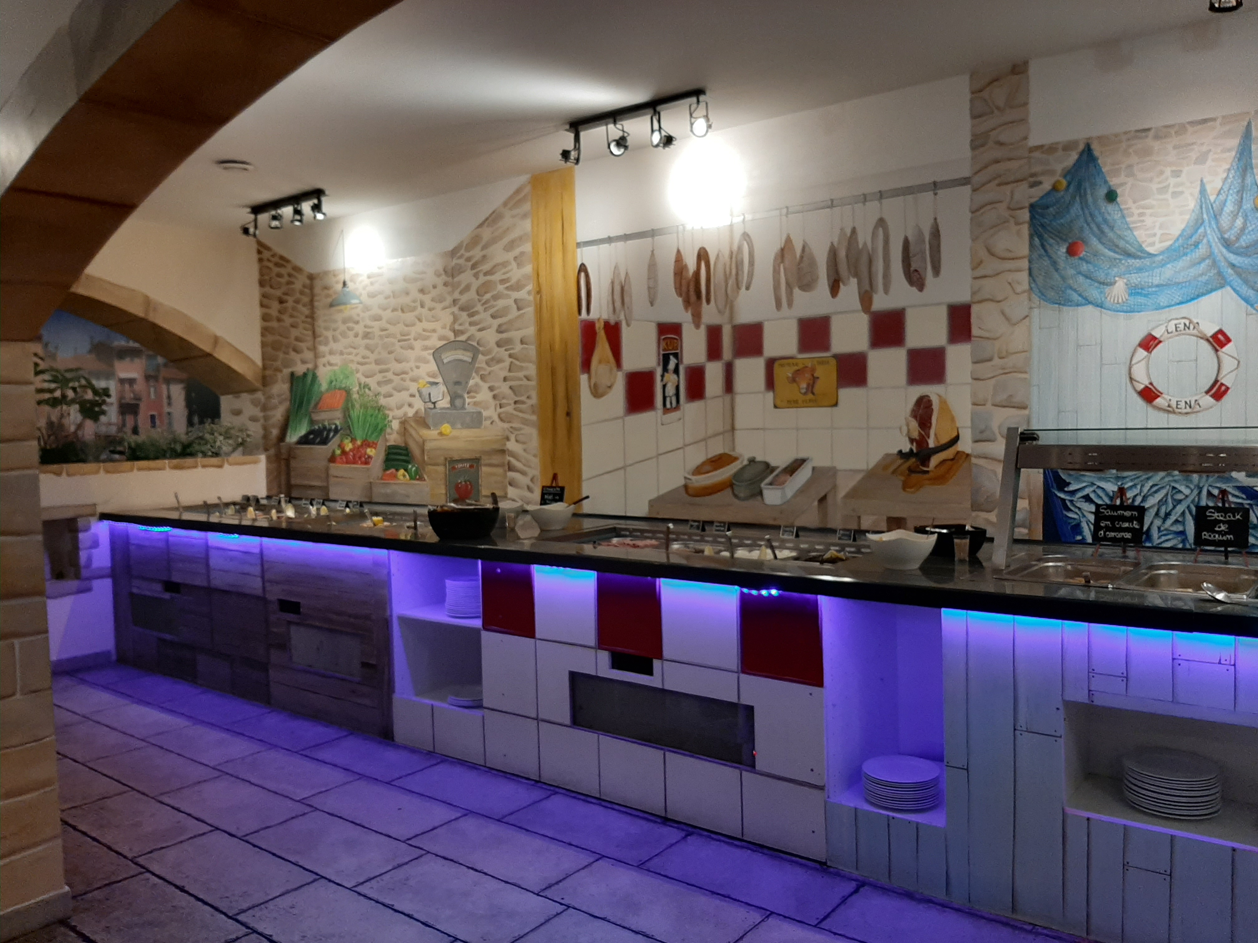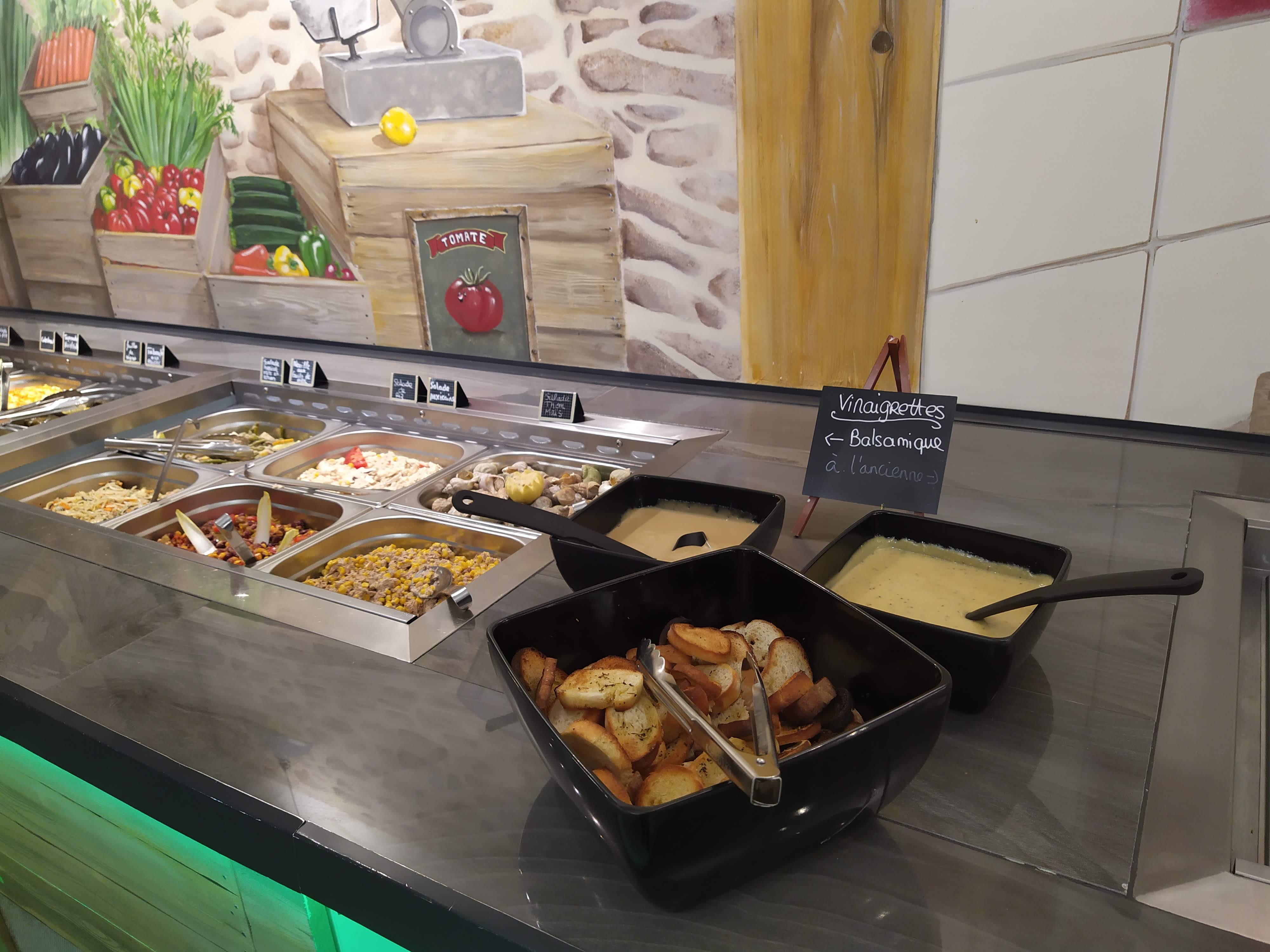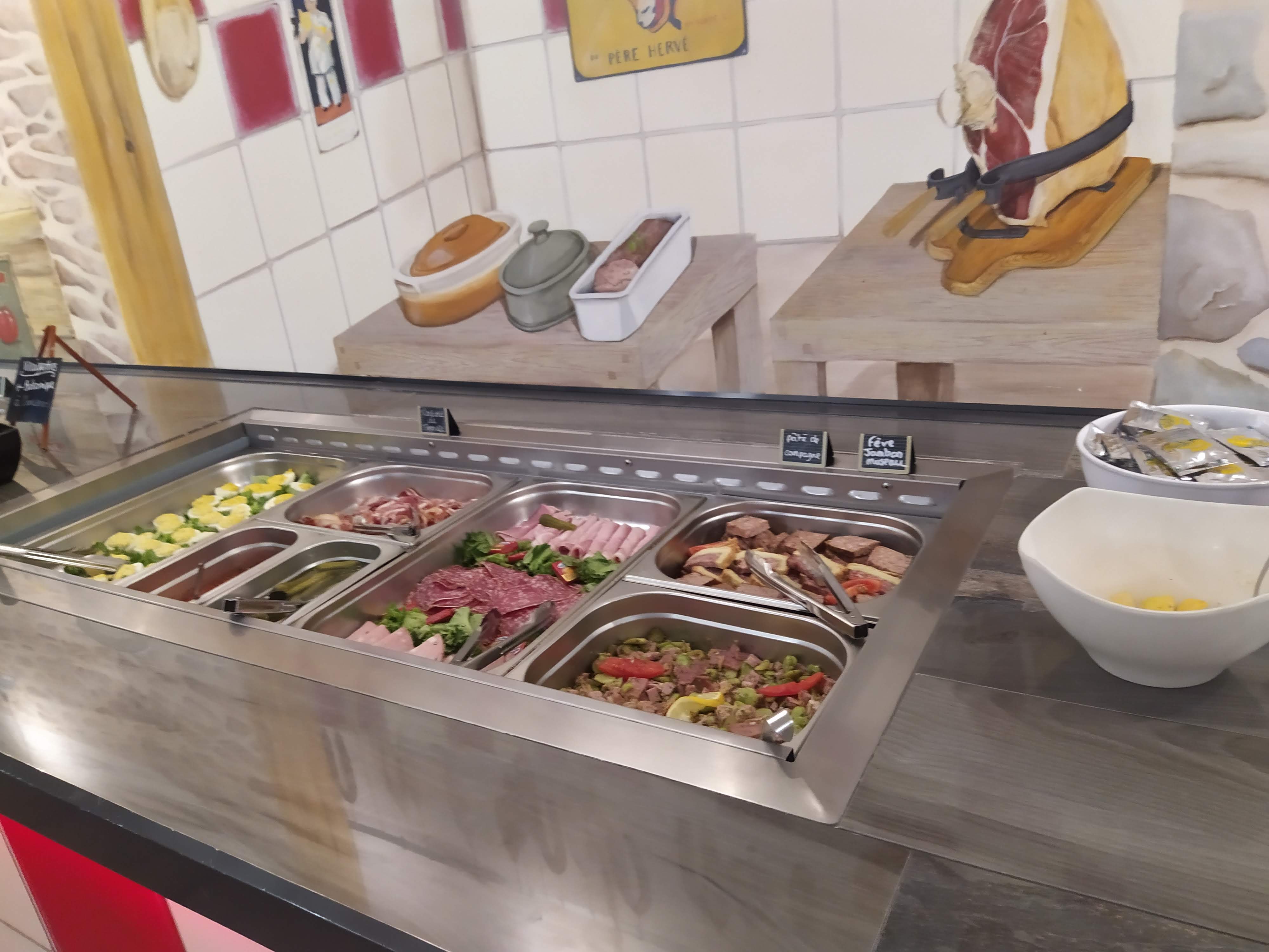 Bon accueil. Les plats chauds restent chauds au moment du service. Assez de choix dans l'ensemble, sauf peut-être pour les légumes. Le soir où j'y suis allée il n'y avait que haricot vert et épis de maïs! Par contre, nous sommes allés manger avec nos petits jumeaux âgés de 3 ans et ça fais cher l'addition pour ce qu'ils mangent à cet âge là...10€ chacun pour avoir mangé 3 frites et un bout de jambon avec 1 sirop.... nous aurions vraiment apprécié un petit geste commercial en nous offrant au moins un repas enfant!!!