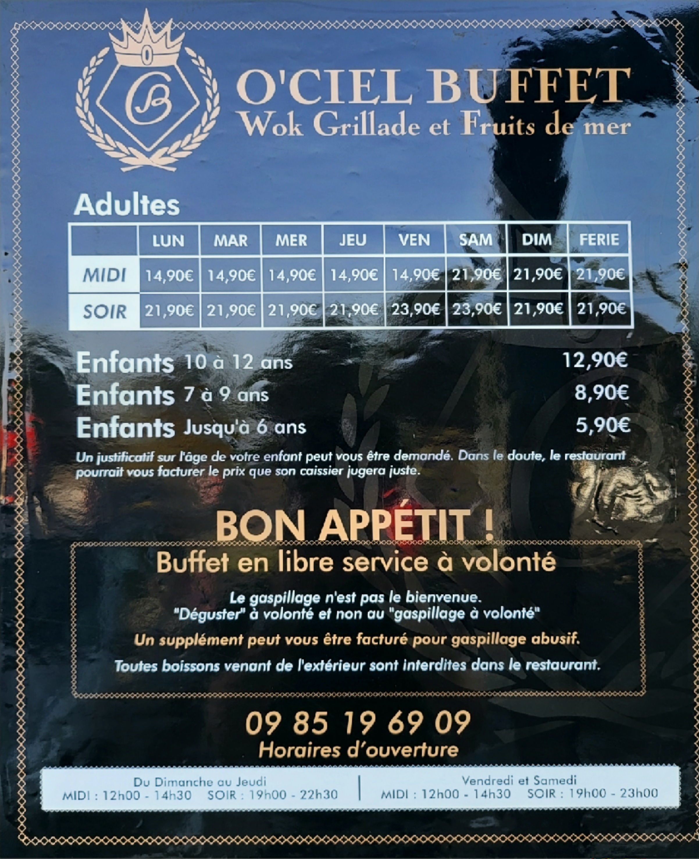 Bonjour, merci pour votre commentaire, cependant je ne peux vous laisse un tel commentaire sans vous répondre. Ce serait une insultes à tous ceux qui nous ont donné 5 étoiles. Vous trouvez que 23,90 c'est chère ? Est-ce que c'est normal pour vos clients d'attendent 20 minutes un entré, 20 minutes le plat et 20 minute pour un dessert et encore 20 minutes pour régler la note dans vos restaurant de viande (la boucherie??) Chez nous pour 23,9€ vous avez des Huître à volonté, côte de beauf à volonté, saumon à volonté, crevettes gambas à volonté, du gigot à volonté, un chef wok qui cuisine des plats sur mesure, les macarons à volonté, un large choix de charcuterie, et un large choix de fromages. Si dans vos restaurants je prends un entré, un plat, un dessert(sûrement en surgelés mais contrairement à nous m, mvous n'informez pas à vos clients.) Je suis sûr que je vais payer 30-40 euros. Alors que à O'ciel Buffet tout est à volonté pour 23,9. Vous avez dit que pour 8 euros de moins, on trouve la même qualité dans des restaurants pas loin. Donc 23,9-8=15,9€ ????? Un buffet à 15,9euros? Il est où ce restaurant ? J'aimerais bien avoir son adresse pour aller comparer un peu. J'espère que vous n'avez pas menti pour avoir raison sur votre commentaire car vous avez dit que vous allez souvent aux restaurant buffet. Au vu de la situation actuelle du prix d'essence, j'espère que vous êtes assez futé de ne pas dépenser 20 euros d'essence pour aller manger un restaurant 8 euros moins cher en week-end et 6 euros moins cher dans la semaine. Info bonus à midi chez nous c'est 14,9€ donc 14,9-8= 6,9euros un buffet à midi ? Pour fini, contrairement à vos restaurants de viande qui sont une chaîne de restaurant et qui pense que aux rendements et delaisse les clients car vous employez moins de personnelles possible et qui gâchis l'expérience avec un attend interminable. Nous sommes independant et nous justifions notre prix par la qualité des produits , la qualité des services, la rapidité et la variété des choix. Je vous remercie quand même pour votre visite. même si votre commentaire est peu solide Cordialement