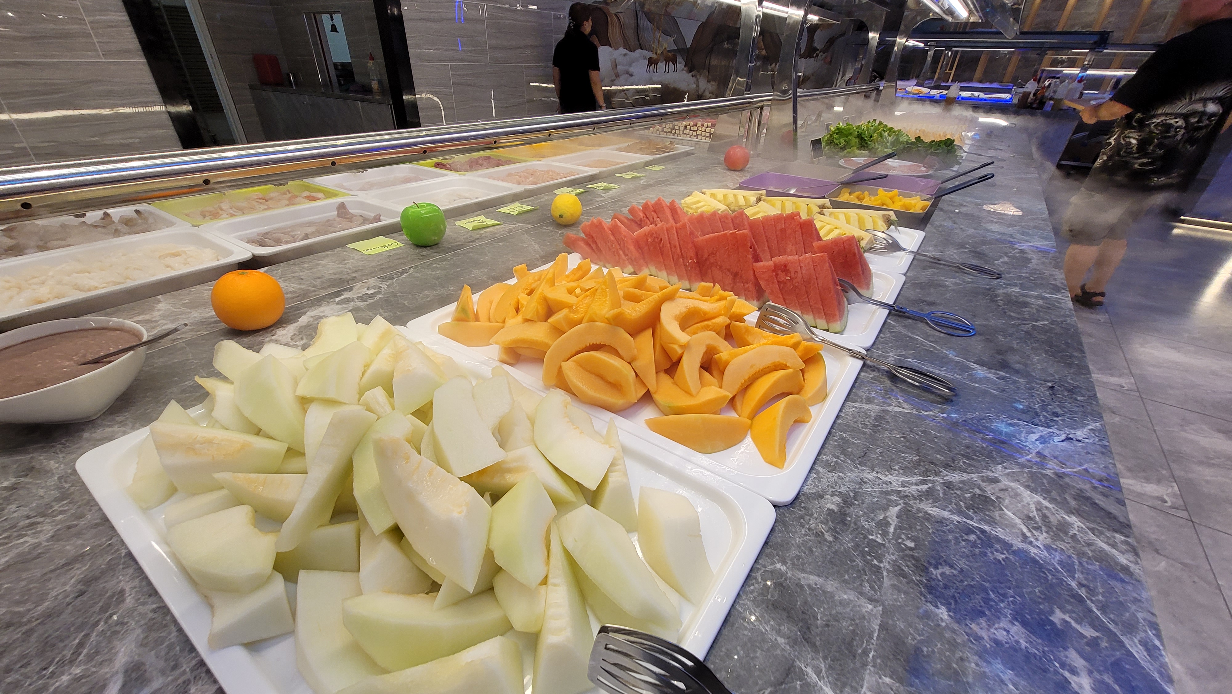 Pour une première à midi, excellente qualité sur tout : crevettes, canard laqué, bœuf sauté oignons, nems au porc ( quoique un peu trop secs), rouleaux de printemps, petites aumônières aux légumes, croquettes de pomme de terre, minis desserts au top et buffet de fruits frais excellentissime (goûteux, frais, mûrs, sucrés, juteux : au top !!), ajoutez à ça un buffet de choix pour le wok ! Spacieux, propre et bon rapport qualité-prix :)
