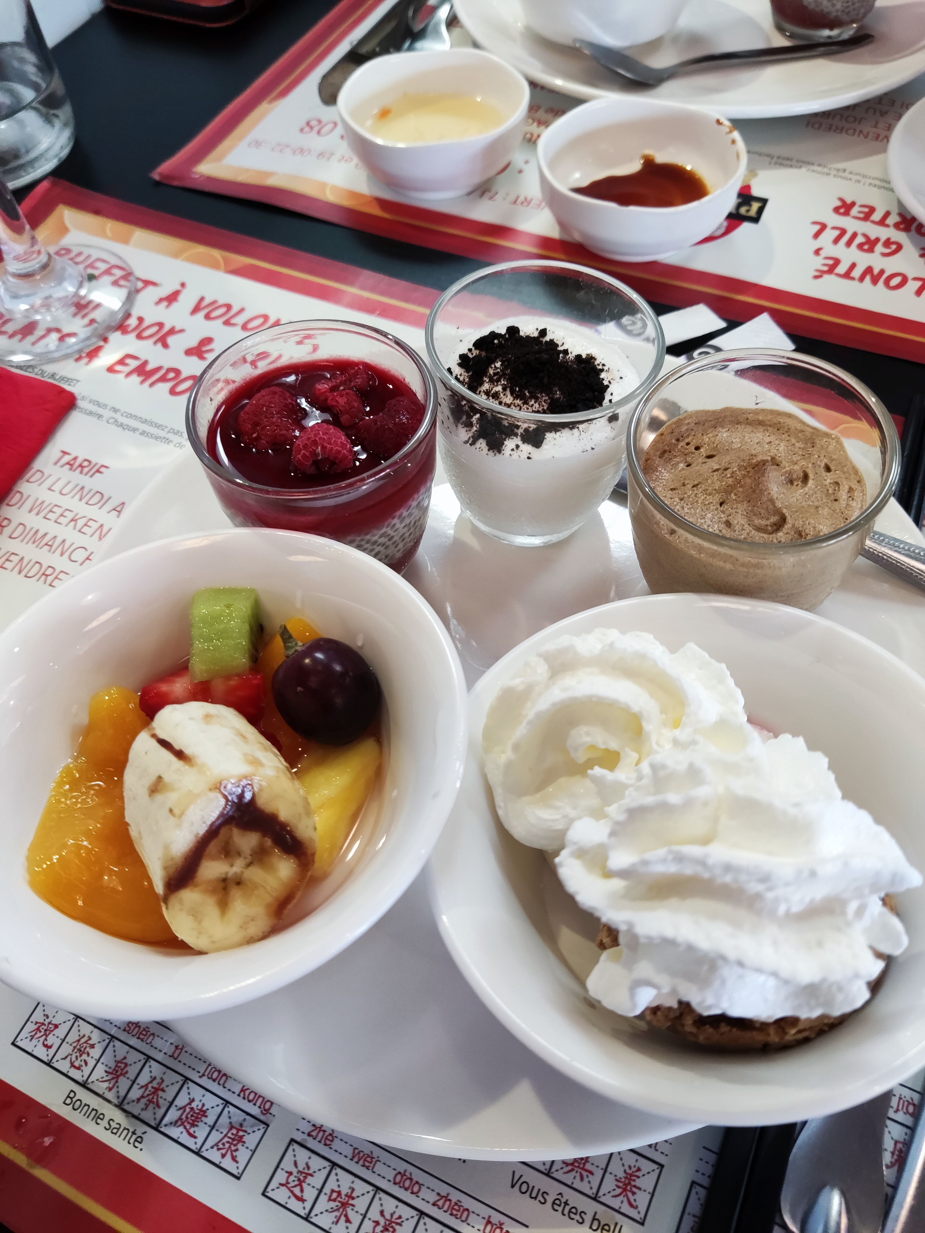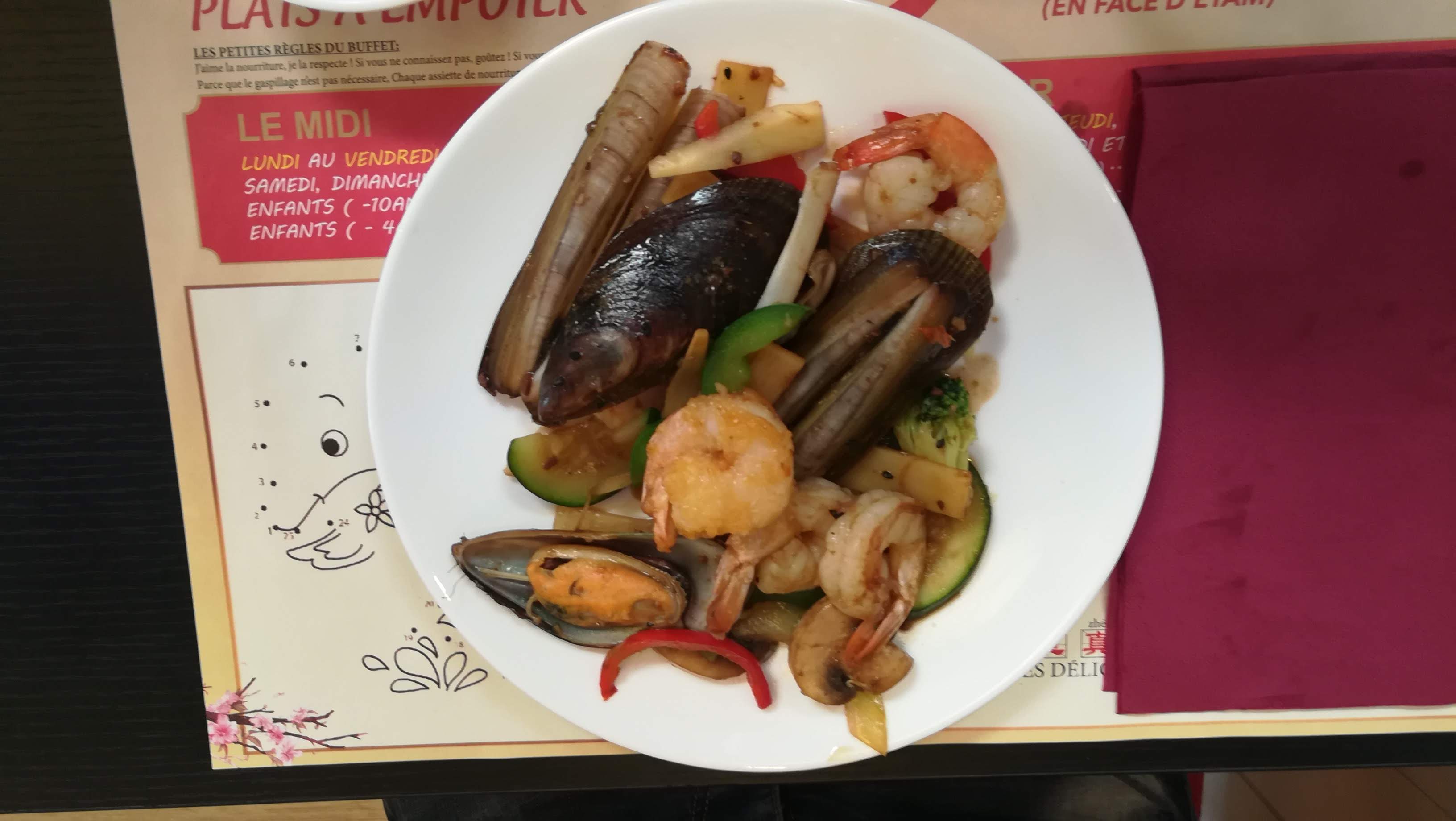 Ceci n'est pas un restaurant chinois. Buffet composé à 80% de plat français (saucisson, camembert, emmental, fromage pané). Un vrai pique nique avec du taboulé, des betterave râpé, des tomate cerise etc. Les salades ne sont pas très fraiches (je n'est pas osé goûter) Beaucoup de poisson crustacé (crabe entier, huître, bulots, escargot) Les wok teste des brochettes de saumon (pleins d'eau, pas salé) Les desserts sont 99% français et industriels, vous pouvez trouvez des mochis à faire chauffer au micro onde. Enfin bref je vais dans un restaurant chinois qui ne propose même pas de baguette pour manger et 25euros quand même c'est excessif pour ce que jai mangé. Le personnel est agréable heureusement Moi qui suis fan des restaurant asiatique je vous déconseille vraiment le lieu si vous rechercher un restaurant asiatique