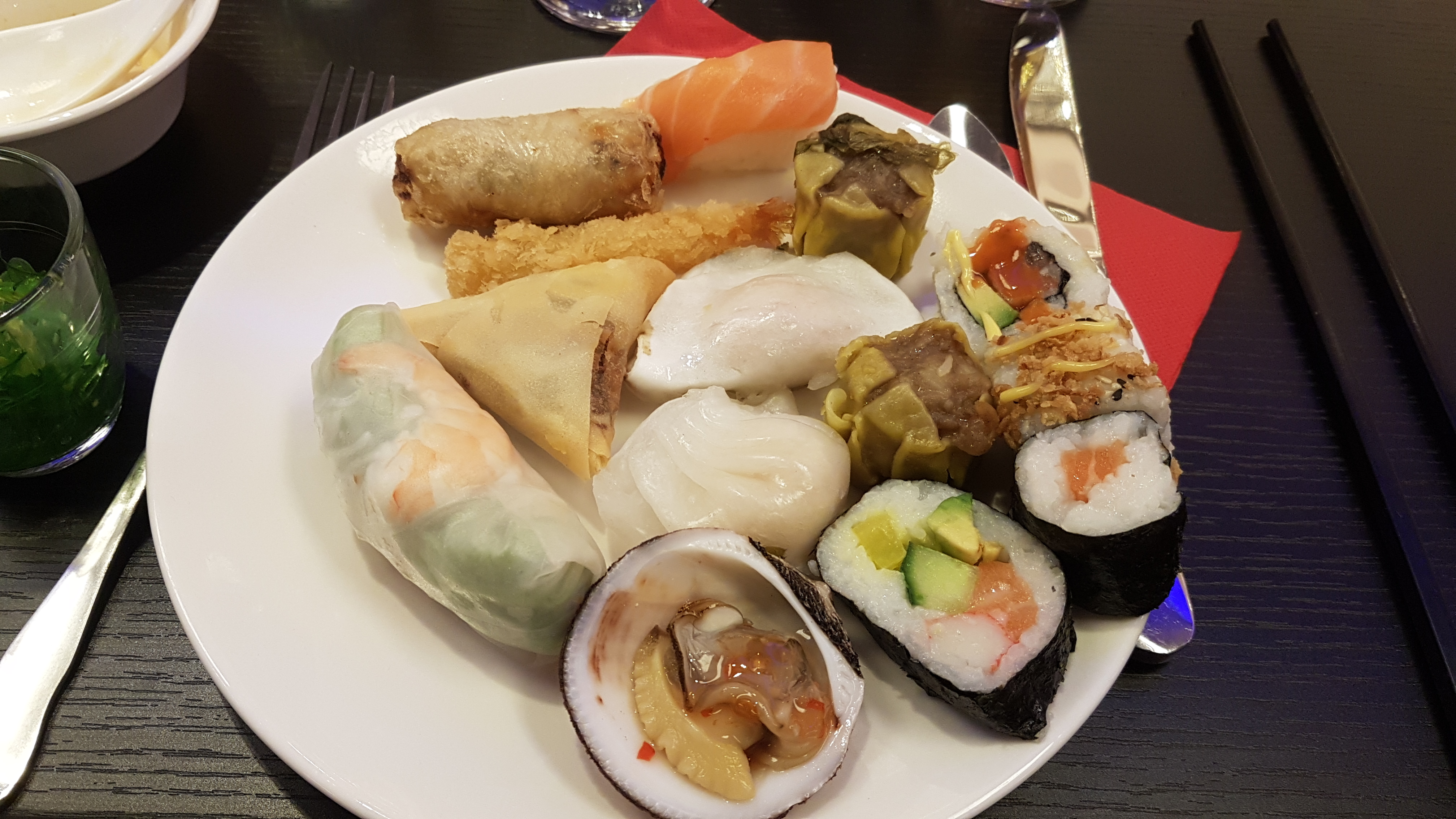 Accueil super, gros plus sur les coquillages et la beauté des sushis sans oublier des nems haut de gamme. Wok sympa, Par contre, effort à faire sur la variété des entrées et plats chauds pour se démarquer de la concurrence.