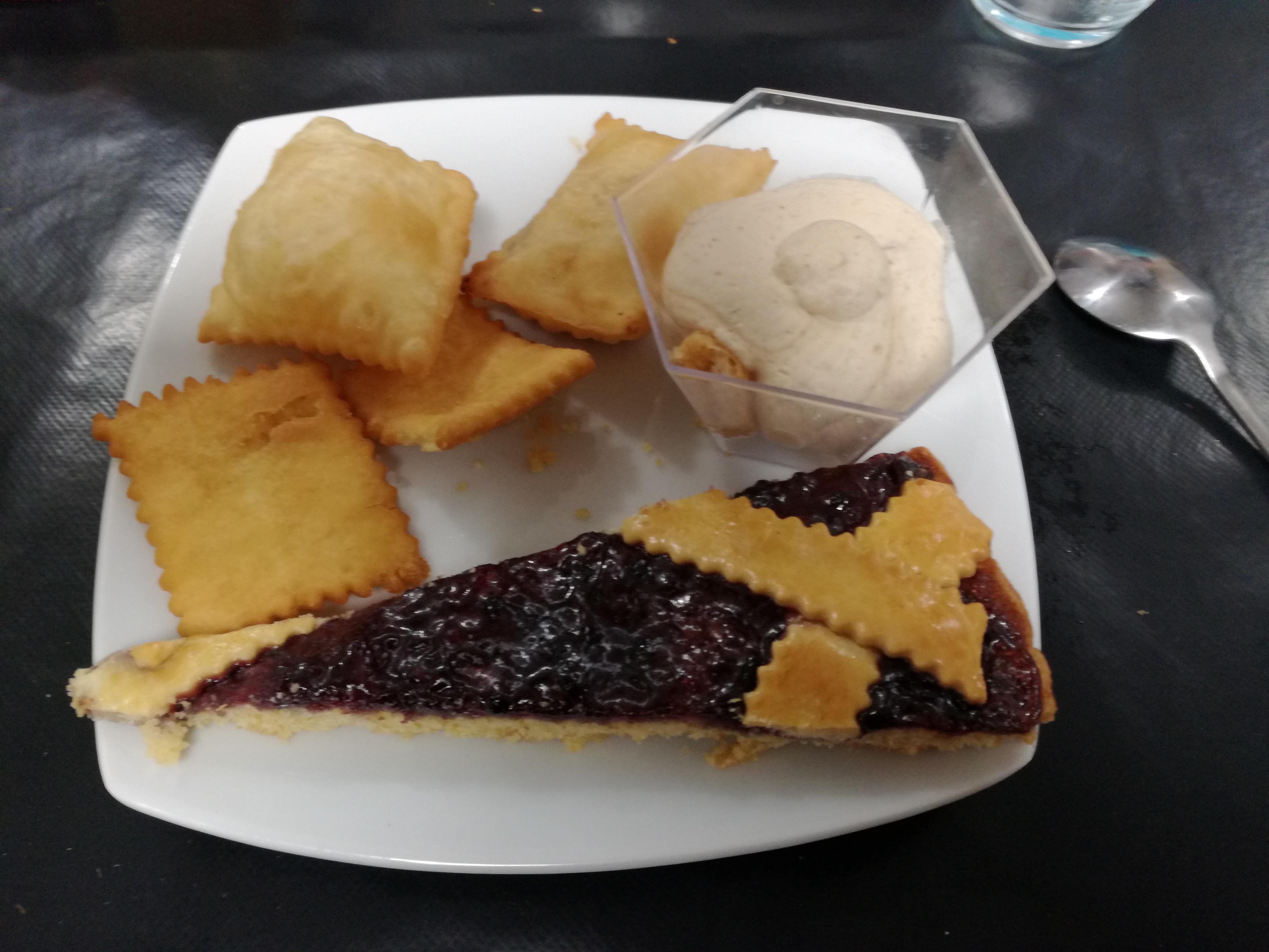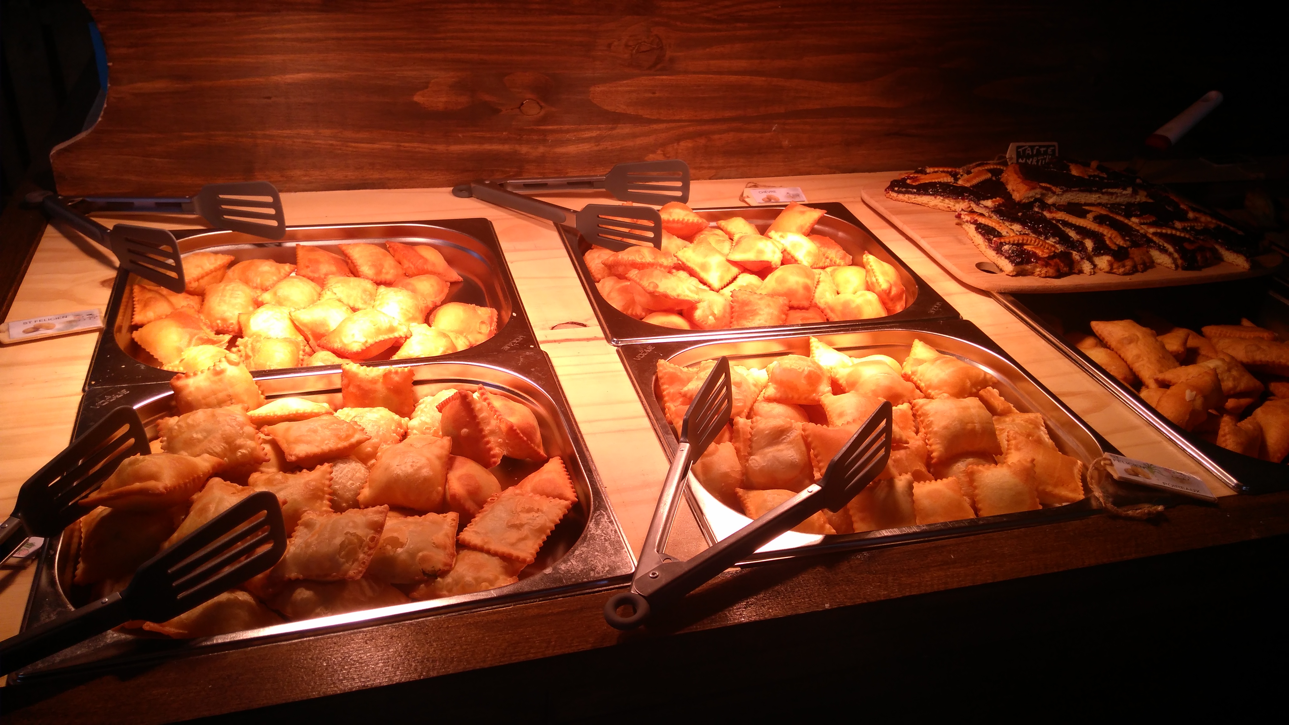Le repas fut excellent : les tourtons sont légers et variés (on pourrait espérer plus de choix dans les sucrés) et la charcuterie et les ravioles délicieuses. Le tout est servi avec un grand professionnalisme et beaucoup de sympathie. Mais nous y sommes peut-être allés au mauvais moment : la promesse du tourton à volonté semble difficile à tenir. Je me suis levé plusieurs fois pour me resservir, sans succès, pour finir par abandonner et passer aux desserts.