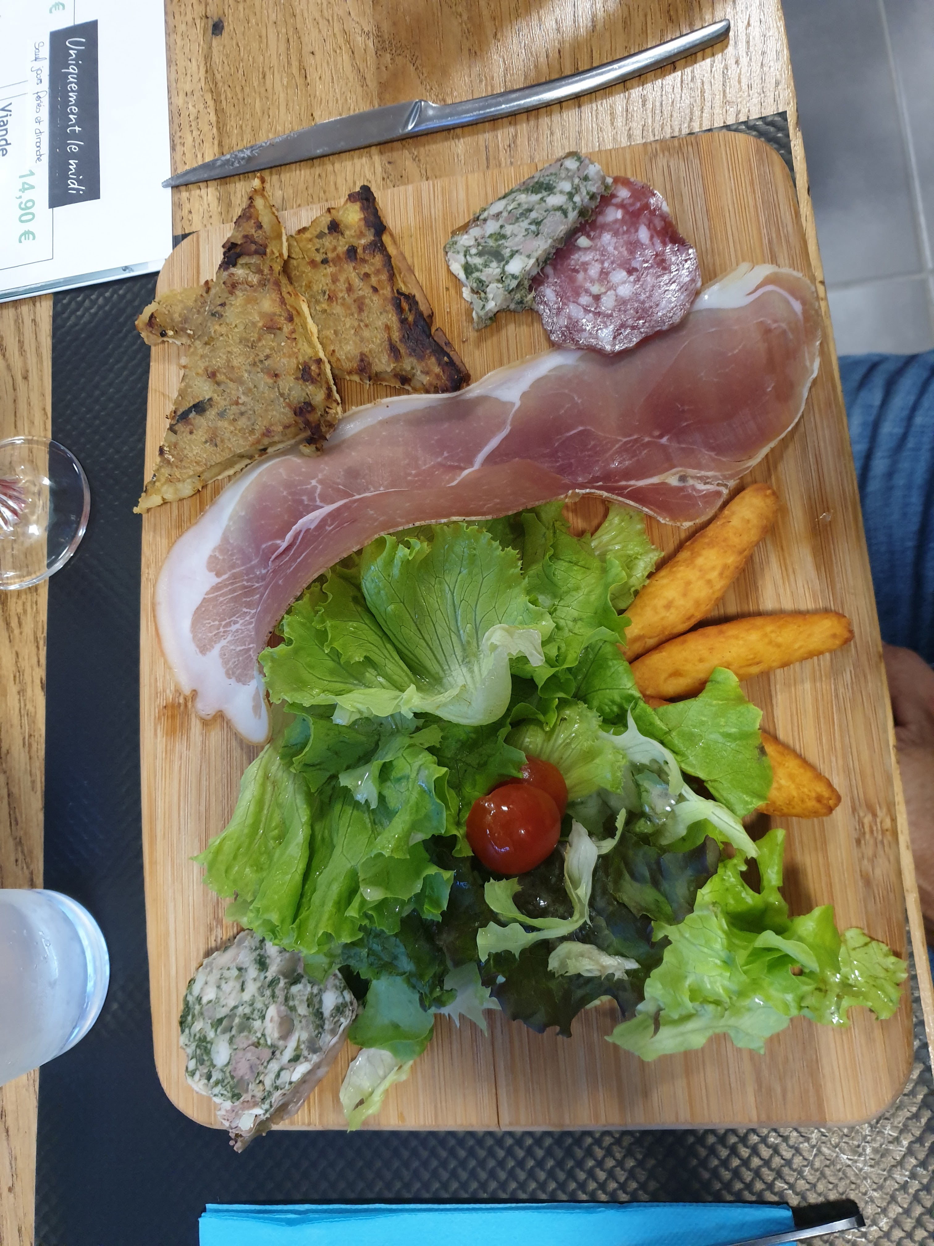 Peut-être du fait maison , mais dans tous les cas la cuisine est très fade ... idem pour la charcuterie ( peu goûtue ) servie avec une salade très peu assaisonnée. Les portions de gratins sont ridiculement petites et le service en barquette en carton peu appétissant. L'organisation et l'hygiène des toilettes est à revoir : papier WC à même le sol et 1 seule et même serviette pour tout le restaurant pour s'essuyer les mains ! Le cadre est sympa .