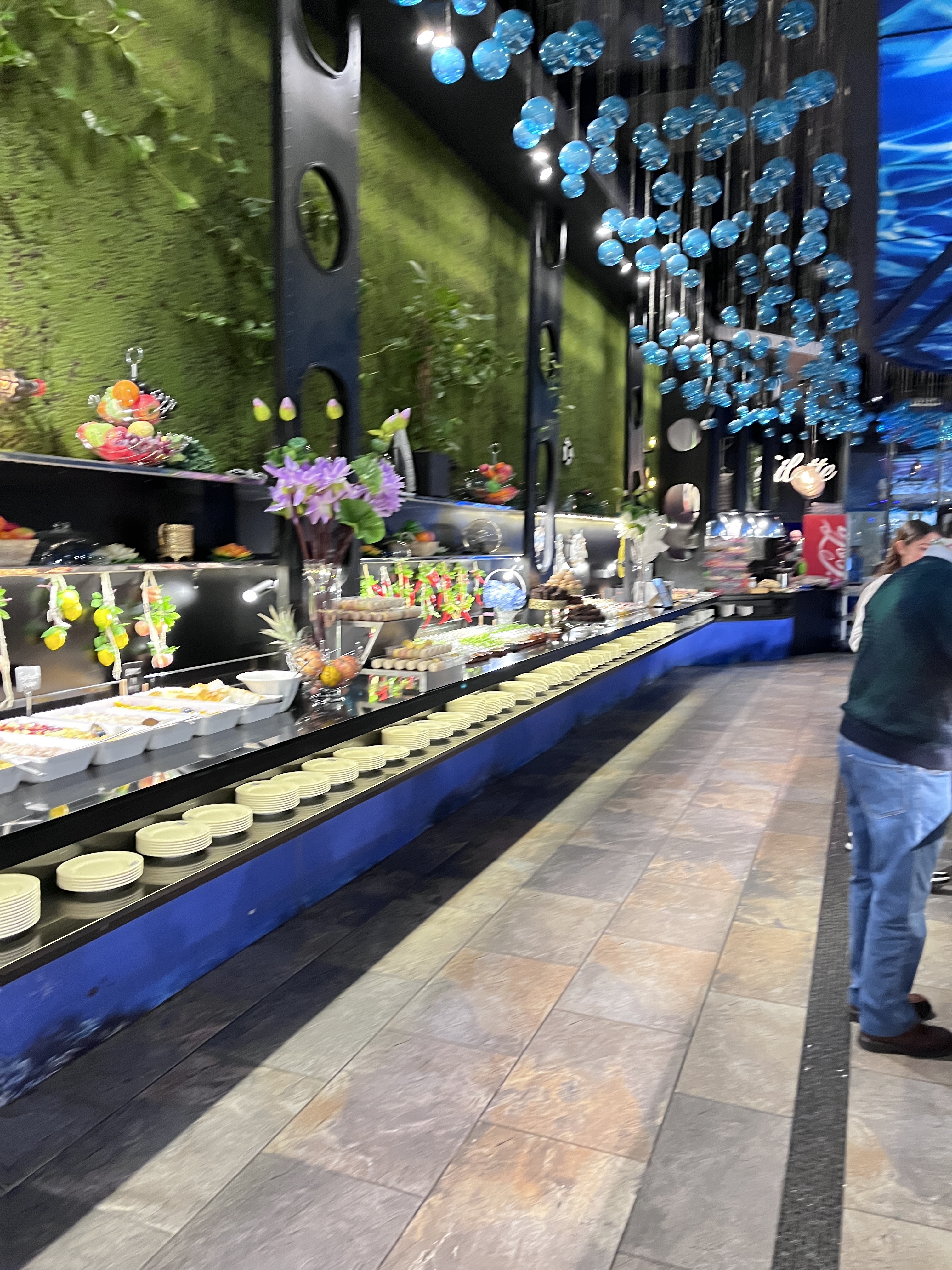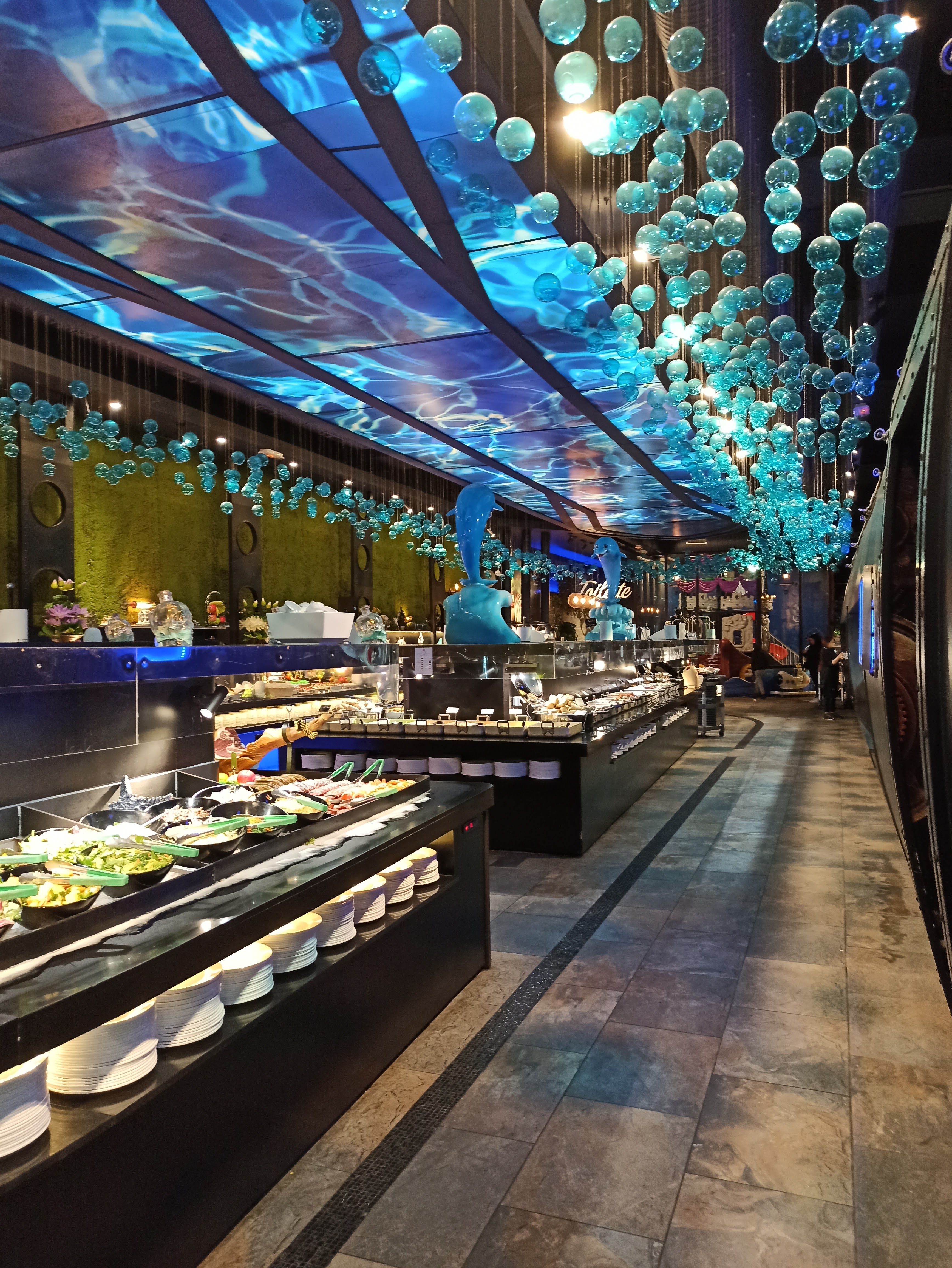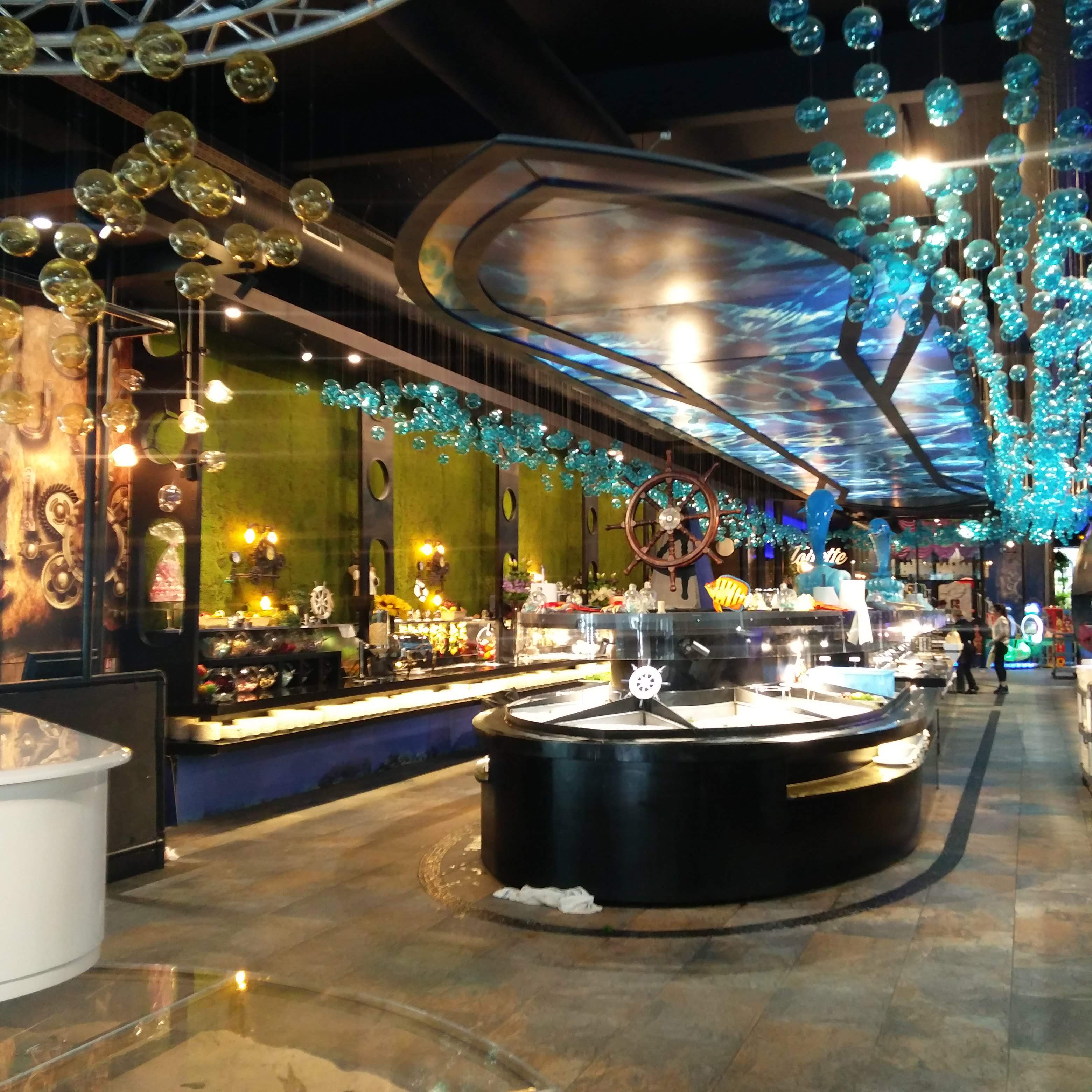 Expérience au top dans un cadre magnifique. Le restaurant vous accueille dans un décor sous-marin pour un buffet à volonté pour 15€ le midi et 20€ le soir, les enfants de 3 à 10 ans se régaleront pour 10€ le midi et le soir. Le buffet comprend divers plats asiatiques des sushis au porc au caramel. Vous dégusterez également de la viande grillée sur place à la plancha. Il y a une multitude d'entrées et de desserts qui vous attendent. Les enfants, et les plus gourmands, pourront se faire plaisir avec le coin bonbons et crêpes faites sur place. Seuls les boissons sont à la carte. L'équipe est très accueillante. Le restaurant et la vaisselle très propre.