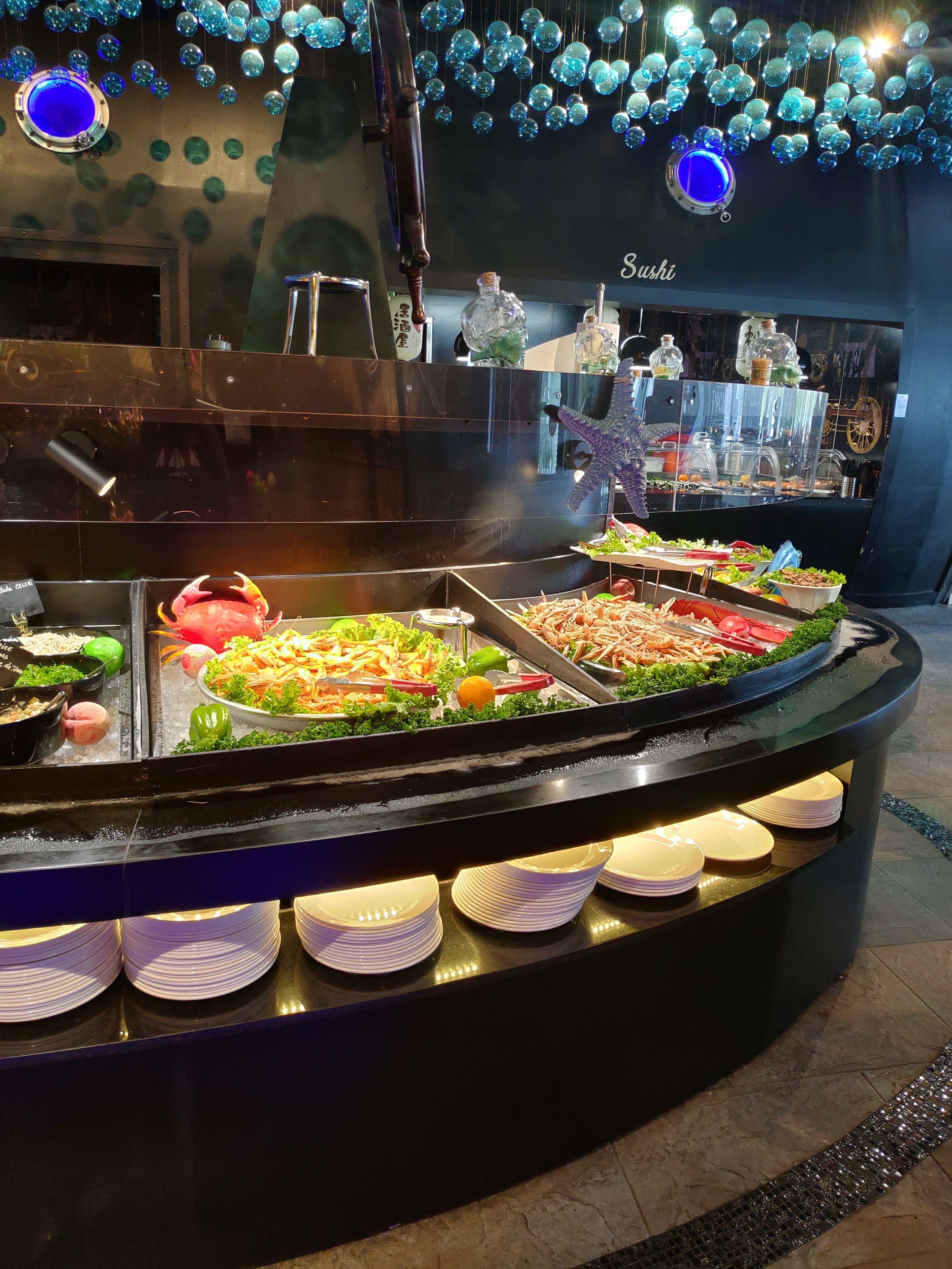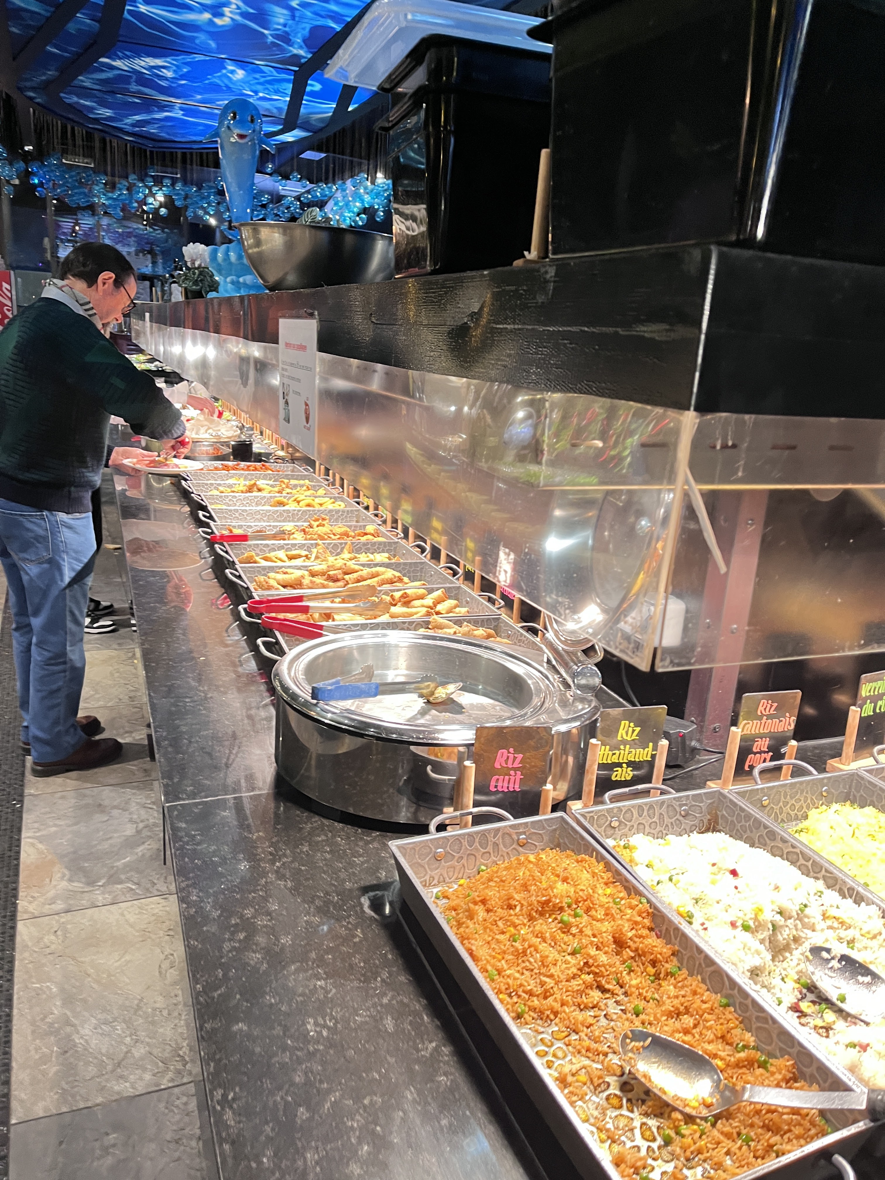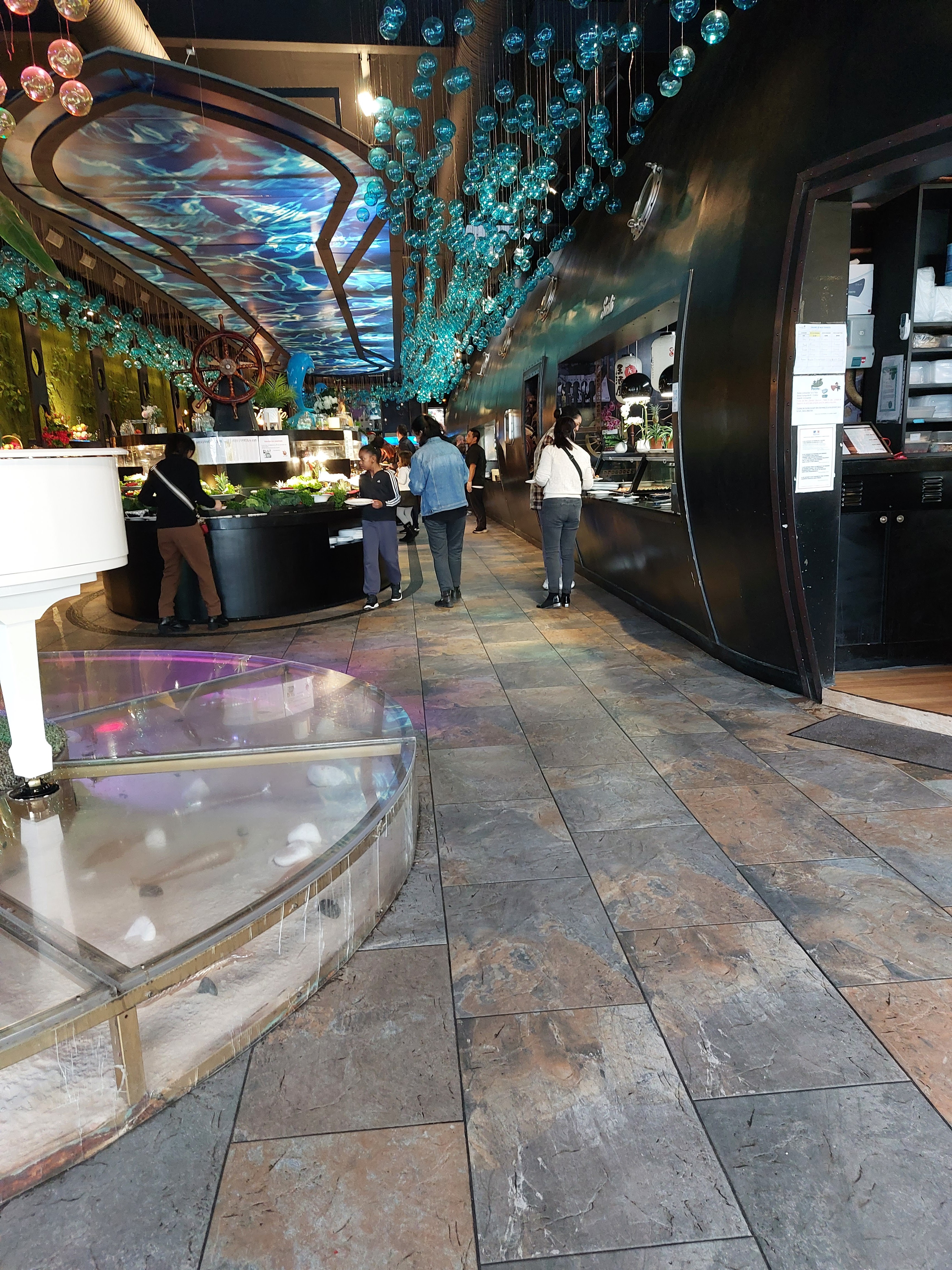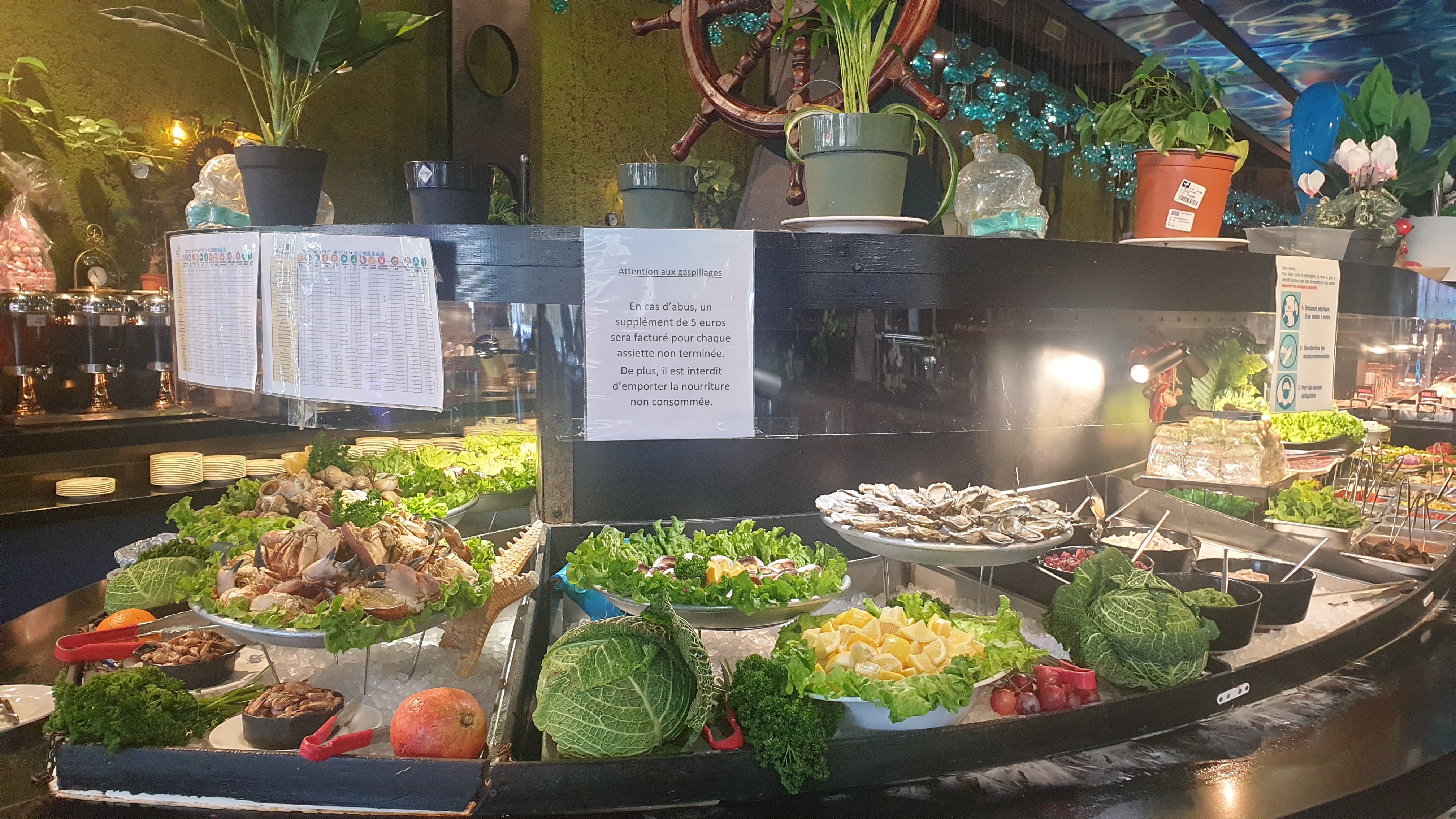 Ce restaurant à des point positifs et négatifs. En rentrant un bon point on nous donne des gants et les clients les respectent par rapport à d’autre bàv en ont pas du tout. C’est assez grands mais assez bruyant, la décoration est super je trouves, dans l’univers marin et je met 5* pour ça , mais le point négatif c’est le buffet les plats chauds sont la plupart +ou- froid dans l’ensemble c’est pas terrible, les nems la peau est sèche et dur immangeable, le gigot d’agneau très sec…je ne me suis pas trop régaler. On a été bien accueillit et servis sinon 👍🏼 , un +, de la musique car avec tout le bruit ça fait du bien d’entendre autre que ça. Conclusion Je reviendrais pas pour moi dommage, car c’est un jolie restaurant , mais la nourriture ne suis pas. Note global je met 3*
