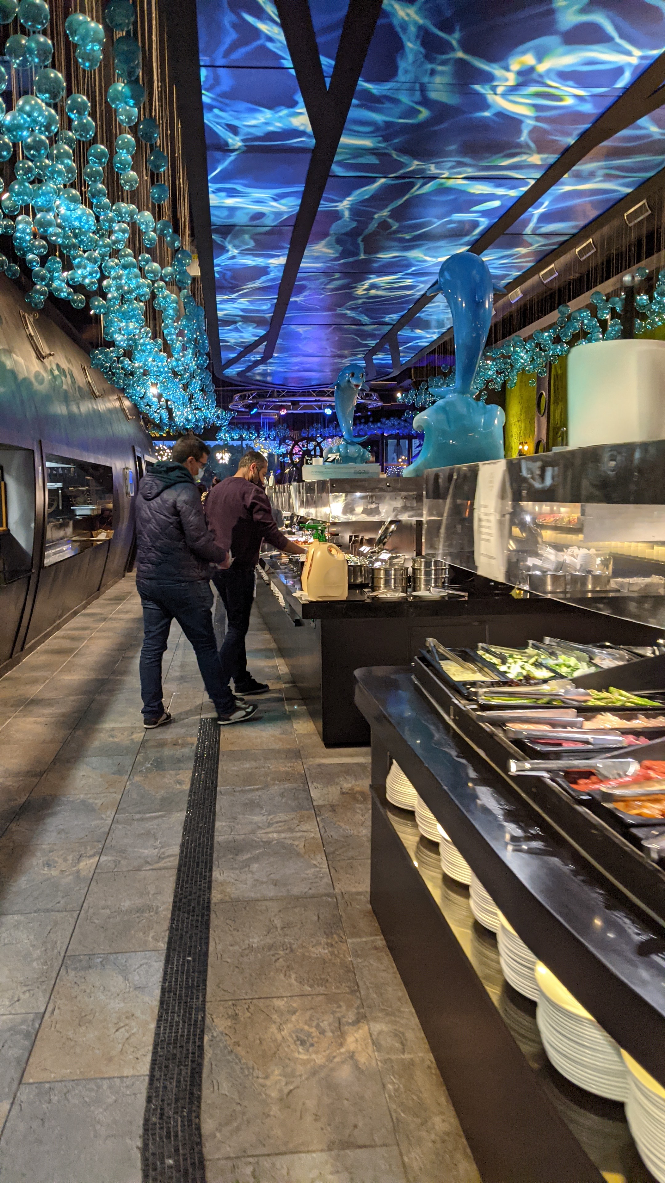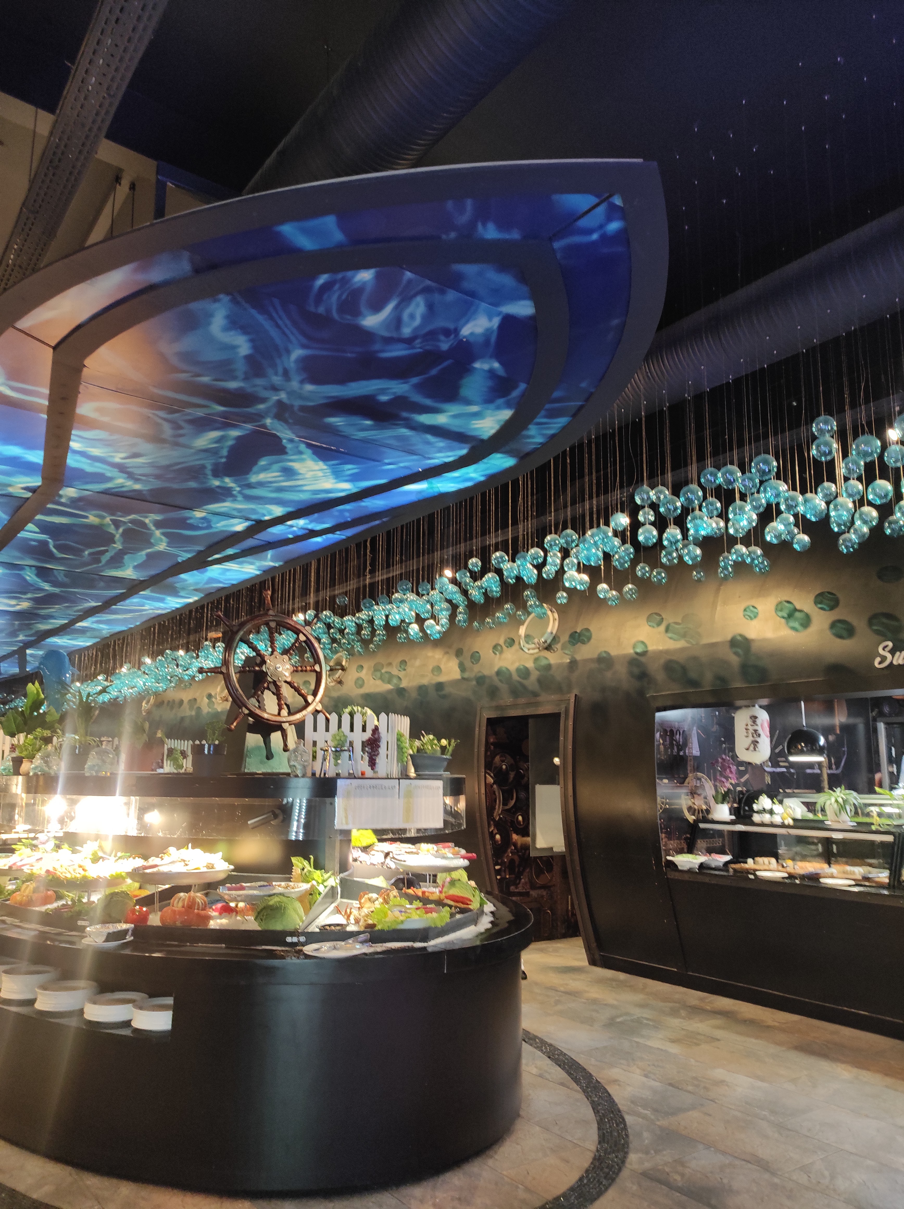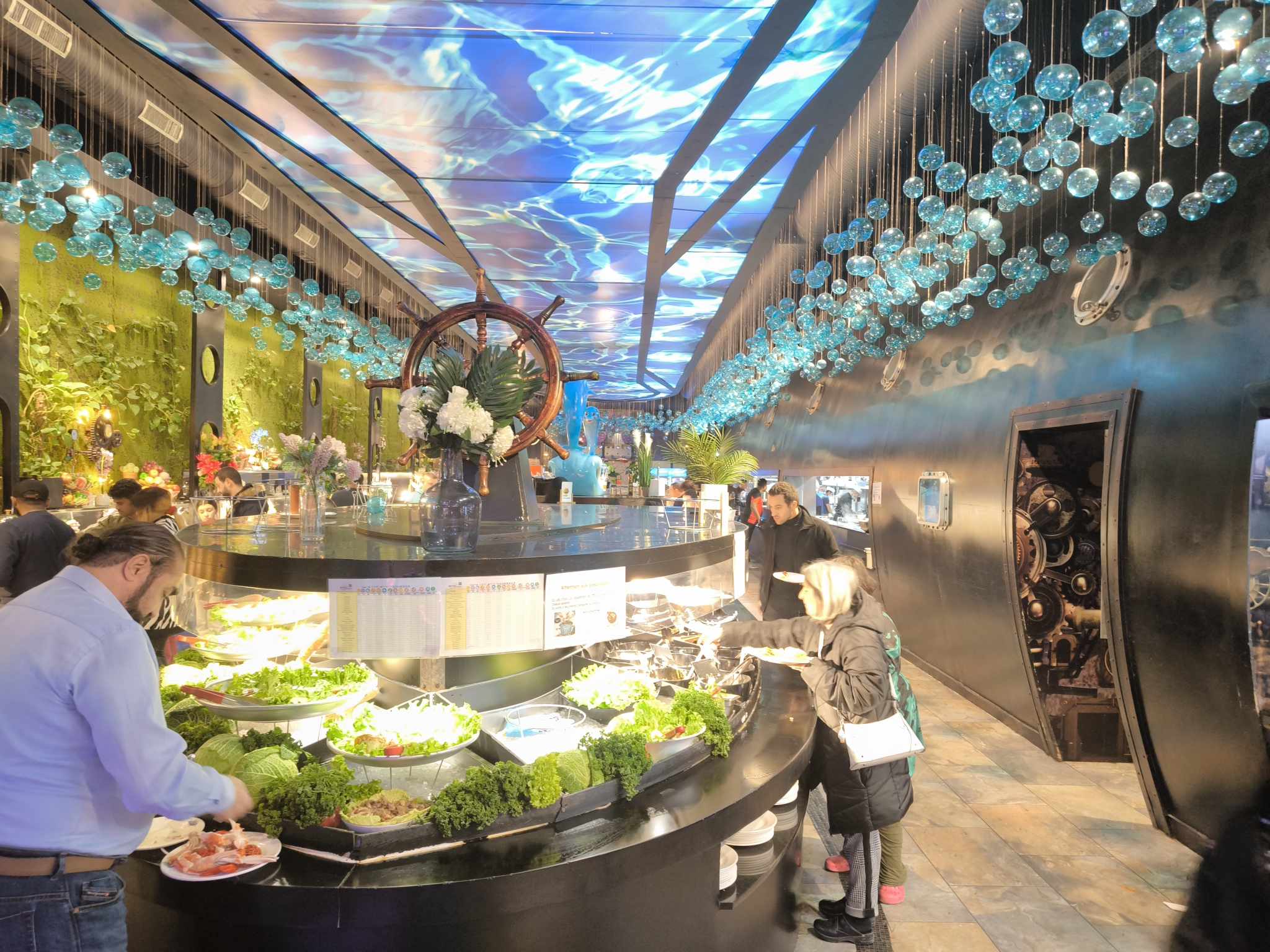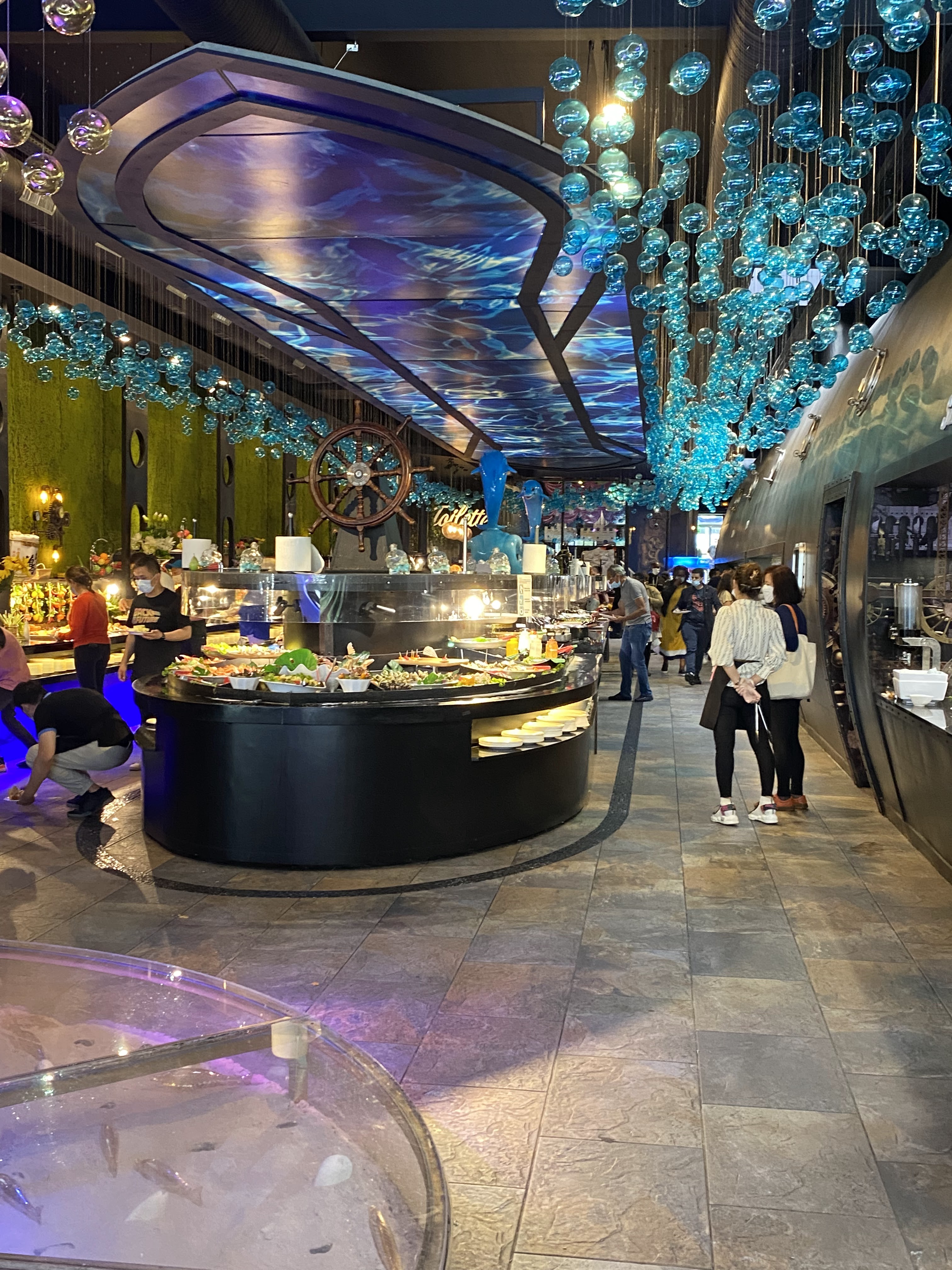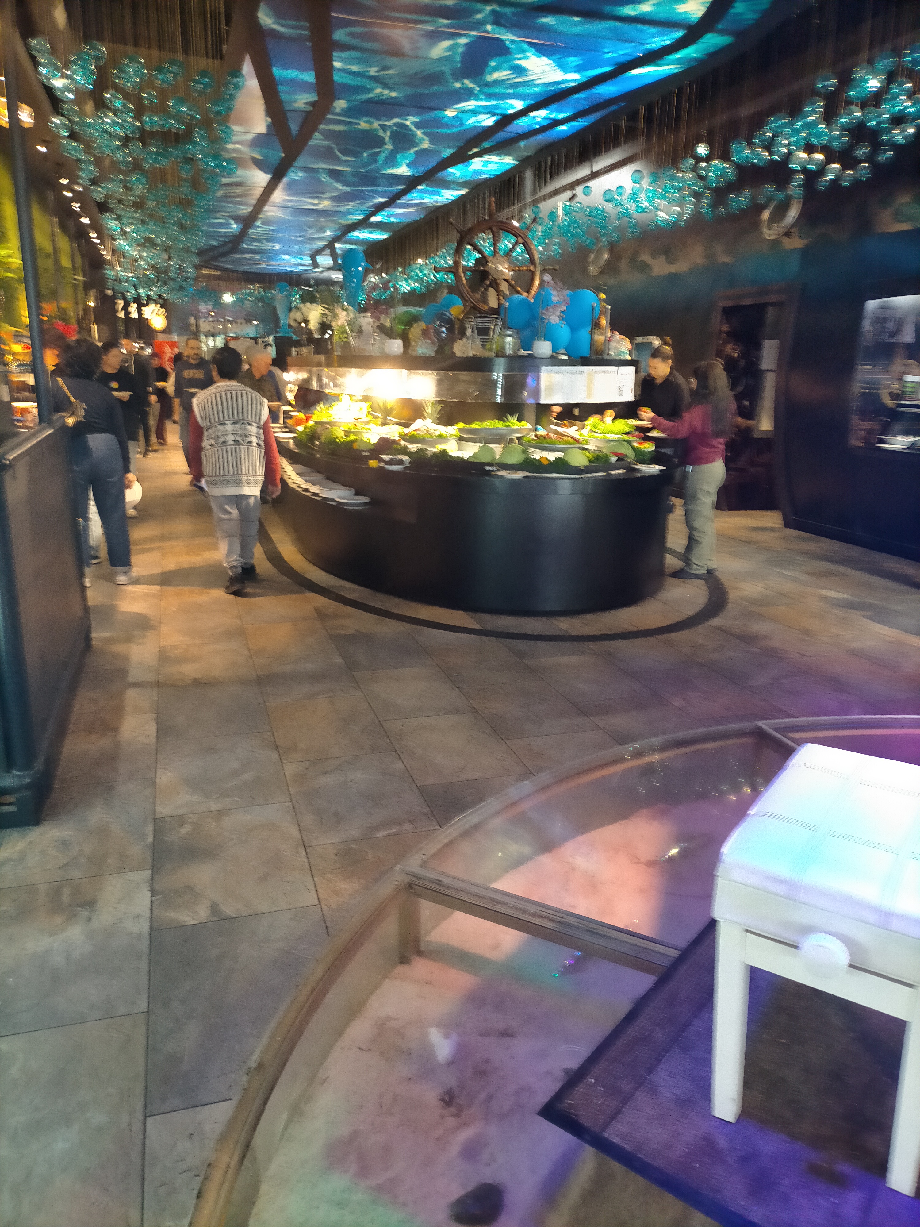 Ce restaurant à des point positifs et négatifs. En rentrant un bon point on nous donne des gants et les clients les respectent par rapport à d’autre bàv en ont pas du tout. C’est assez grands mais assez bruyant, la décoration est super je trouves, dans l’univers marin et je met 5* pour ça , mais le point négatif c’est le buffet les plats chauds sont la plupart +ou- froid dans l’ensemble c’est pas terrible, les nems la peau est sèche et dur immangeable, le gigot d’agneau très sec…je ne me suis pas trop régaler. On a été bien accueillit et servis sinon 👍🏼 , un +, de la musique car avec tout le bruit ça fait du bien d’entendre autre que ça. Conclusion Je reviendrais pas pour moi dommage, car c’est un jolie restaurant , mais la nourriture ne suis pas. Note global je met 3*