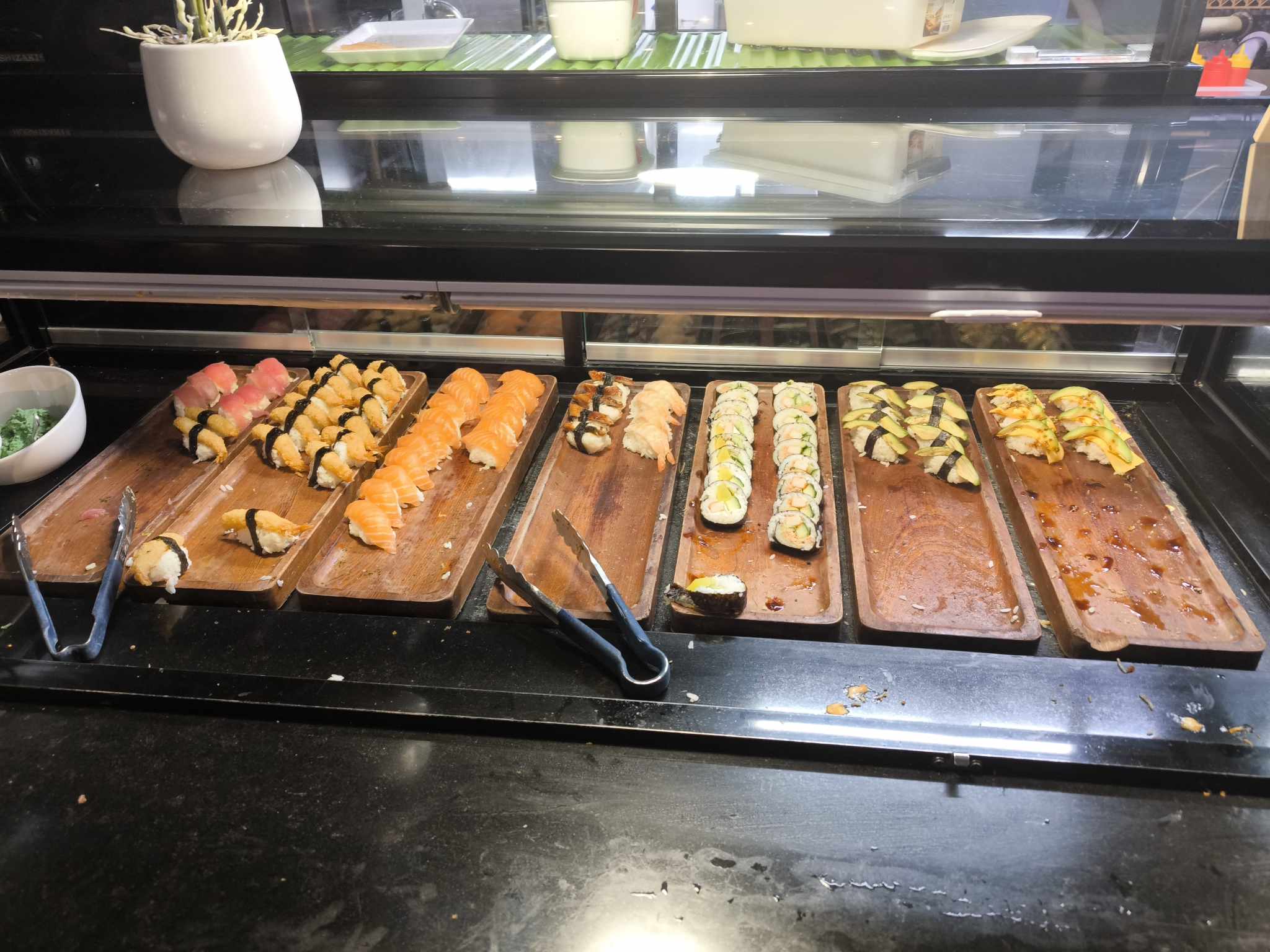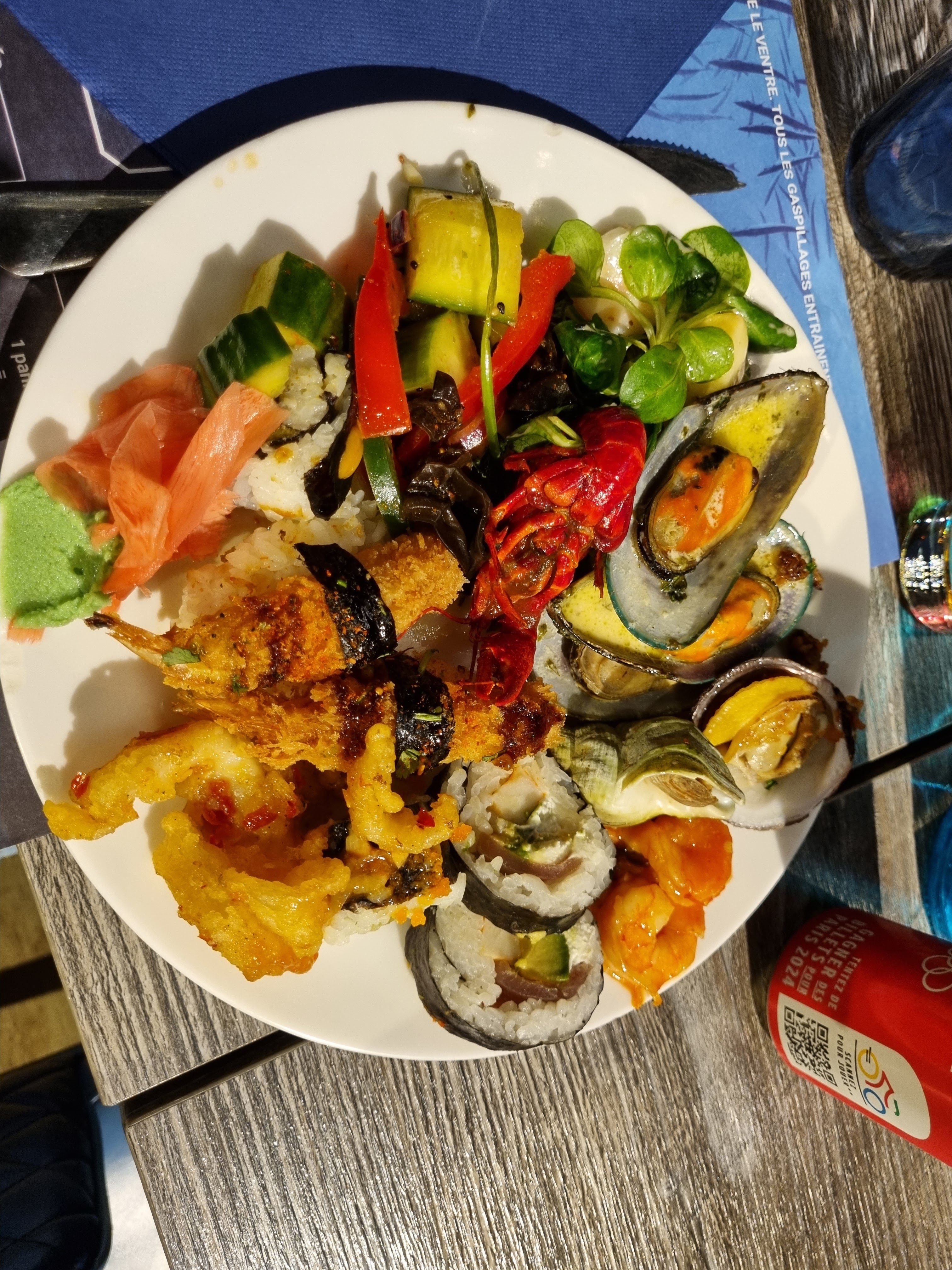 Lieu calme le midi (plus bruyant le soir) et très convivial. Les serveuses et serveurs sont à l'écoute des clients. Quand au choix, il est faramineux. Japonais, chinois, charcuteries, fromages, desserts, tout le monde y trouve son compte. Je referai avec plaisir.