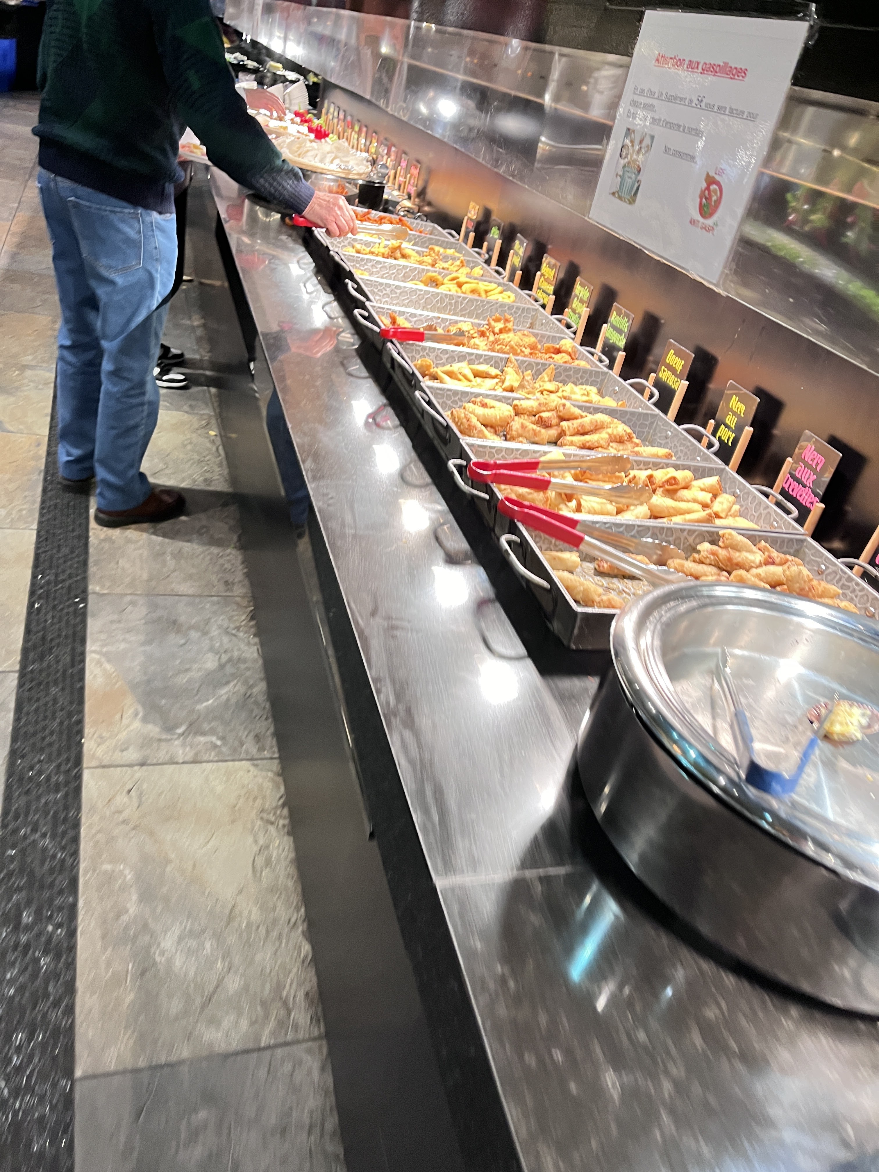 Formidable ! Buffet à volonté très bien achalandé ; fruits de mer, japonnais, charcuterie, chinois, viandes et poissons, légumes frites, fromage, desserts, bar à bonbons Des serveurs très souriants, les cuisiniers pour les grillades et les wok très efficace Vois arrivez on vous installe (trois salles et une terrasse) vous commander votre boisson et après libre choix en dévalant dans les allées du buffet Vous payez votre menu et boissons en sus à la toute fin et vous montrez vos ticket pour sortir ⚠️ Énormément de monde queue interminable. Venir impérativement avant 20:30