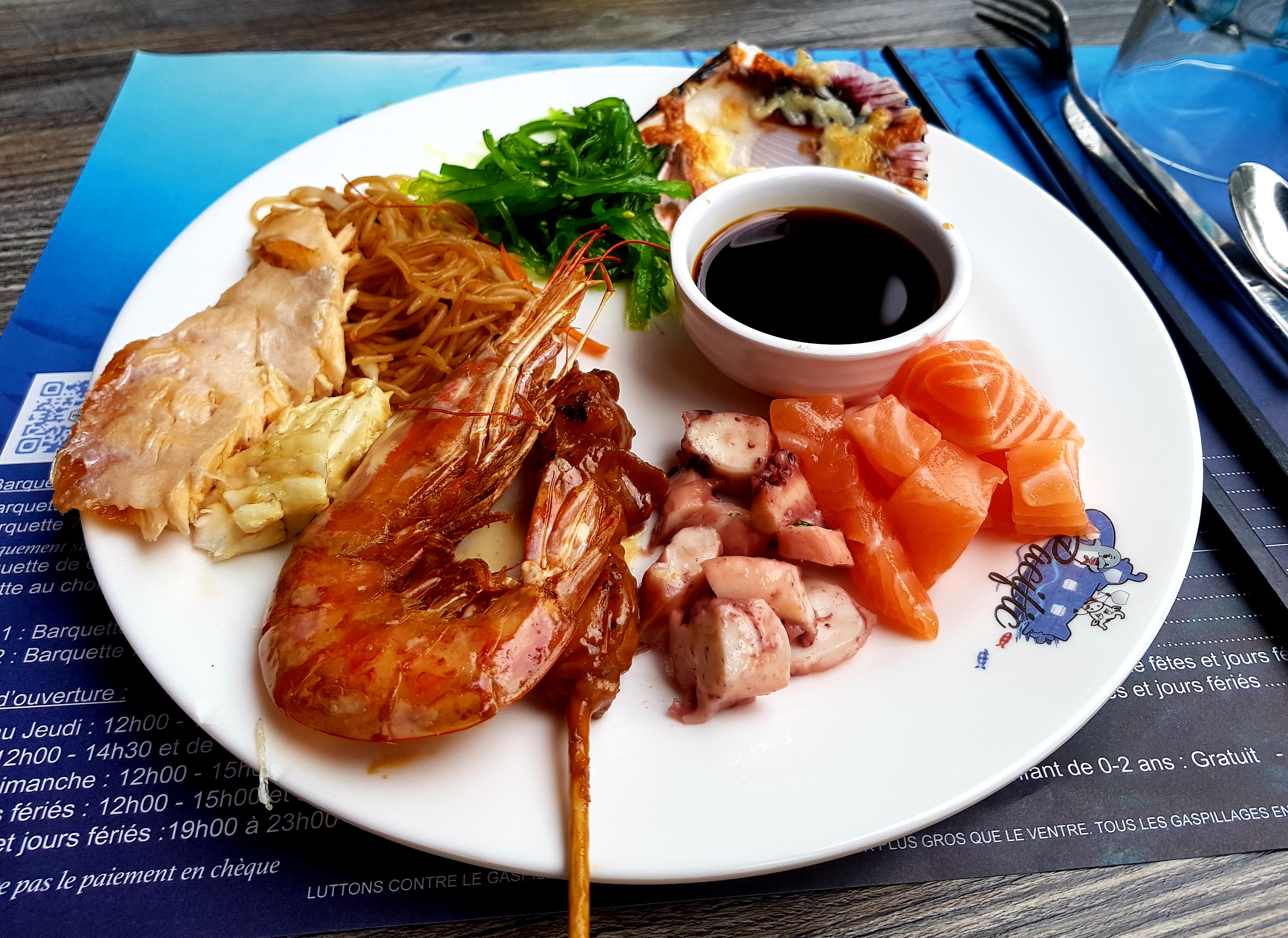 Bonjour tout le monde ! Nous cherchions un restaurant à volonté pour satisfaire aussi bien les adultes que les enfants. Nous avons l'habitude d'en faire mais souvent dans le même secteur. Celui-ci est un peu caché malheureusement et de l'extérieur on ne peut pas imaginer la beauté du lieu. Un choix IMMENSE de nourriture, crustacés cru et cuit, des entrées, des sushis et makis, de l'indien (naan nature et au fromage) cuit sous nos yeux, des desserts à perte de vu, un espace de jeux pour les enfants, des bonbons, des crêpes...... il faut y aller pour voir ! De plus, la décoration est très jolie. Je conseille à 200%