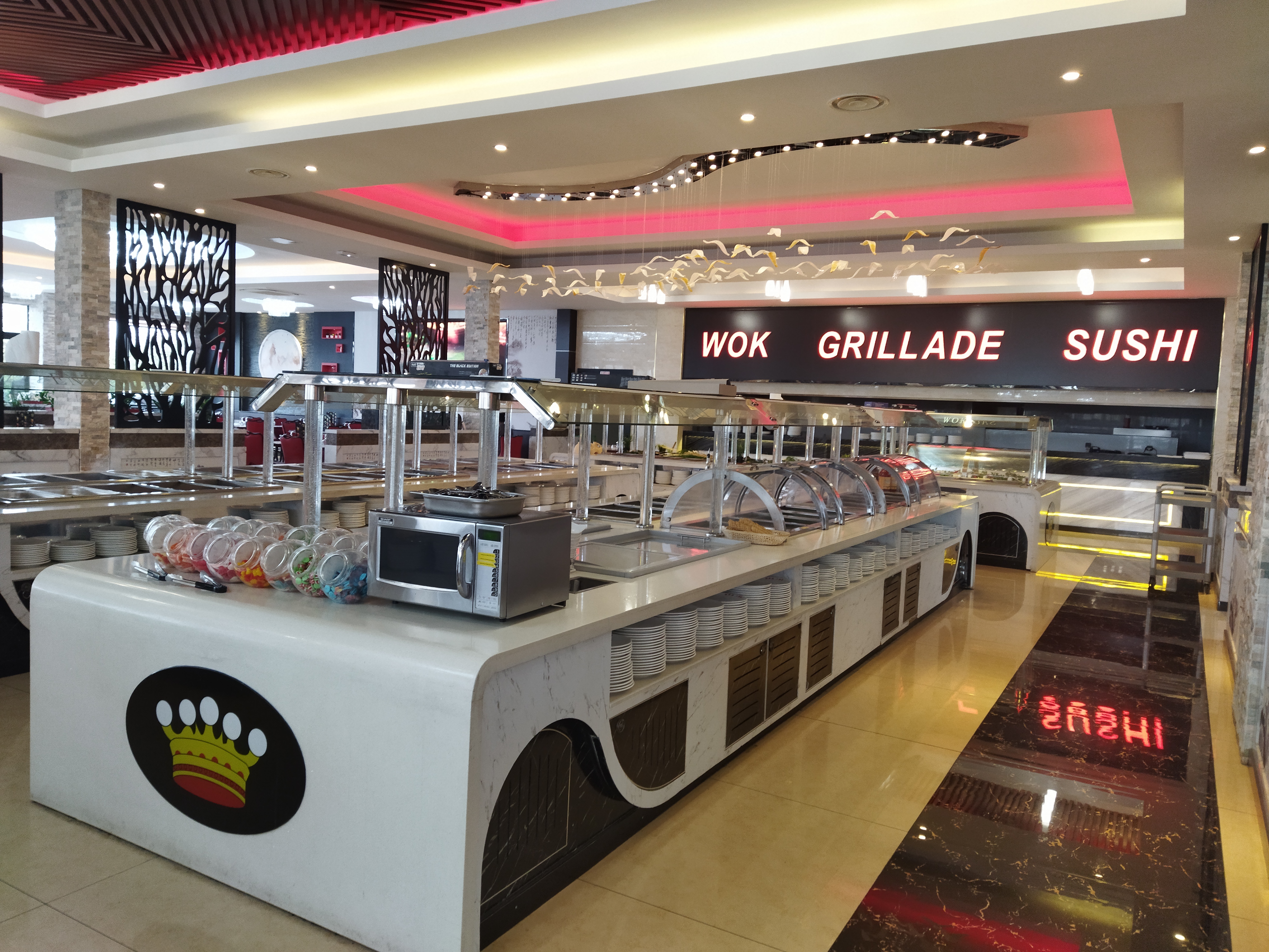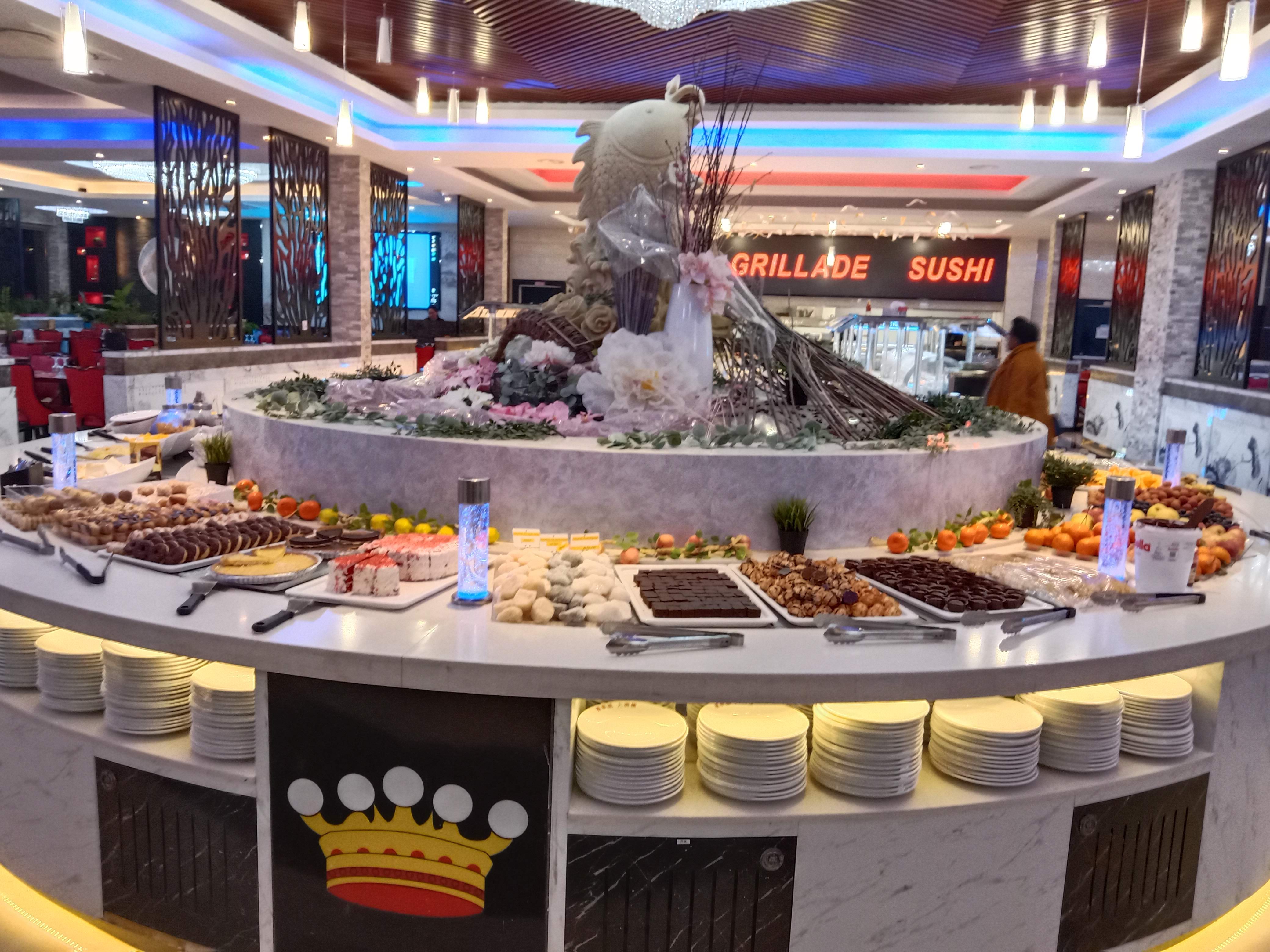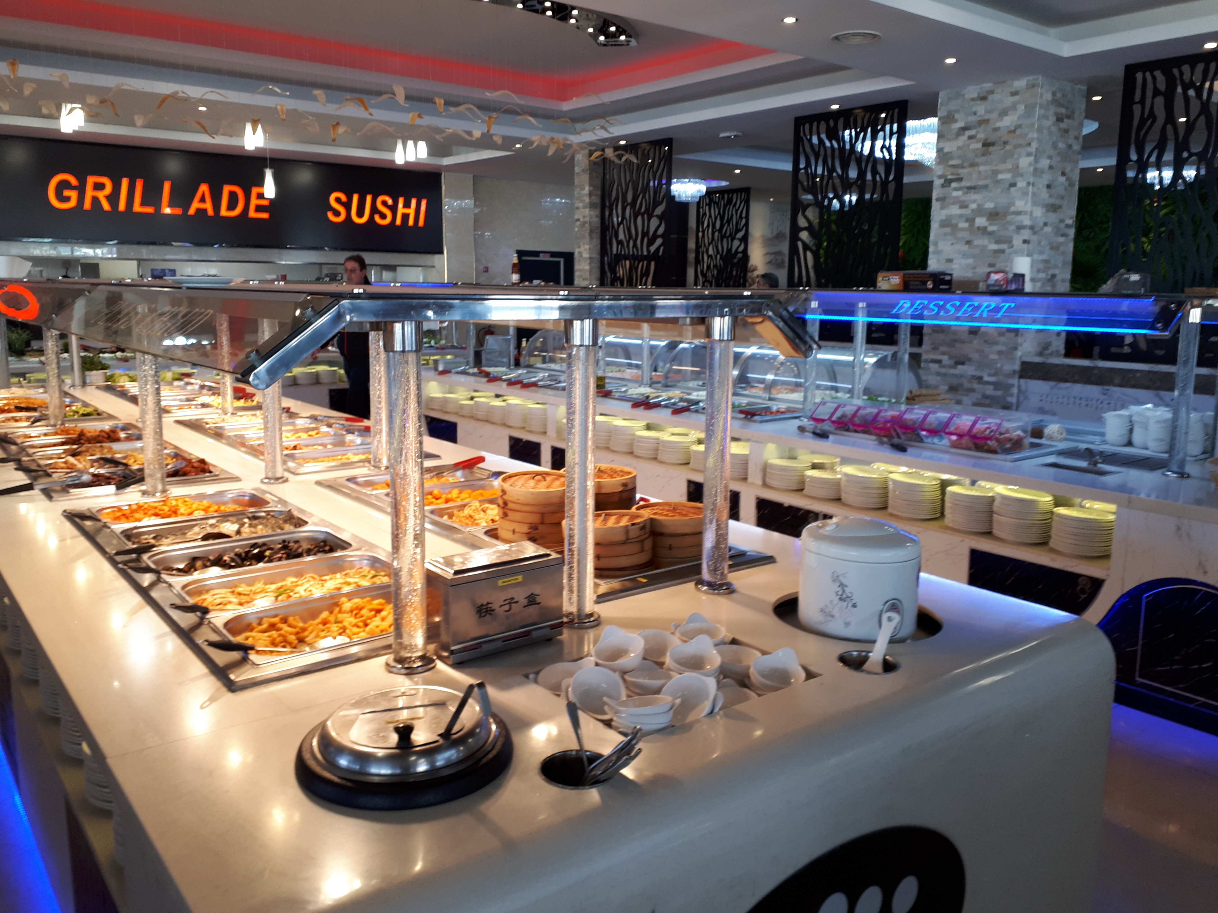 Restaurant à volonté au top! Un large choix suffisant. Plusieurs sortes de raviolis, de sushis, de brochettes, de plats, des nouilles du riz cantonnais… plein de desserts… prix raisonnable. Je le recommande les yeux fermés !