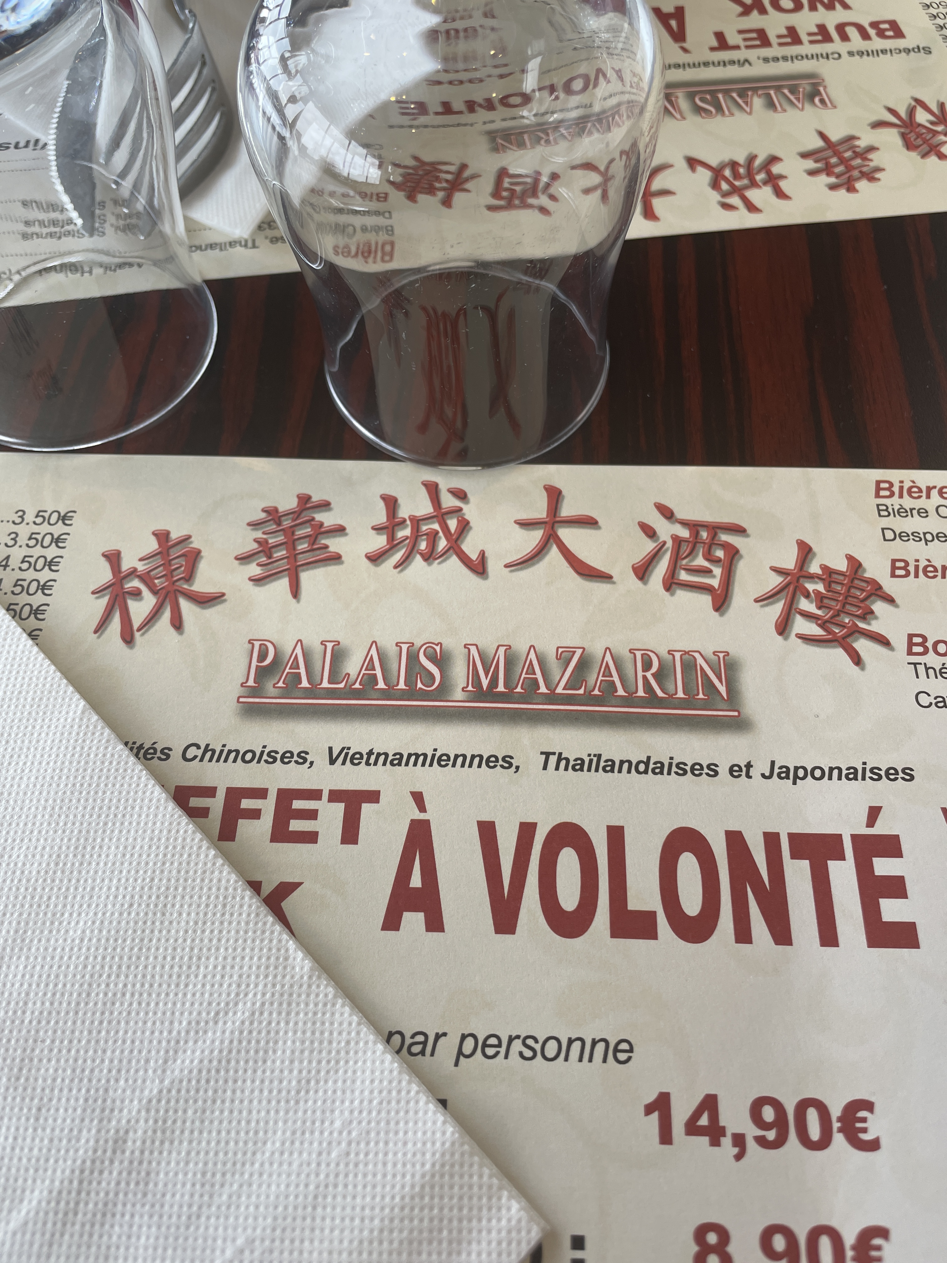 Le palais de Mazarin est situé à Chilly-Mazarin dans la zone d'activités avec d'autres restaurants. 👬: L'équipe est souriante, à l'écoute et avenante. Elle est dynamique ce qui permets aux tables d'être rapidement desservies. 🍣🍤🍜: Le choix des plats est assez varié et bon. Le maintien au chaud est plutôt bien respecté. Pour les dessers contrairement aux autres chinois à volonté il y a plutôt pas mal de choix de desserts et gourmandises. Vous pourrez j'espère trouver votre bonheur. 🍴: le restaurant possède plusieurs espaces. Il est spacieux. 💶: Prix abordable. (Vous pouvez aller voir mes autres avis sur le buffets à volonté du coin pour orienté votre choix).