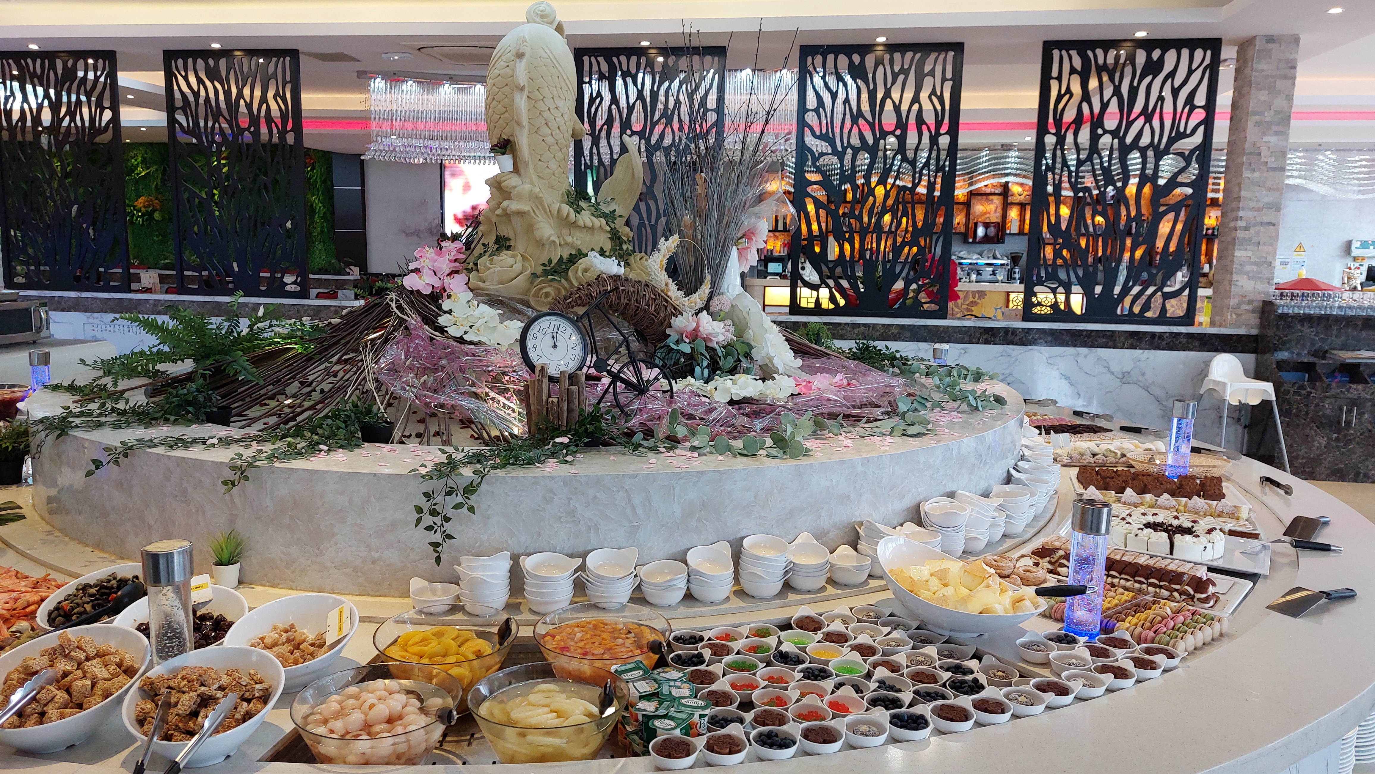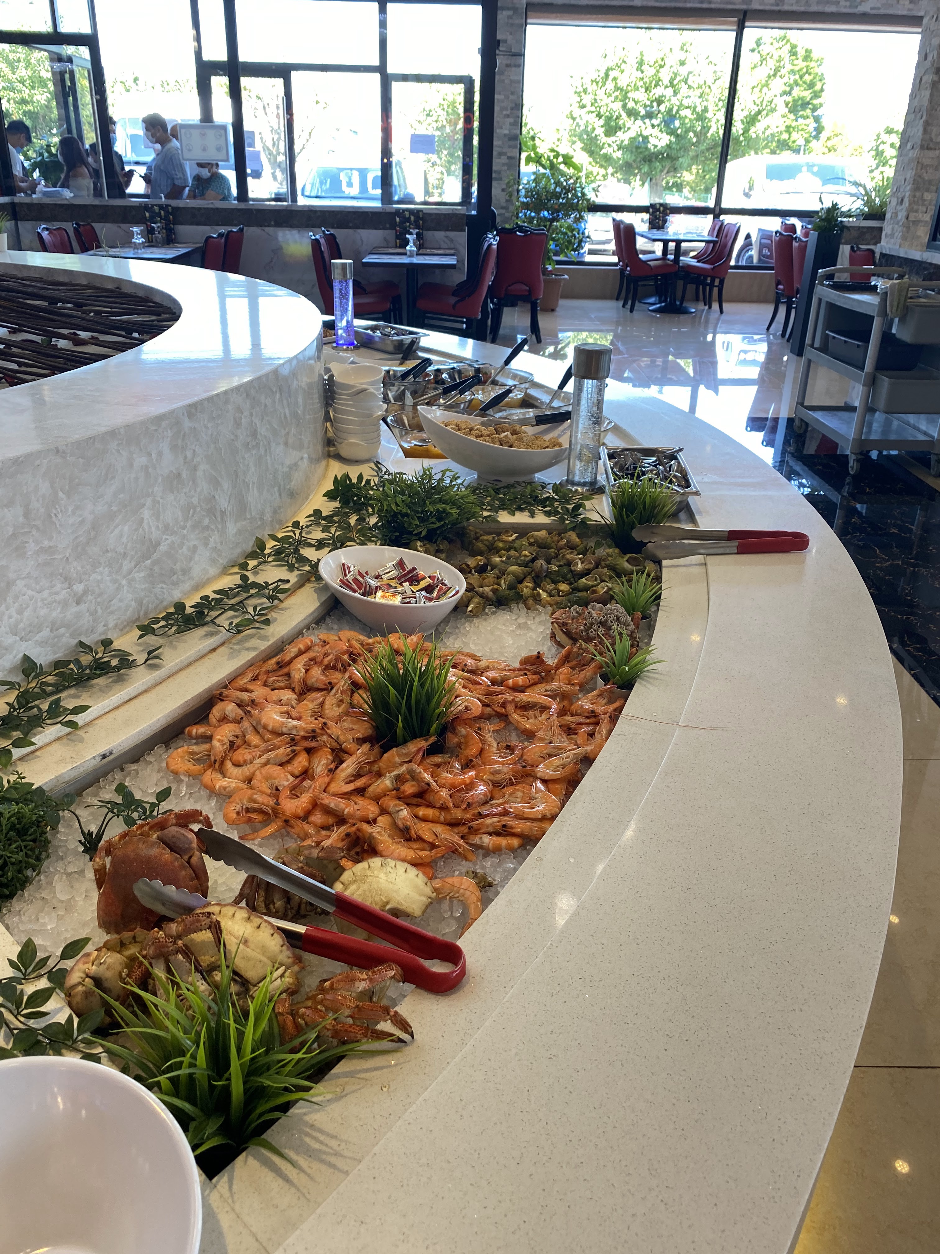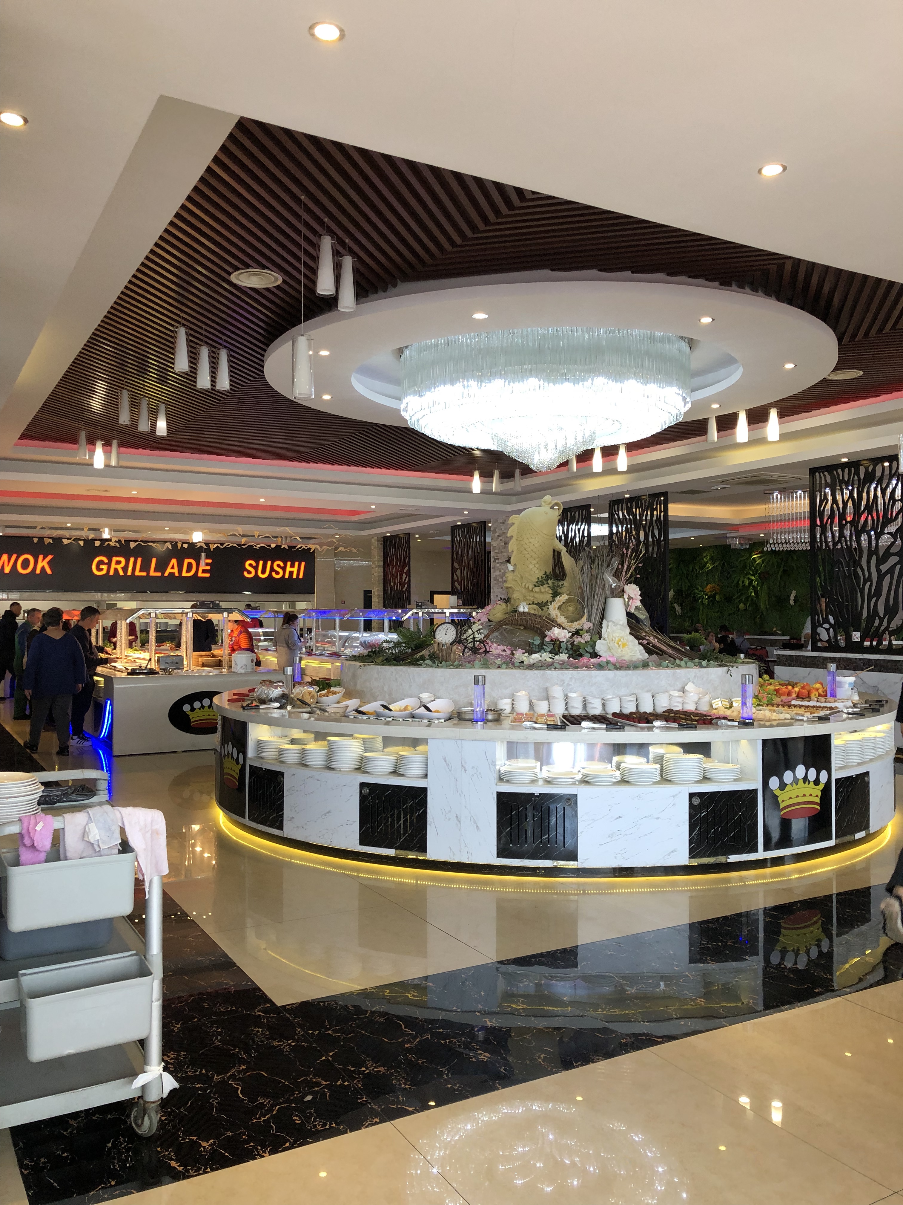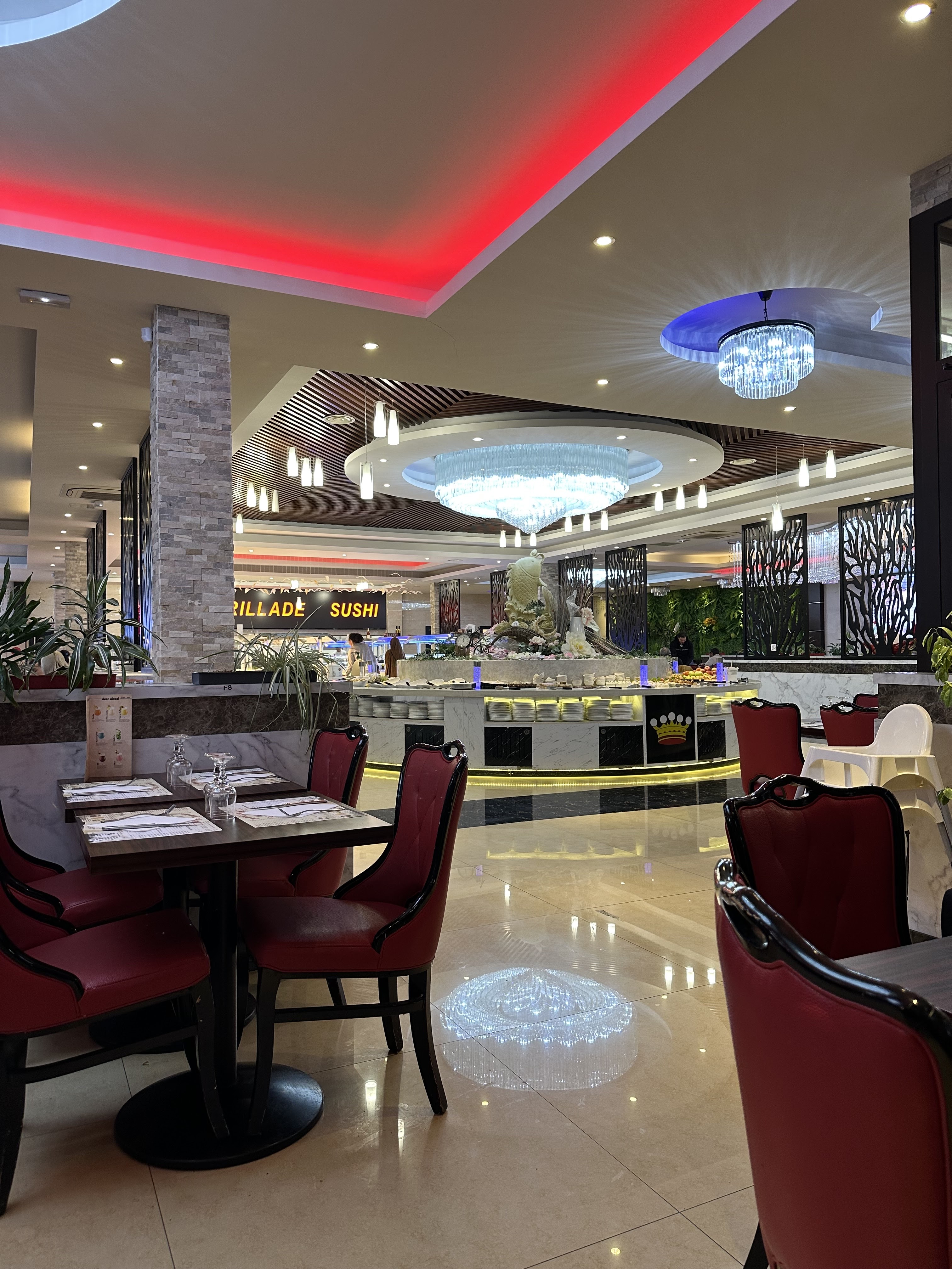 Très belle salle, mobilier confortable. Beaucoup de choix, fruits de mer appréciés. Pas toujours possible d' avoir du poisson.(Plats souvent vides et j'ai vu des personnes se servir déraisonablement) La viande de boeuf n' est, la plupart du temps, pas très tendre. Ce qui ne m' empèche pas de bien aimer ce restaurant. Je choisis dans les plats goûteux que je considère bons.