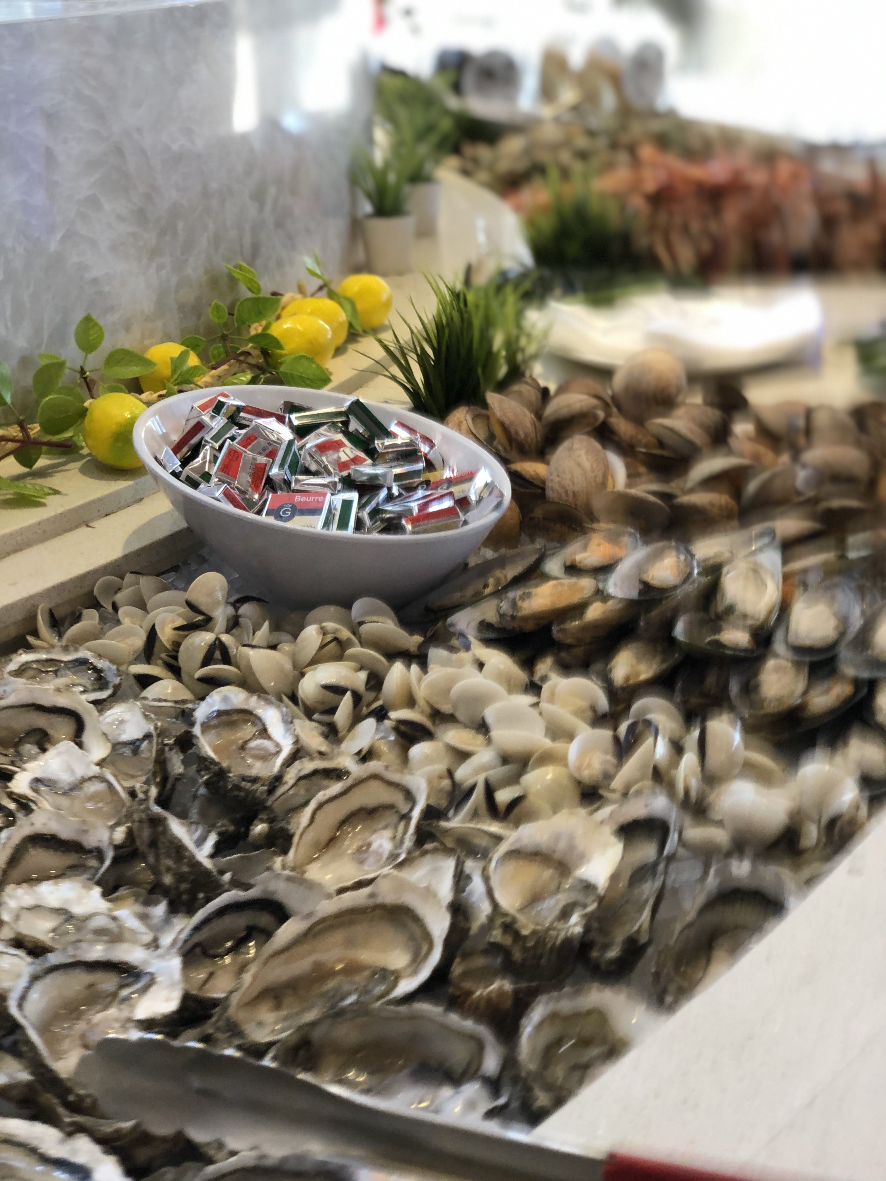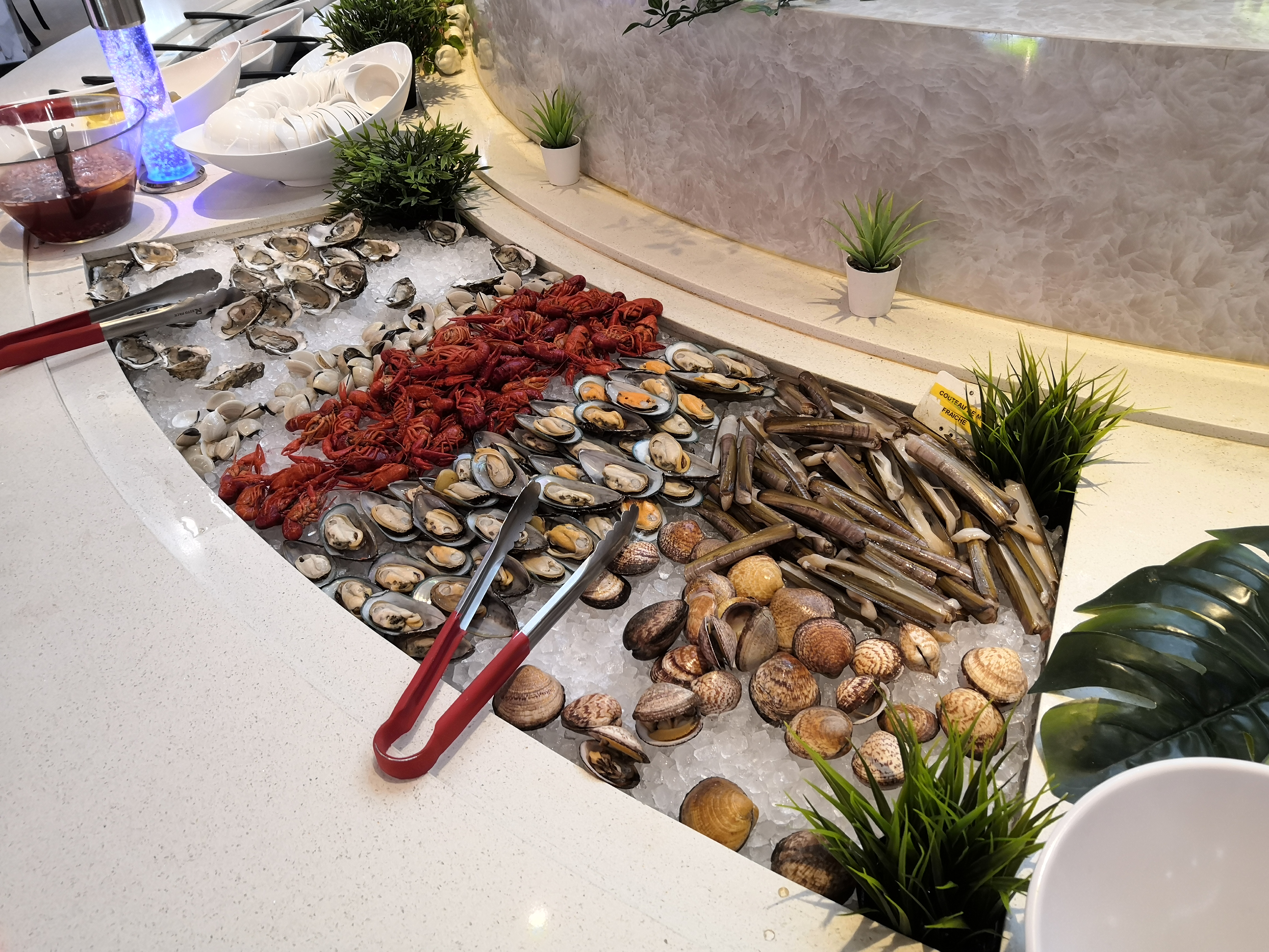 Beau et grand restaurant. Je regrette qu'il y avait trop de monde ce jour là, c'était devenu une usine. Les cuisiniers n'avaient sans pas le temps de bien cuire les aliments, certains plats étaient encore crus comme les raviolis frits ou à la vapeur. Les sushis étaient préparés à la va vite, esthétiquement pas top. Les huîtres ouvertes avec plein de morceaux de coquilles, etc .. Bref, un peu bâclé par manque de temps de préparation.