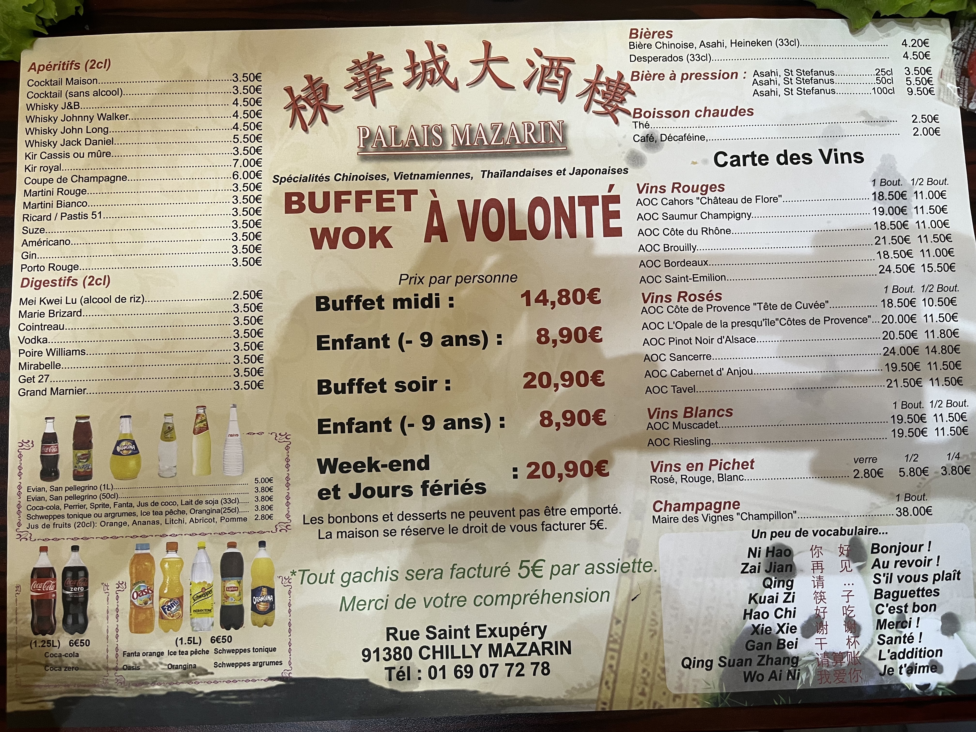J aime manger dans ce restaurant car il y a beaucoup de choix, chaque client peut trouver son bonheur et choisir son repas. On peut manger chinois, japonais, traditionnel etc.... Les enfants ont le choix aussi. Les plats sont recharger au fur et à mesure. Inconvénients Les tarifs augmentent régulièrement 20 euros le repas actuellement.