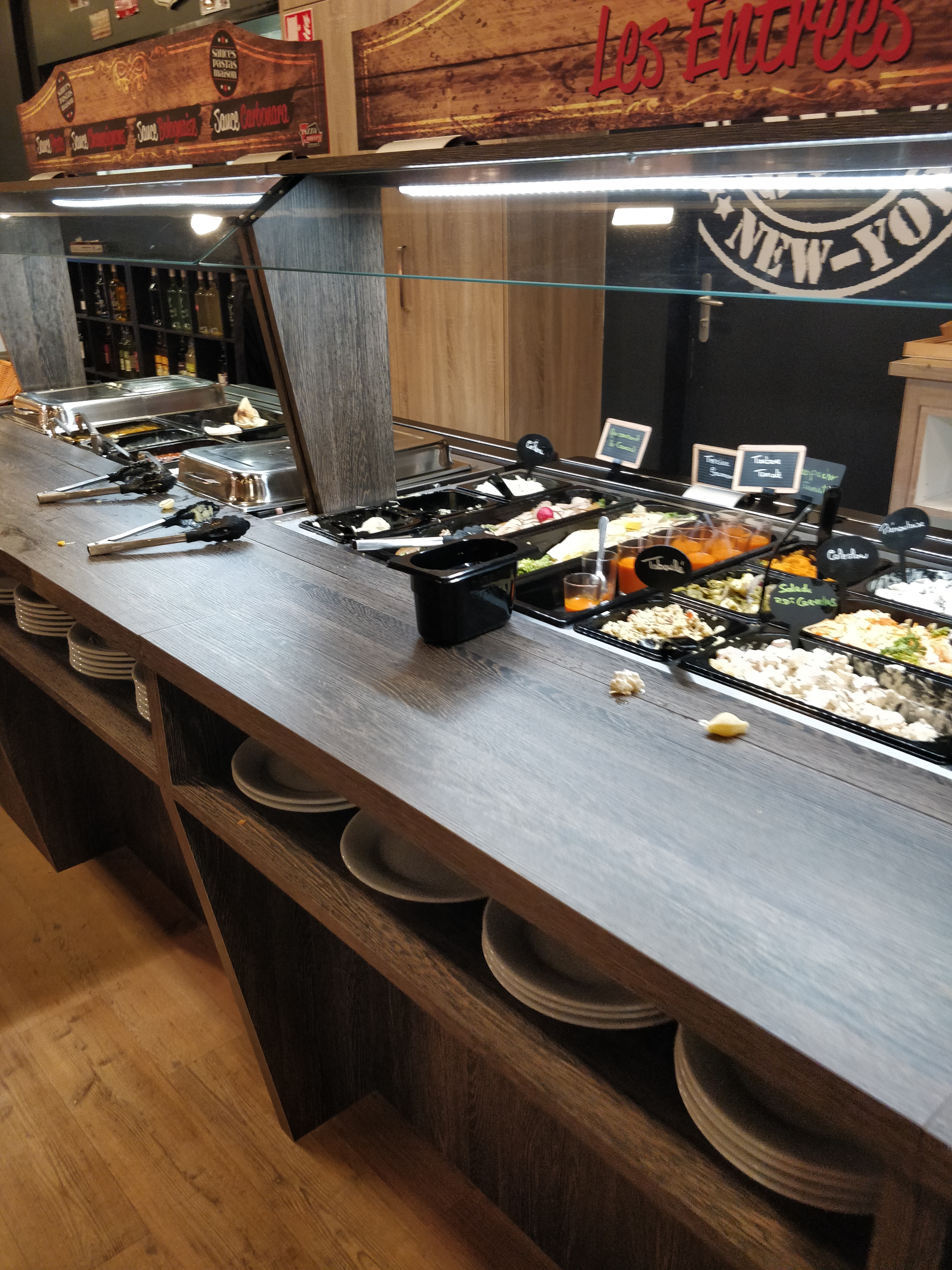 Prix tout à fait correct pour un buffet à volonté, malheureusement la qualité n'est pas au rendez-vous... Un buffet d'entrées sans intérêt puisqu'on trouve la même chose dans mon frigo. Pas énormément de choix de pizzas, certaines sont bonnes, sans plus... Des desserts industriels... Le serveur incompétent a eu beaucoup de mal à nous servir un simple apéritif alors qu'il n'avait que 3 tables à gérer. Quand au reste du personnel, on a pu entendre toutes leurs conversations puisqu'ils ne sont pas du tout discrets... Les buffets ont été vidés et rangés 40min avant la fin du service alors que nous étions encore dans le restaurant. Gardez le concept, les prix et revoyez le reste, c'est dommage... (les affiches jaunes sur la vitrine font vraiment discount et ne donnent pas envie de rentrer, on m'y a invité sinon je n'y aurais sans doute jamais mis les pieds)