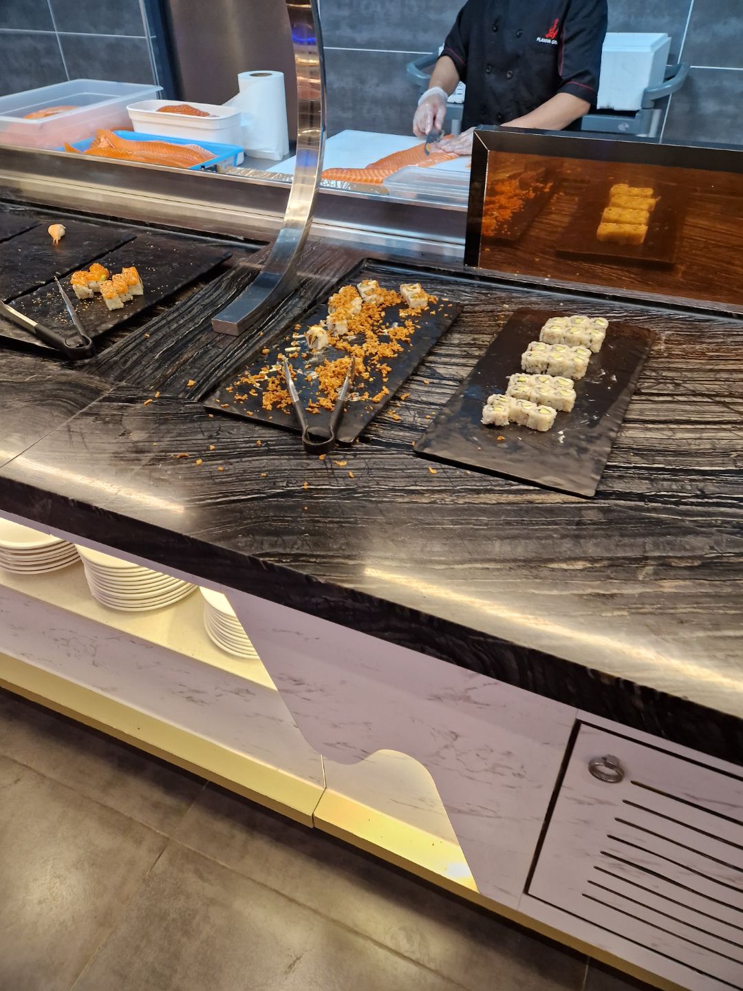 Très degeulass j’ai vue des fourmis qui se balader autour des desserts, niveau nourriture il n’y a pas beaucoup de choix franchement c’est pas bon. Les serveuses sont pas du tout agréable surtout elle qui louche à l’accueil ils sont insolent je recommande pas du tout!! En plus de ça c’est très chère et on mange rien. Y’a que les sushi qui sont bon