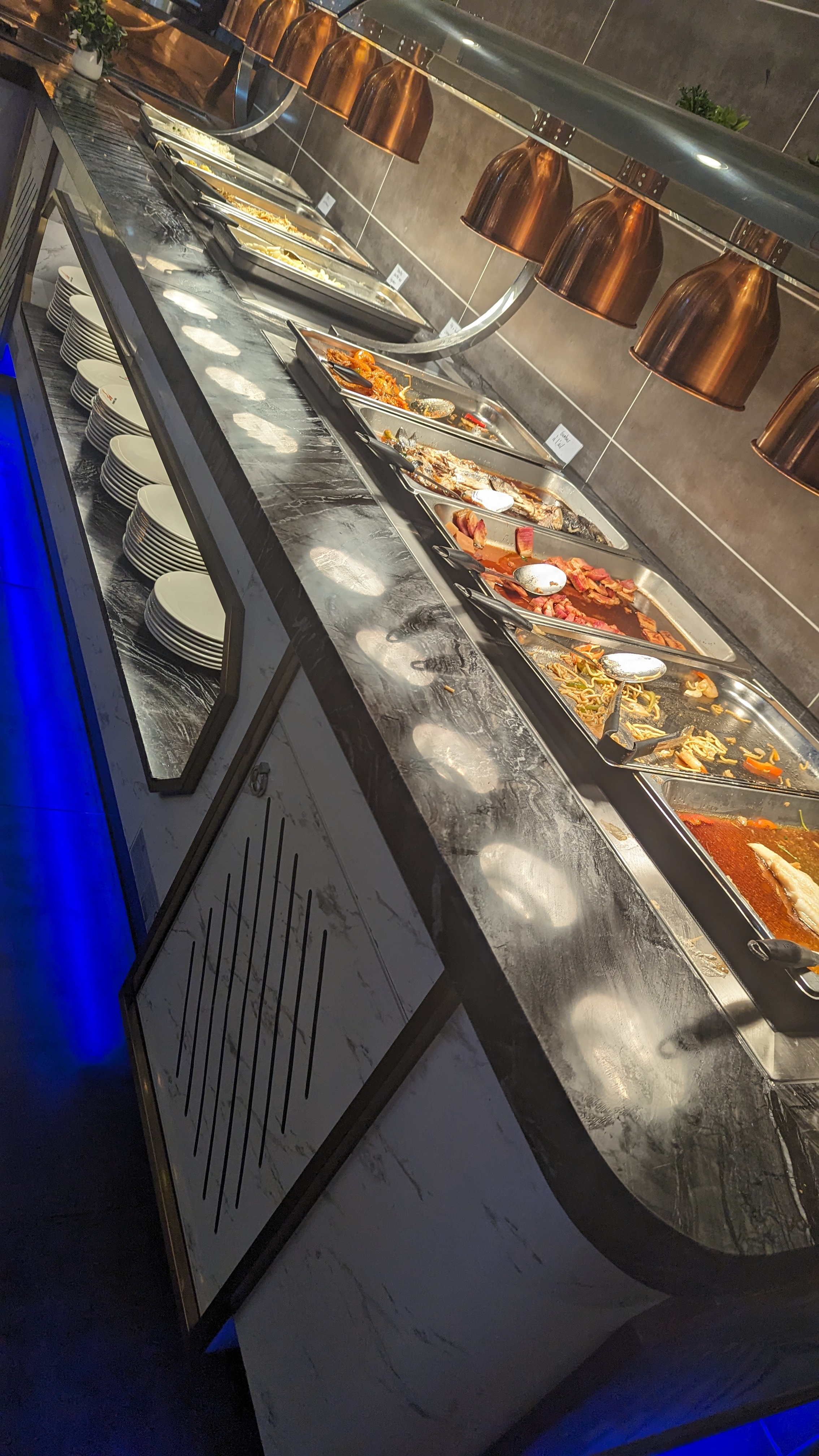 Restaurant propre. Plat toujours pleins ou réapprovisionner rapidement. Attention beaucoup de viandes sont cuites en même temps et il y a des erreurs lors de la distribution. Les verrines desserts très peu de contenance. Personnel très agreable