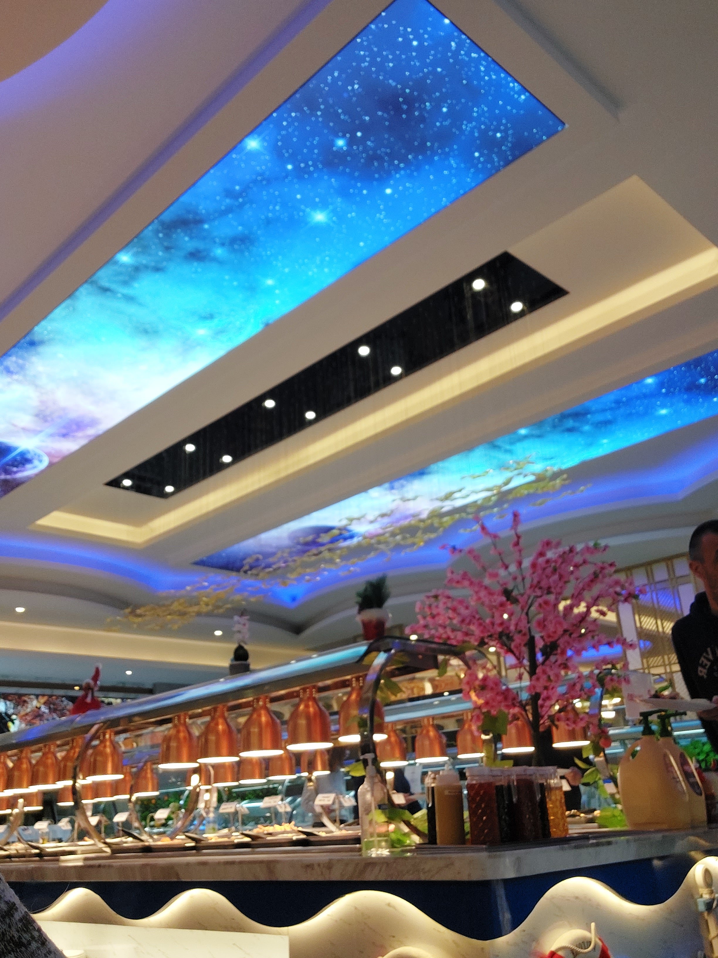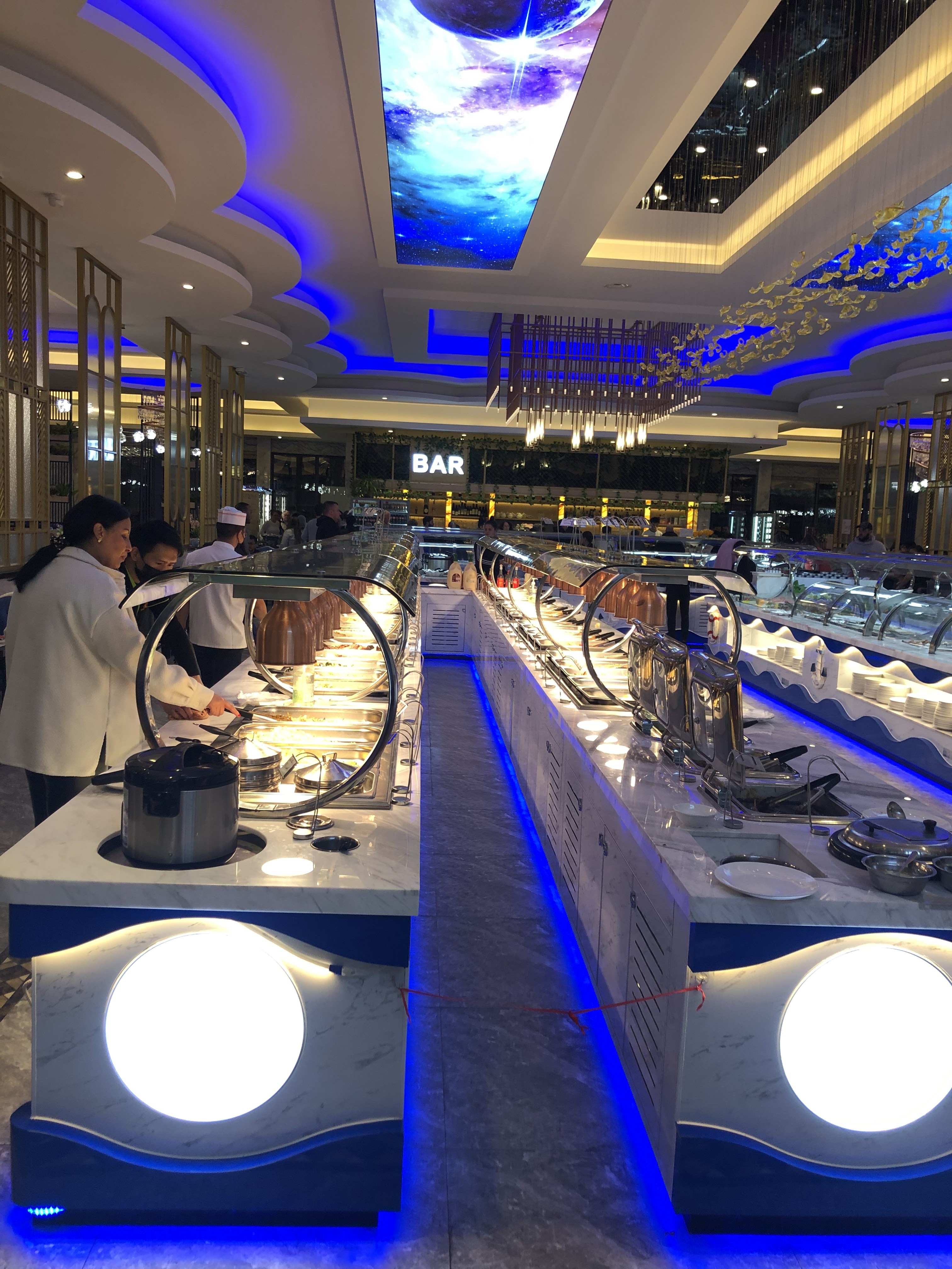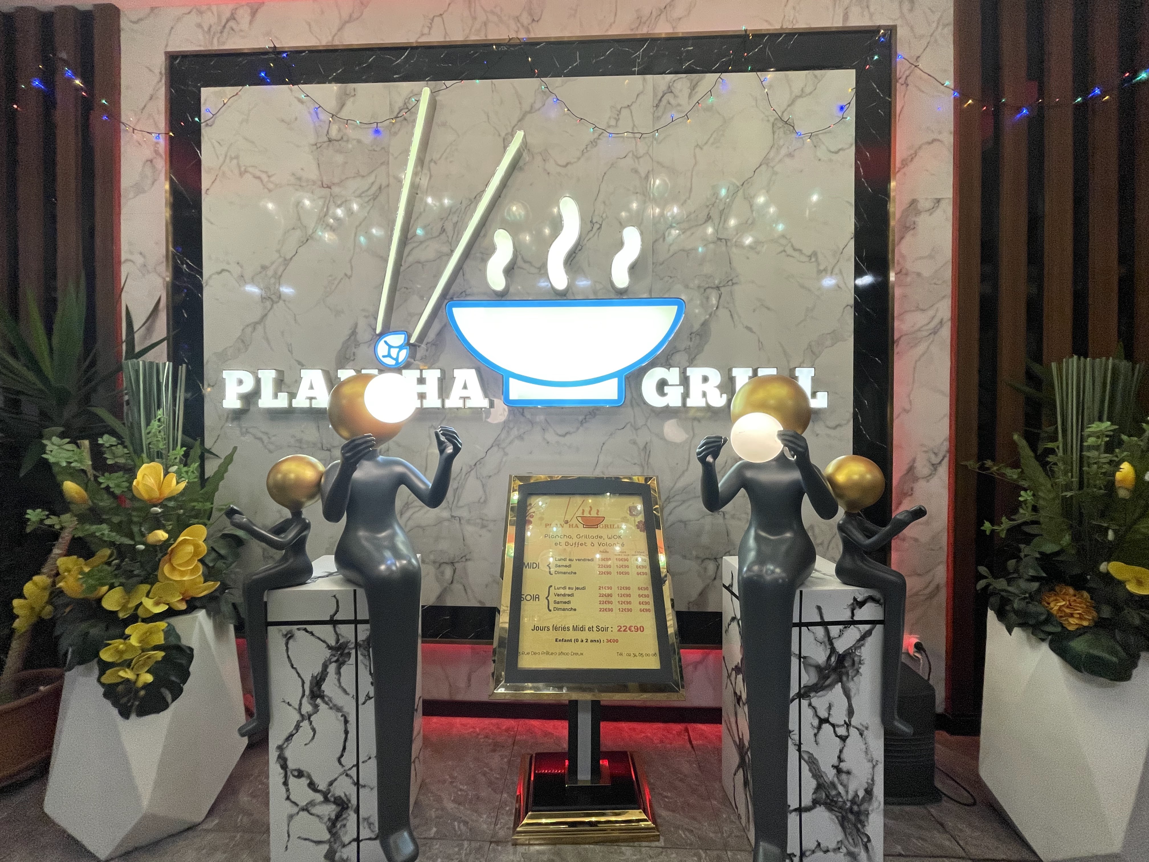 Étant donné que c’est un nouveau restaurant j’ai décidé d’aller manger avec mon chéri et franchement pas mal niveau déco nickel il y a deux grandes salles que sépare du grand buffet , le plafond super beau avec des effets galactiques lol et niveau grill vous trouverez un effet bois avec du 🔥 feu. Beaucoup de choix du sucre et salé etc. Niveau prix est un peu élevé par rapport son concurrent mais bon ça reste du buffet à volonté hien pas resto traditionnel 5 étoiles. Le personnel est à votre écoute et super sympa. Les sushis sont fait sur place devant vos yeux🤤🤤 et les grillades aussi. Je vous conseille ce resto👌👍