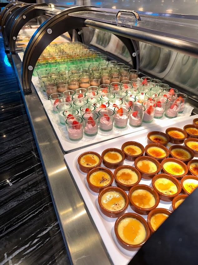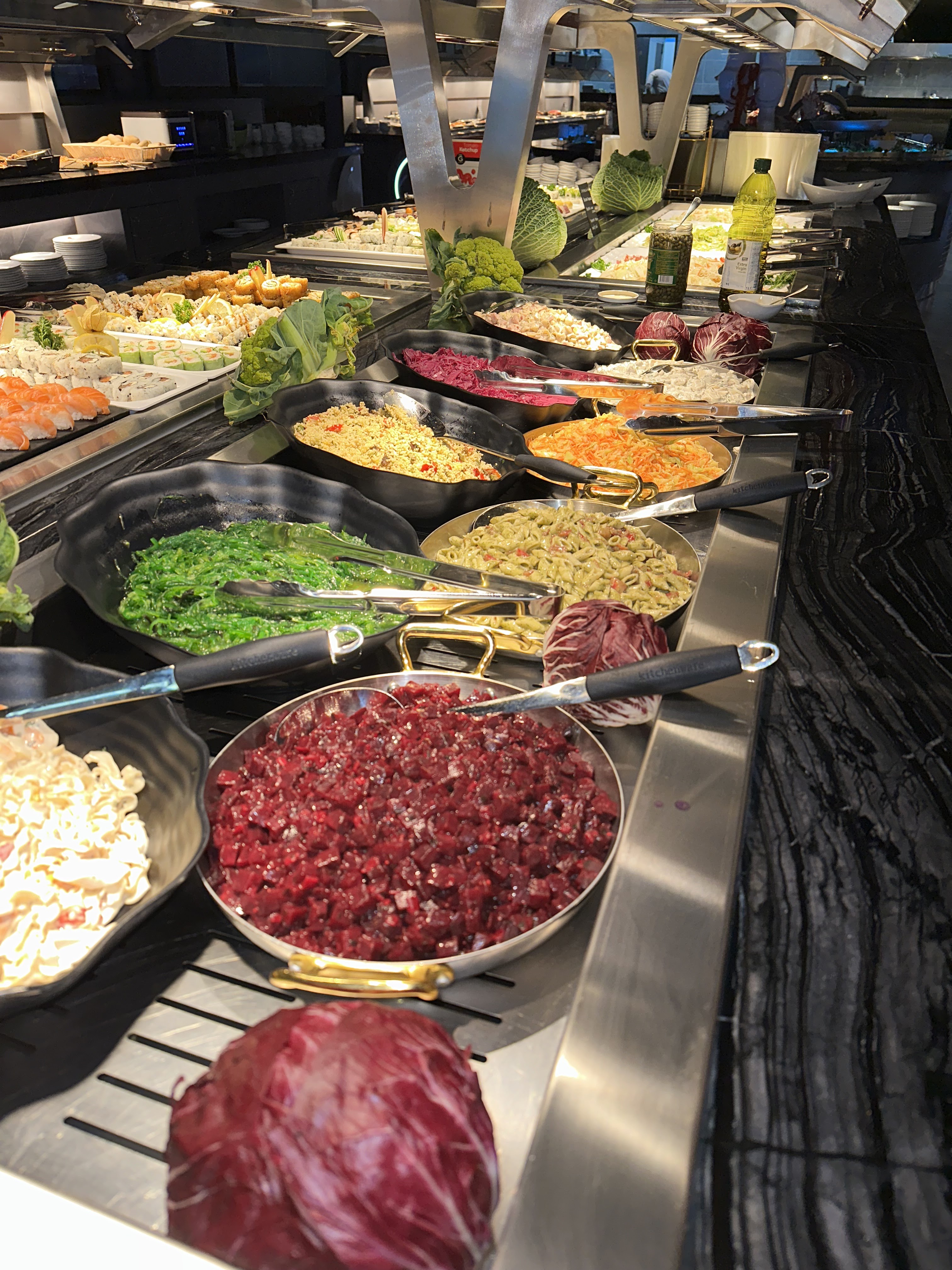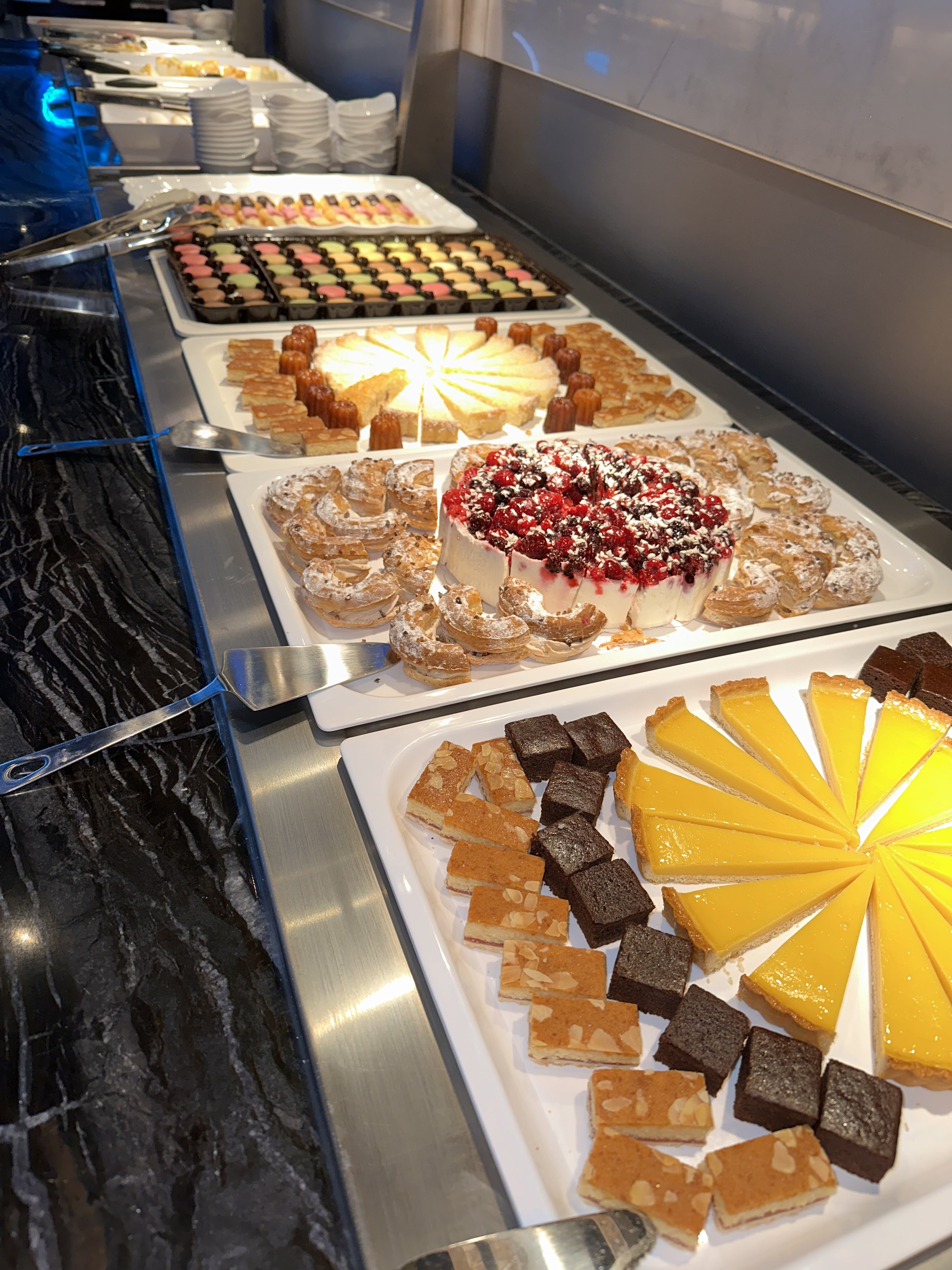 Arrivés vers 20h30, peu de choses dans les gastros, peu de choix. Trop gras, sans saveurs, desserts industriels à part crème vanille et chocolat. A part la serveuse sympathique et les robots serveurs, ce fut une grande déception. La personne qui encaisse ne demande même pas si ça s'est bien passé. Je ne recommande pas.
