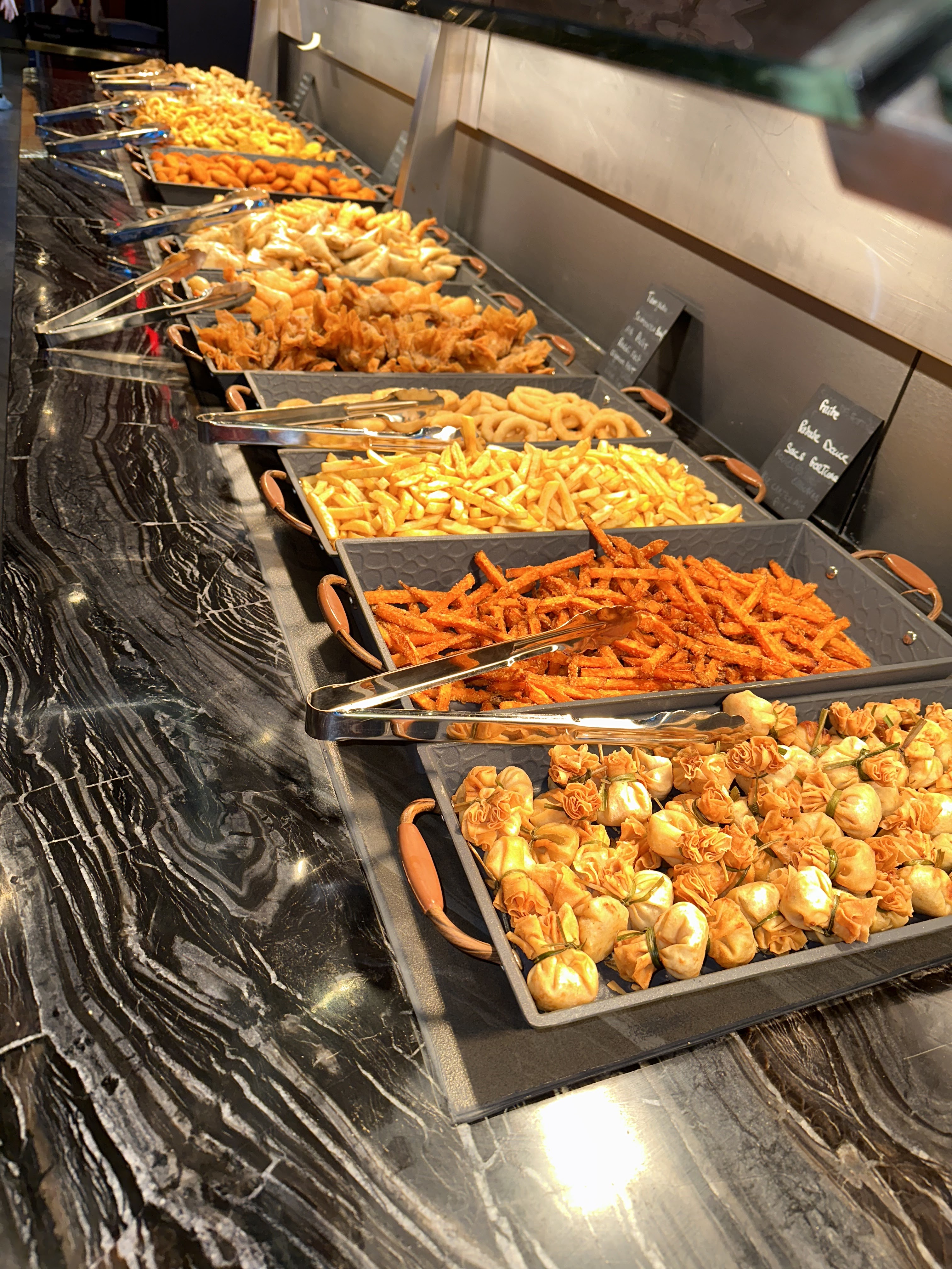 Parfait déco original, restautant très propre, choix des plats varié… fruits de mer et poissons divers, viandes, grand choix de charcuteries et fromages, spécialités asiatiques, spécialités françaises(cuisses de grenouilles, escargot, gigot d’agneau), sushi makis ect grand choix de desserts (fruits frais et au sirop, gateaux a la creme, bubble tea, creme, glace, bonbons) Petit bemol pour la proximité des tables avec les autres… une odeur pas tres agréable ou nous étions installés (pas loin de l’accueil) donc a voir si cela venais vraiment de la table a coté de nous ou de l’installation évacuation) et manque une machine a chantilly , glace à l’italienne et a coulis chocolat comme deja vu dans d’autres restaurant a volonté.
