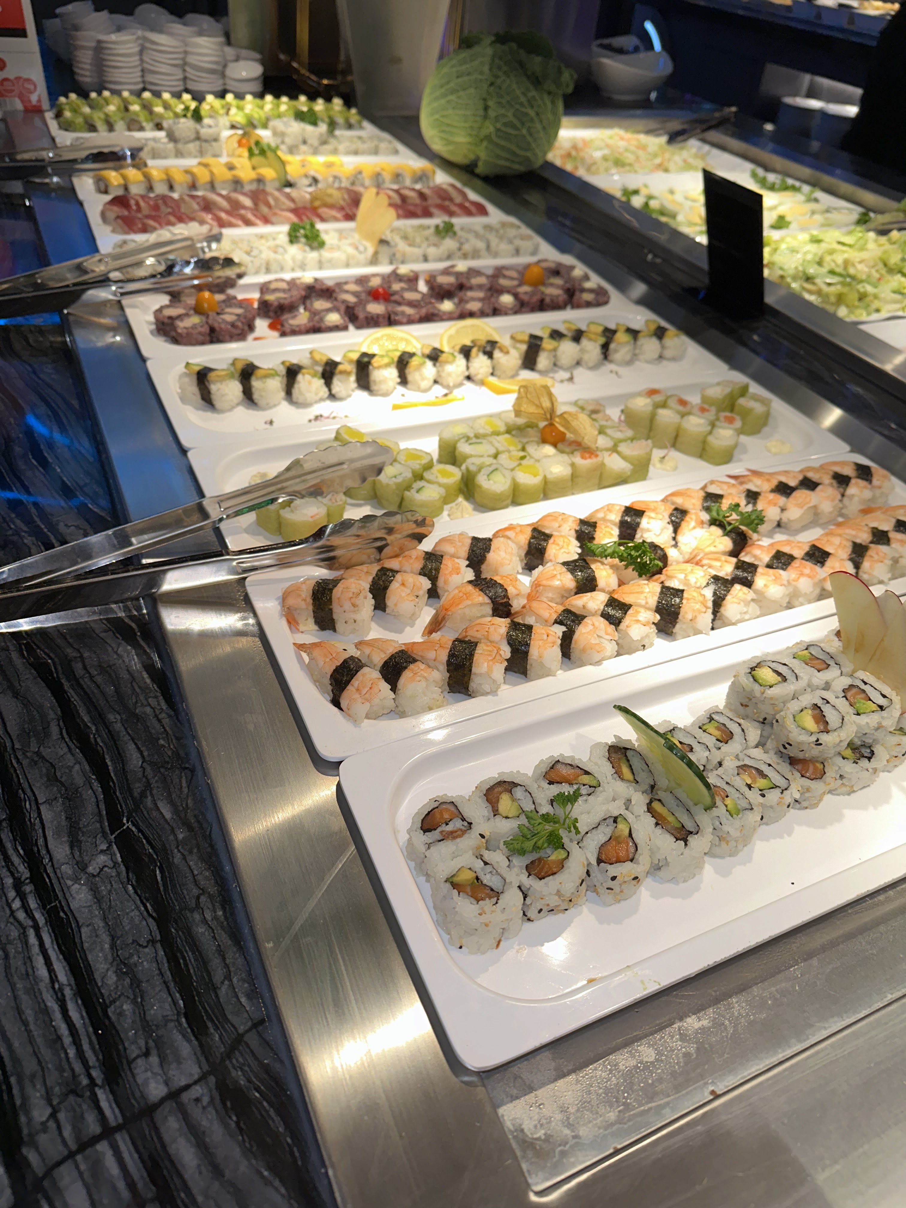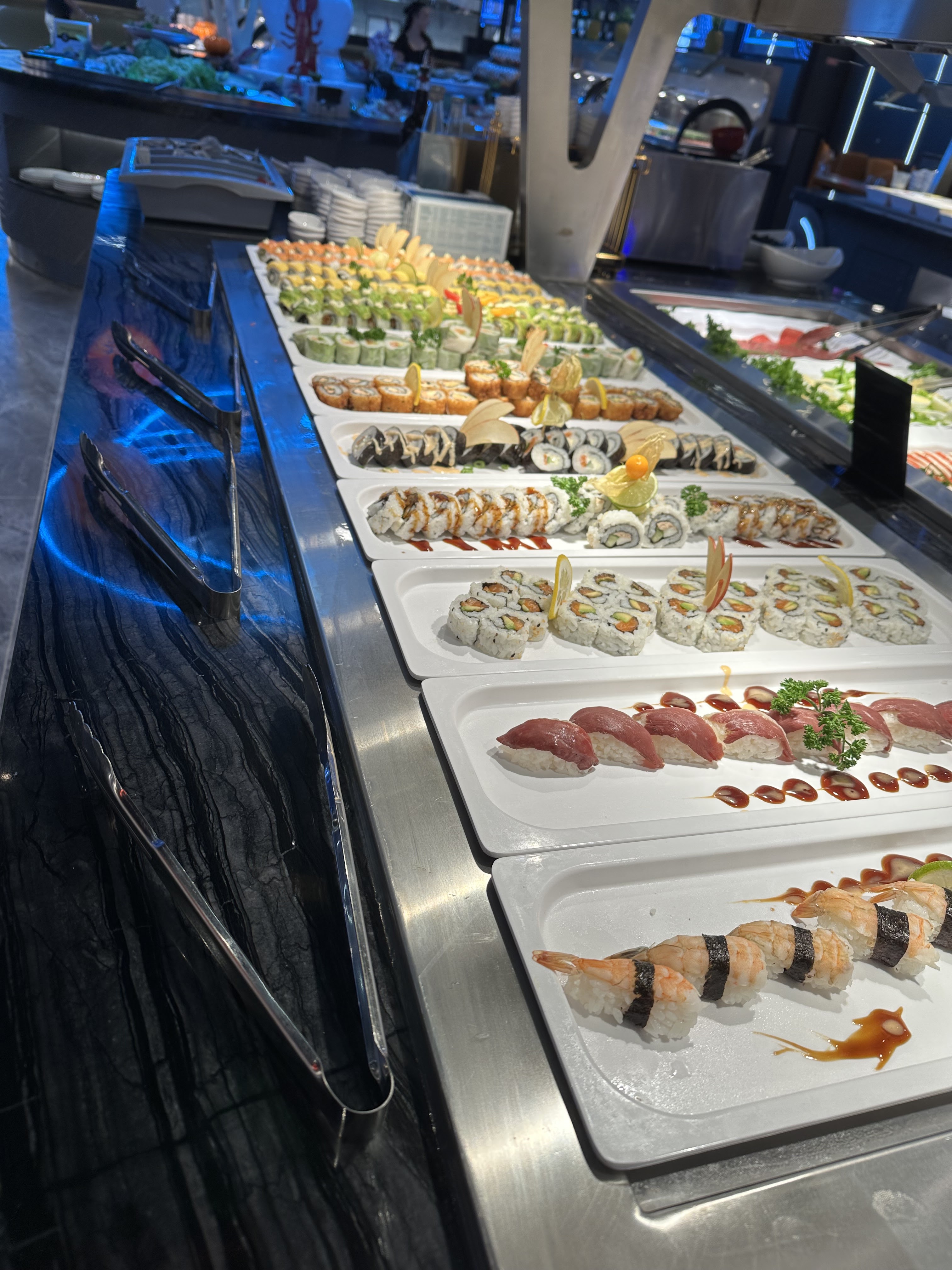Je suis allé manger deux fois dans la même semaine au restaurant une fois on se met en pleine semaine et c'était très bien une deuxième fois le weekend il y a une grande diversité de produits et les sushis sont frais j'ai vu le cuisinier le préparer. Quant au service le personnel est à l'écoute disponible et petite surprise pour le service des boissons un robot serveur fait l'animation au moment du service. Je recommande ce restaurant.
