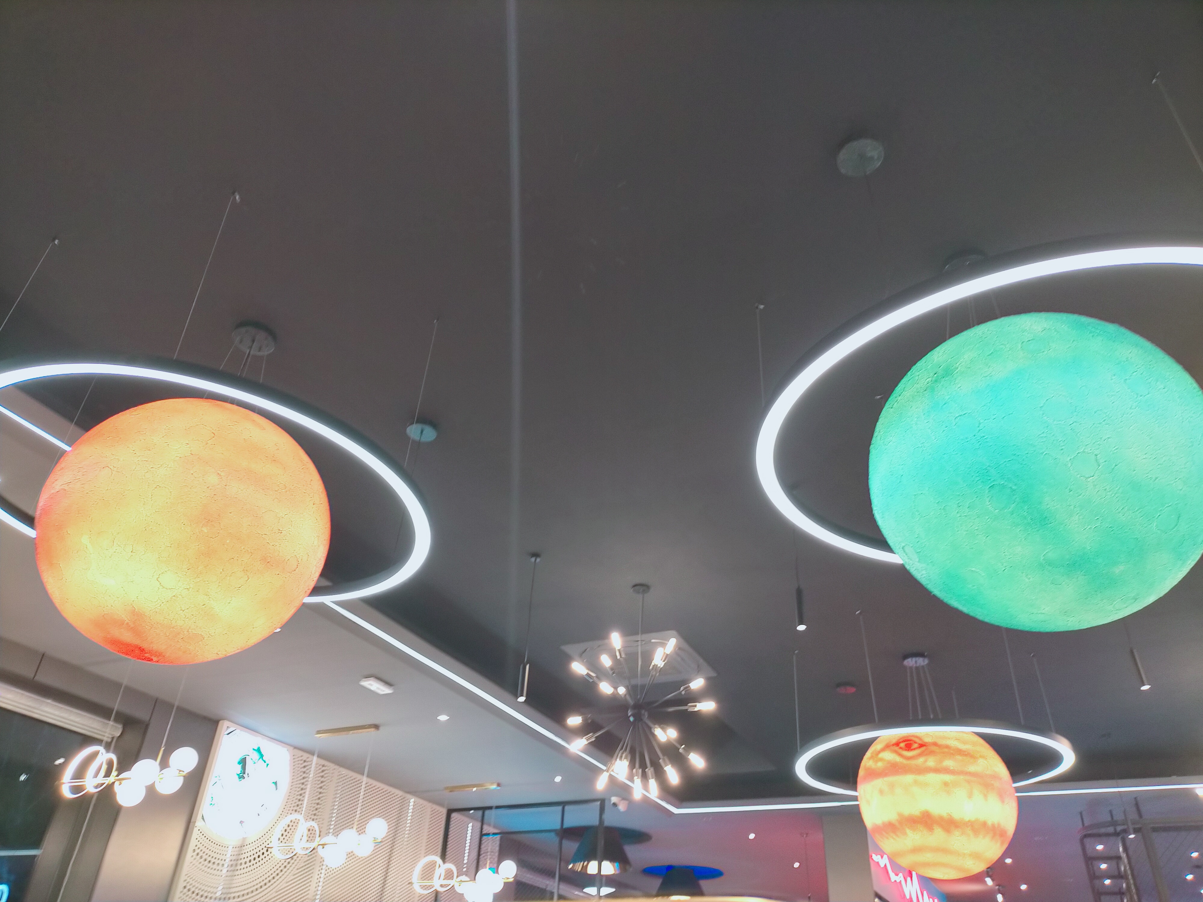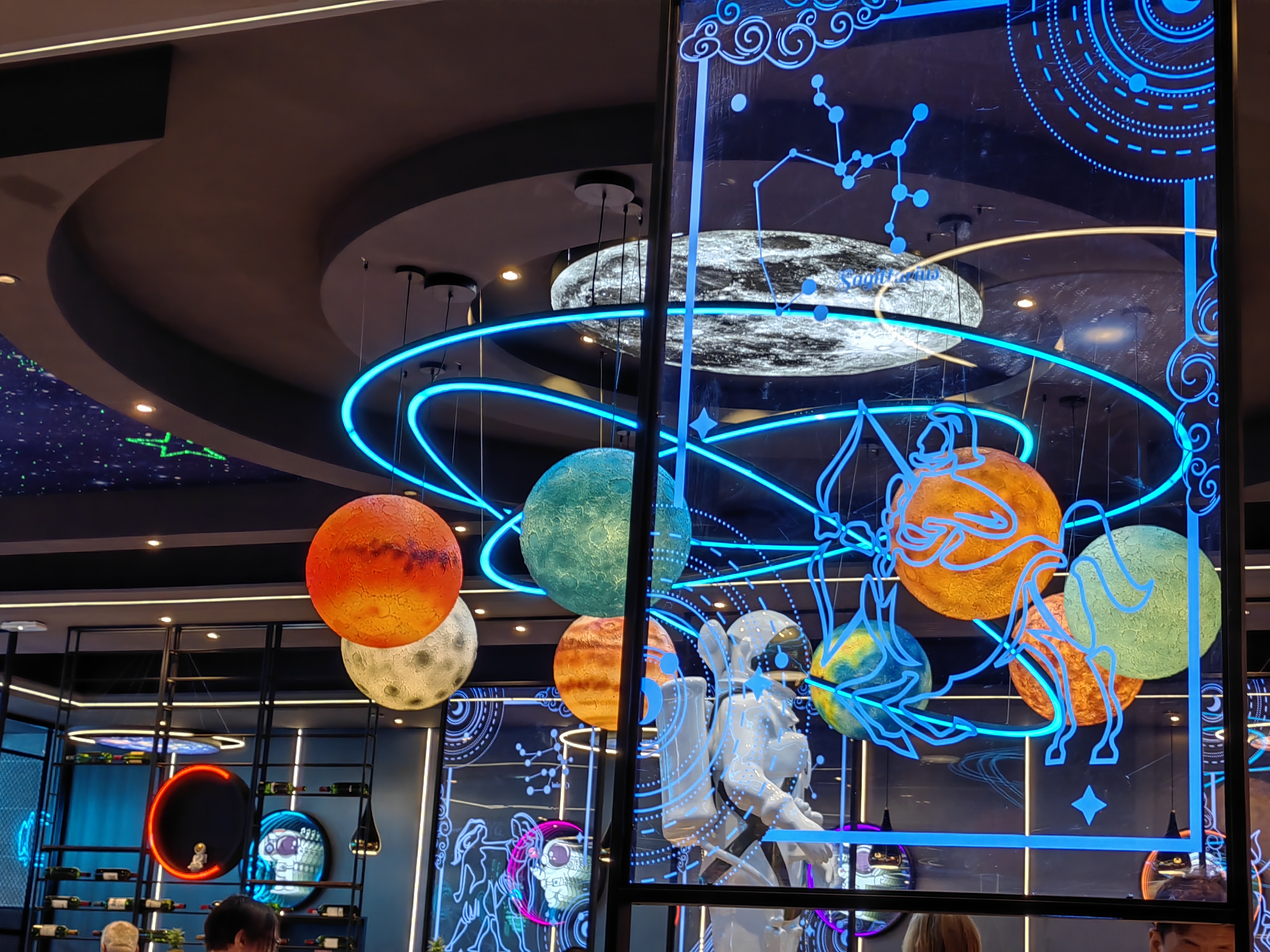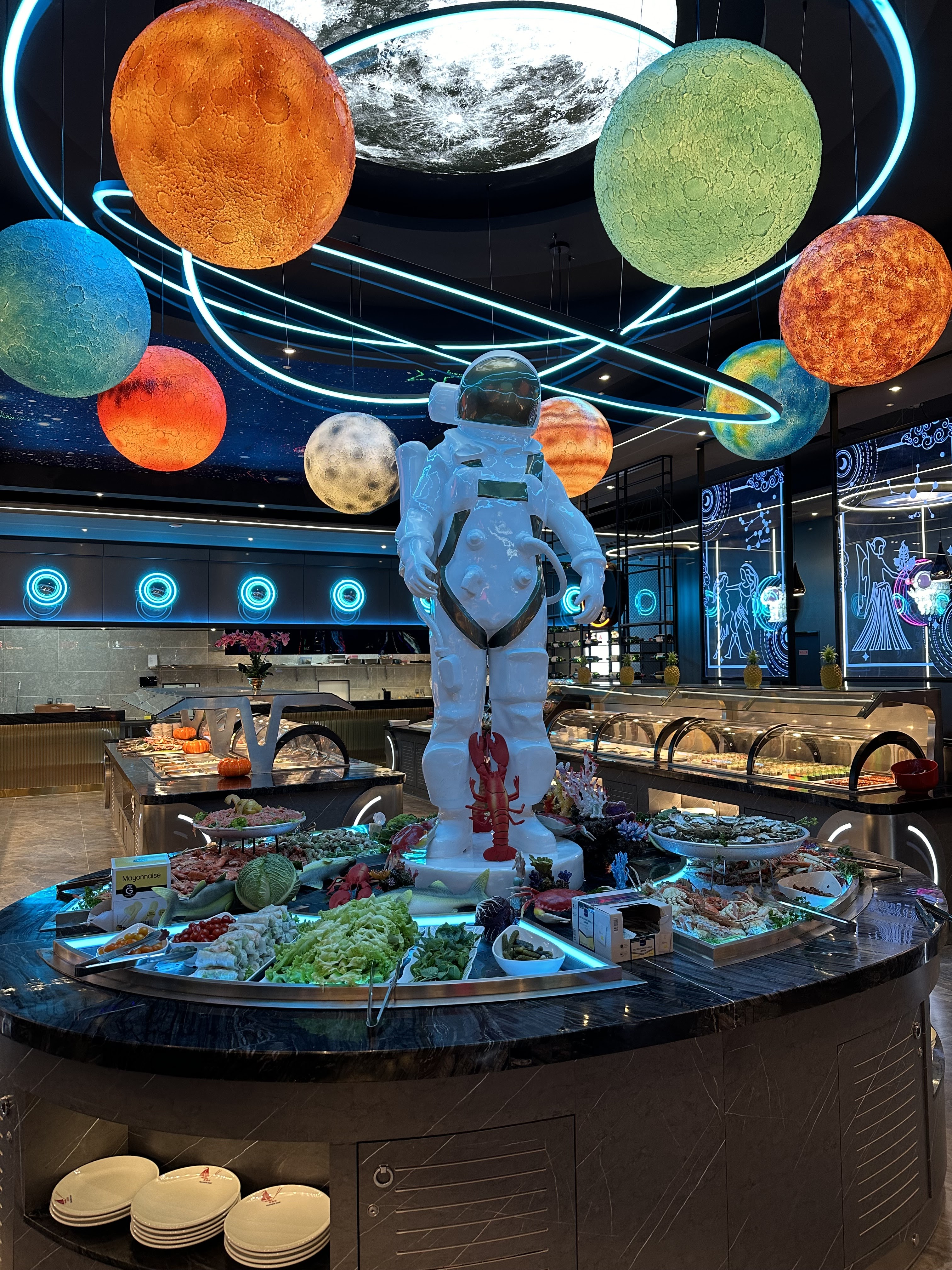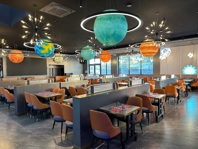 une décoration originale avec un thème sur l’espace qui crée une atmosphère sympathique. Cependant, en ce qui concerne la qualité des produits, je suis très déçu. Beaucoup de plats semblent être des produits surgelés ou réchauffés de la veille , la viande ne paraît pas particulièrement fraîche. Les crevettes manquent de saveur mais c’est encore pire pour les beignets de crevettes qui eux sont réchauffés et par conséquent sont dur et littéralement immangeable , et pour certains plats, le temps de se servir et de s’installer à table l’assiette est déjà froide. C’est dommage, car le cadre est joli, mais la qualité est médiocre .