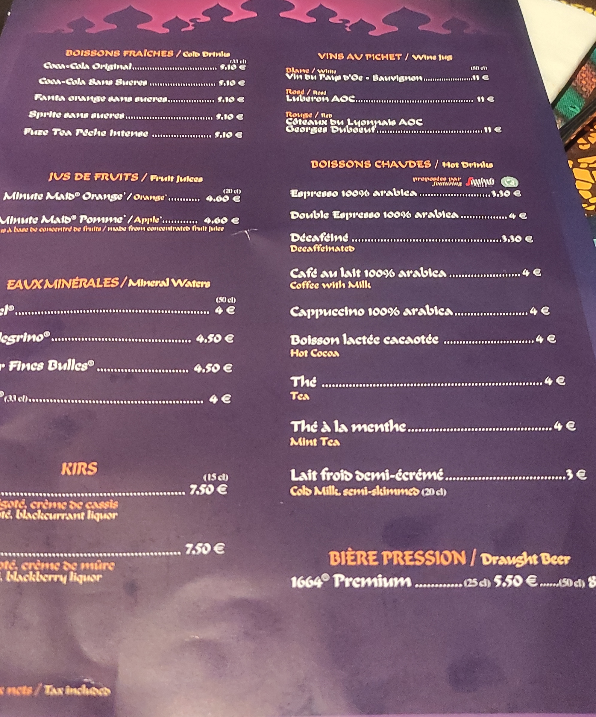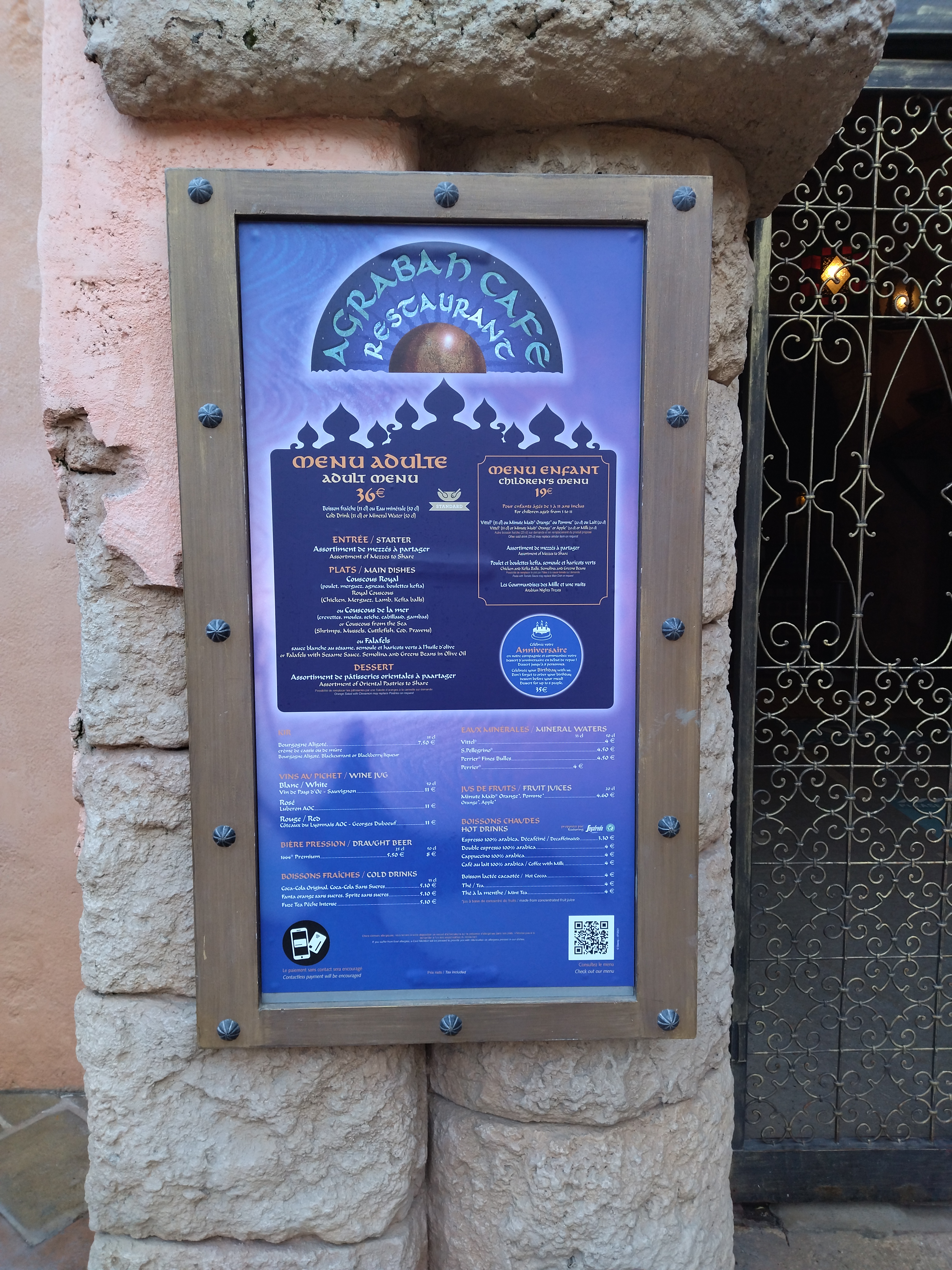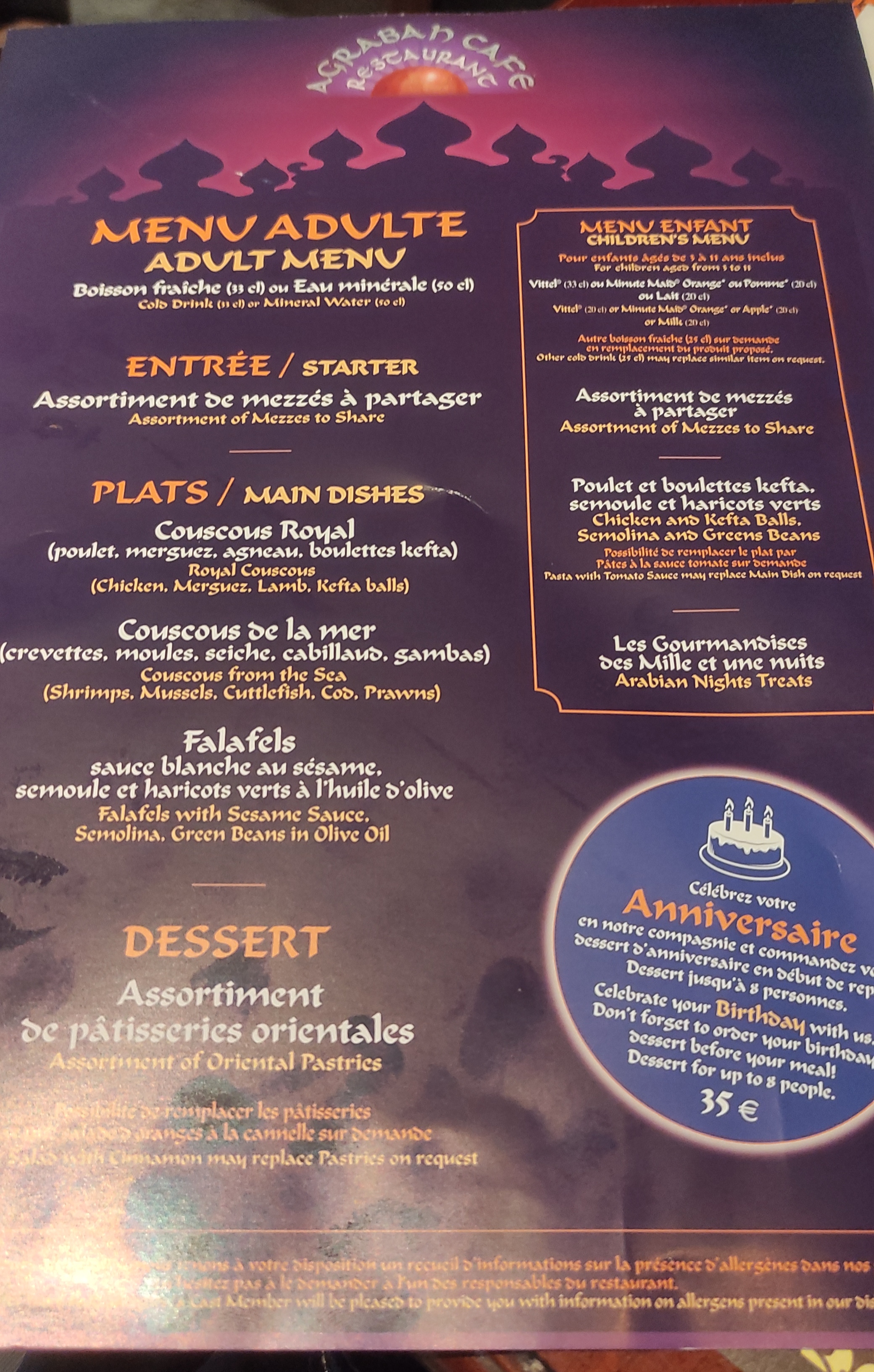 Menu à volonté couscous délicieux, choix variés d'entrées. Le menu et le prix sont disponible sur l'application Disneyland Paris . Nous apprécions le cadre et l'ambiance . Je recommande vivement. Je vous mets des photos bien entendu .