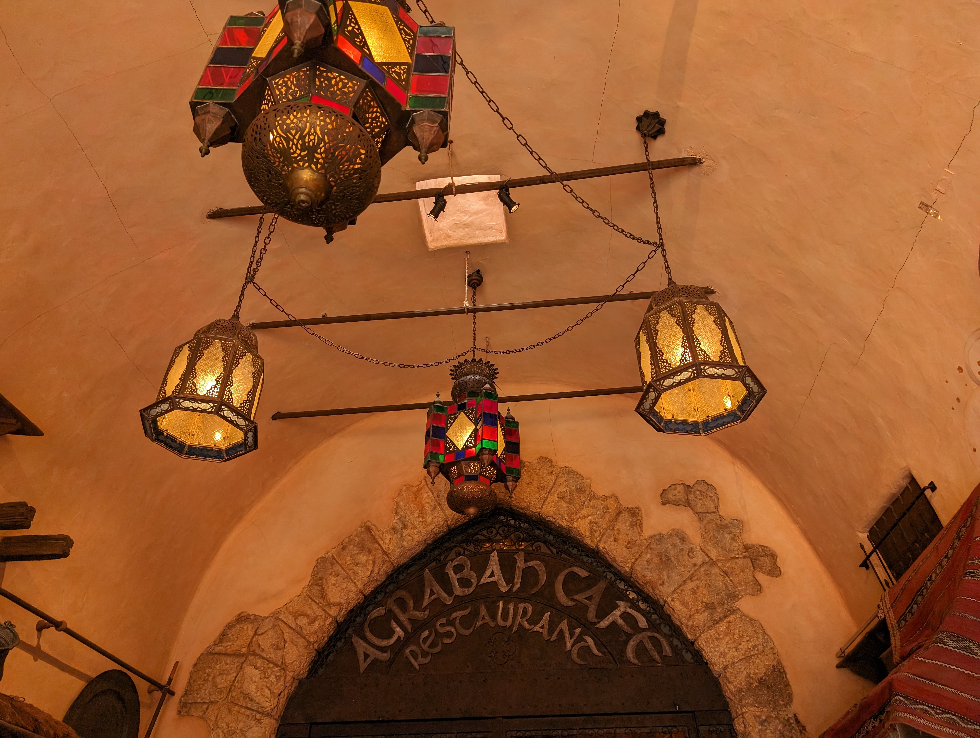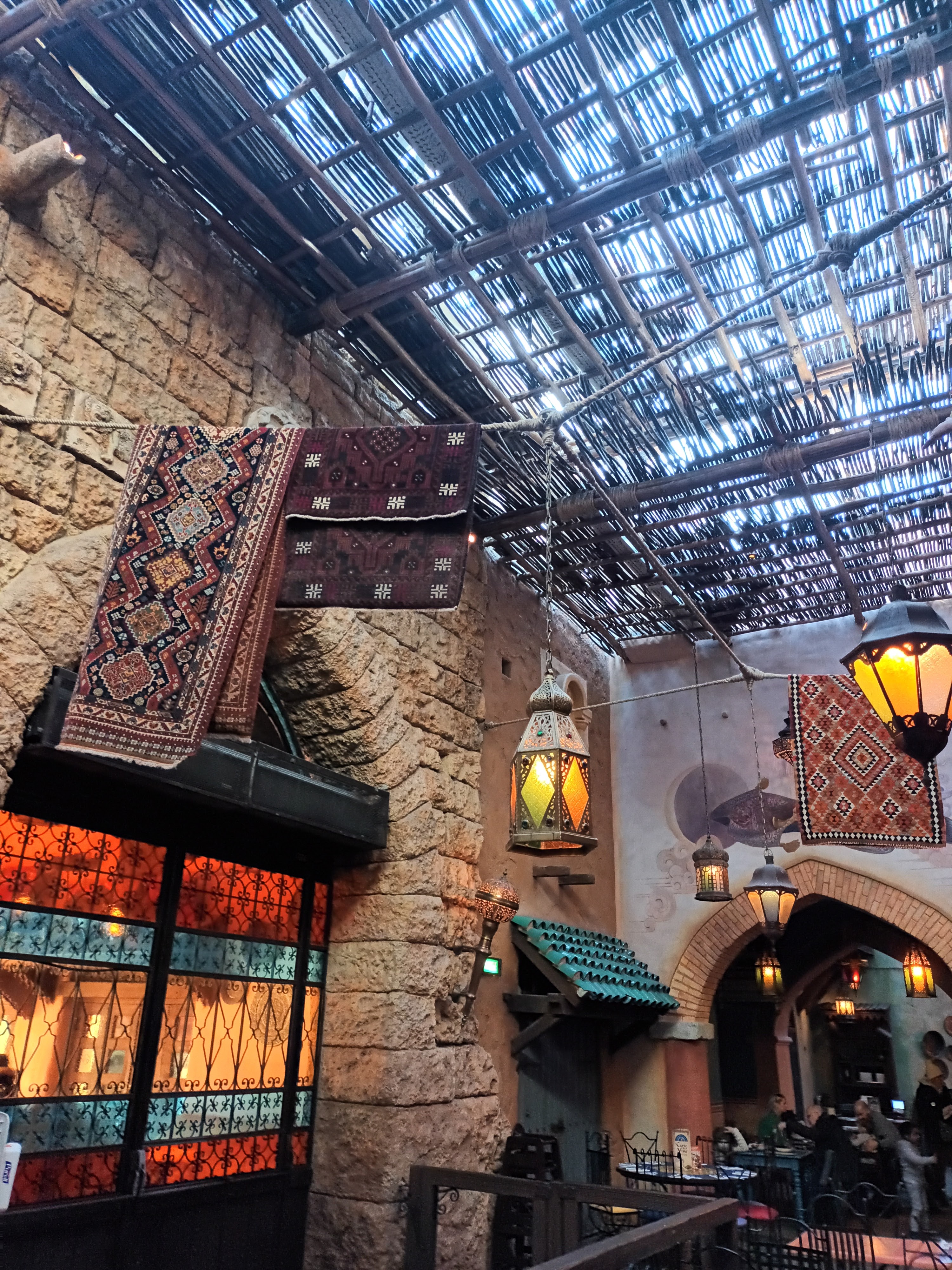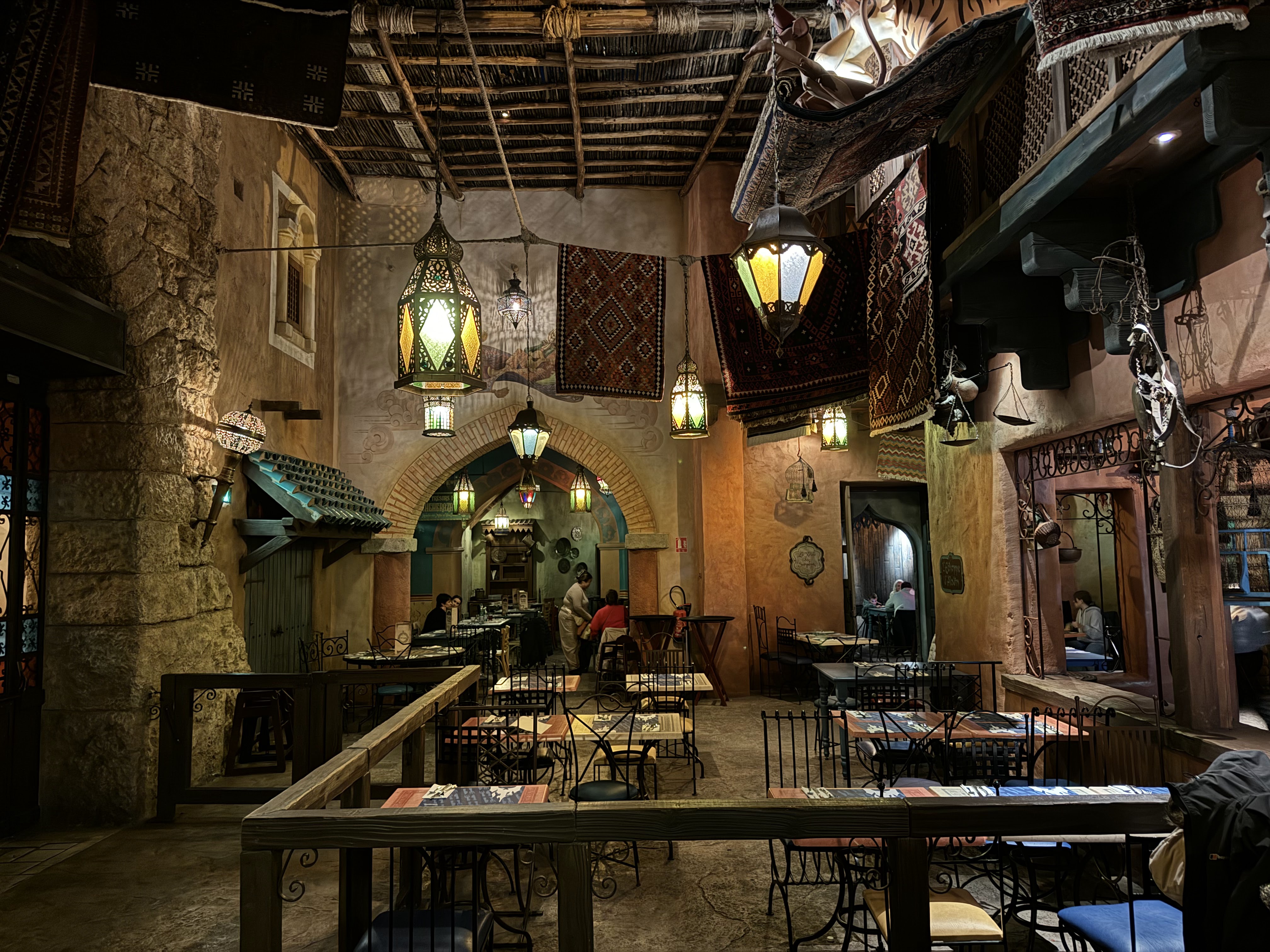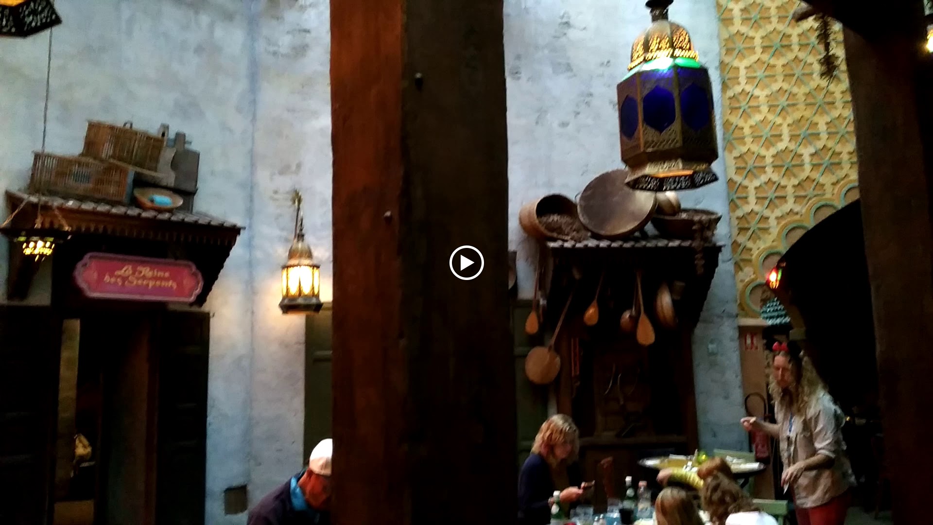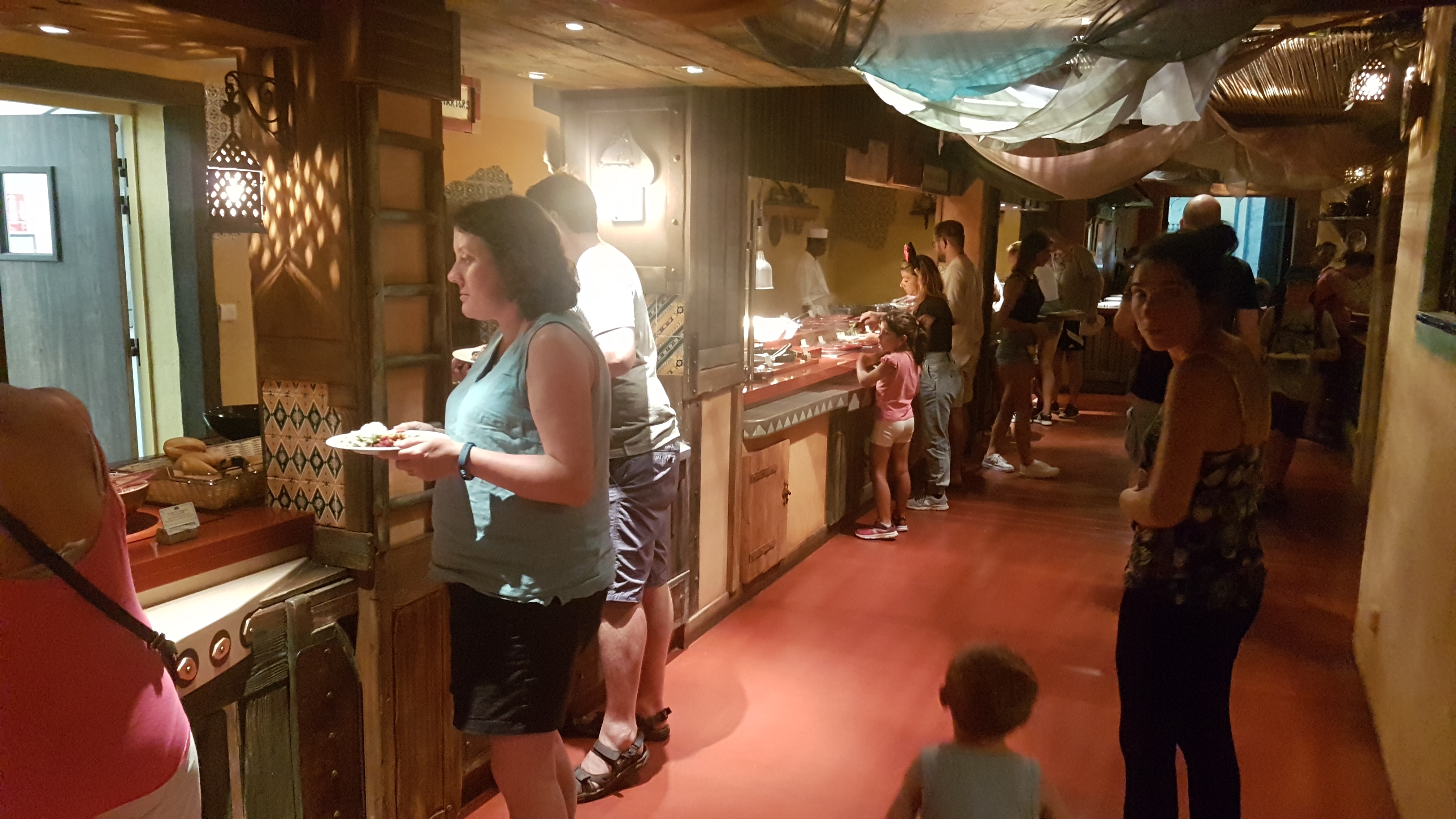 Buffet à volonté sur la thématique orientale. On y retrouve Kebab, Couscous, etc. Gustativement, c'est assez bon et varié, mais pas nécessairement en adéquation avec les tarifs pratiqués (Disney oblige…). Le cadre est joli et on en ressort répu; idéal pour se poser après une matinée de marche. Pensez à réserver pour éviter d'attendre parfois longtemps pour une table.